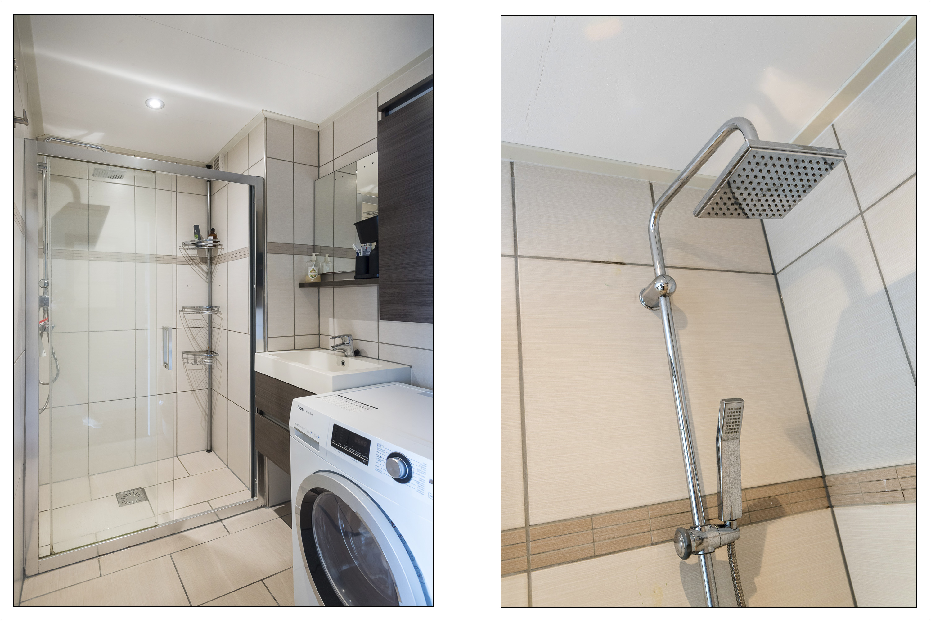 Vanuit de hal bereikt u de ouderslaapkamer, een vaste kast en de keurige, betegelde doucheruimte met douchecabine, thermostaatkraan, regendouche en handdouche, wastafelmeubel en wasmachineaansluiting.