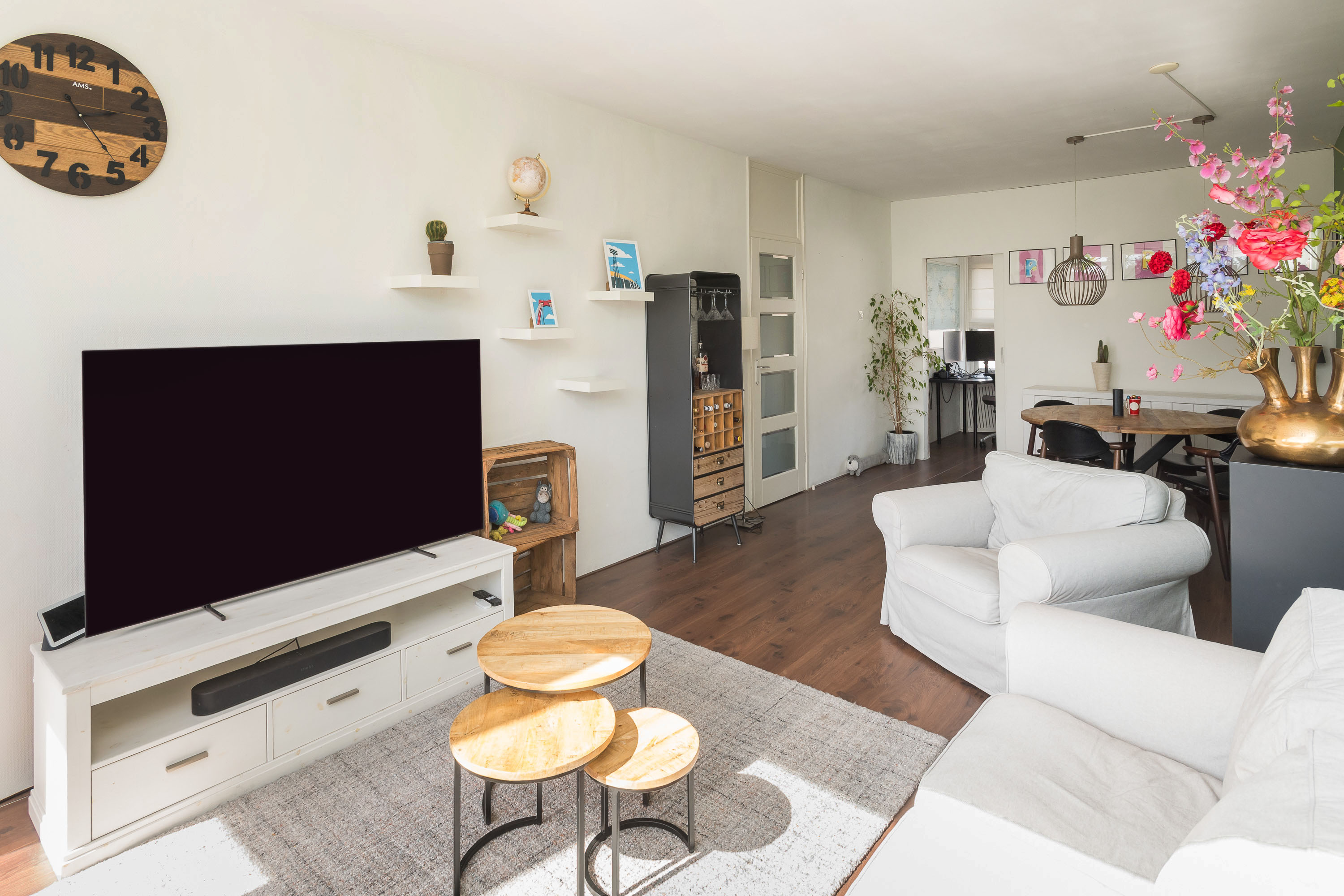 De woonkamer, hal, keuken en slaapkamers zijn allen voorzien van een laminaatvloer.