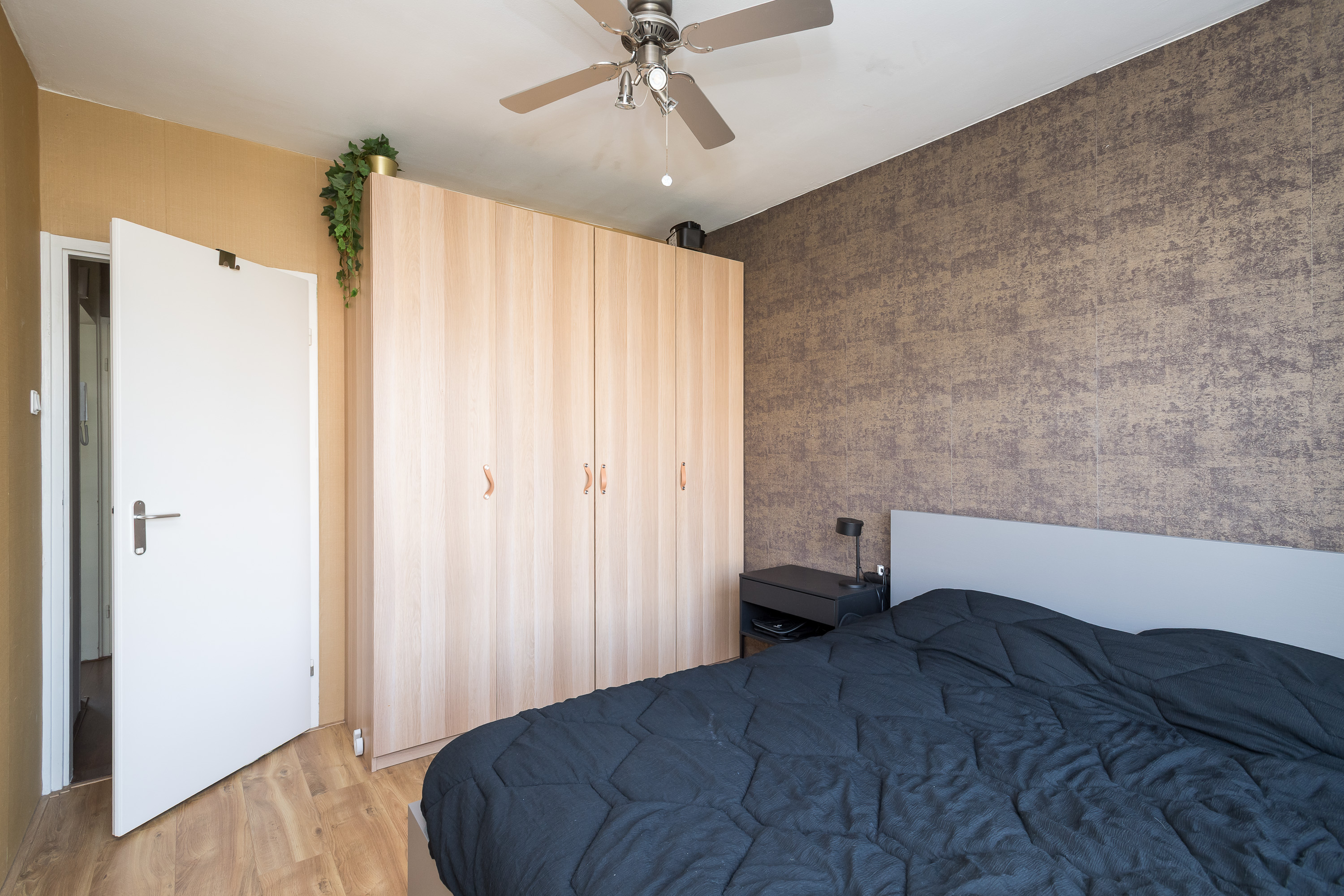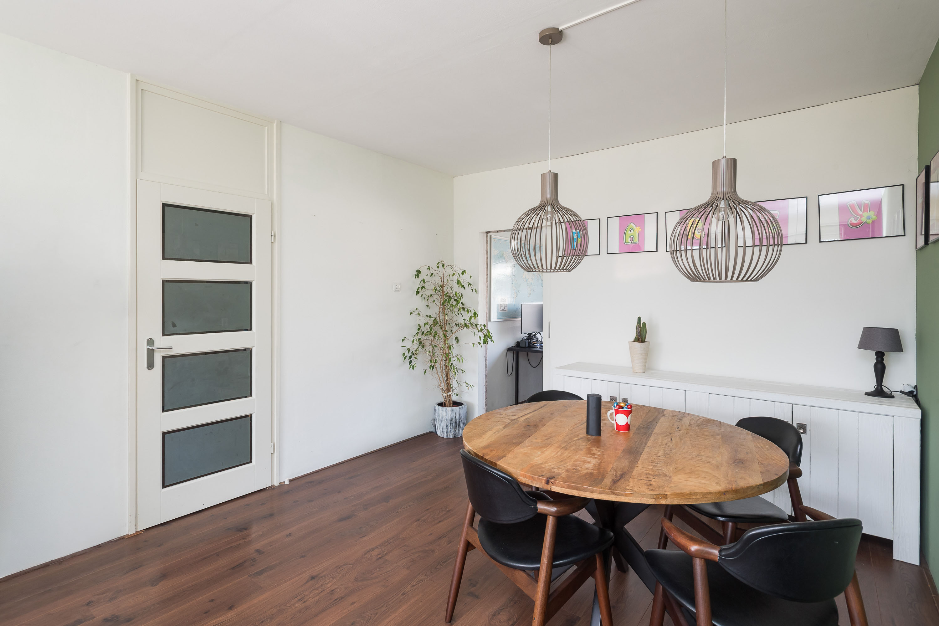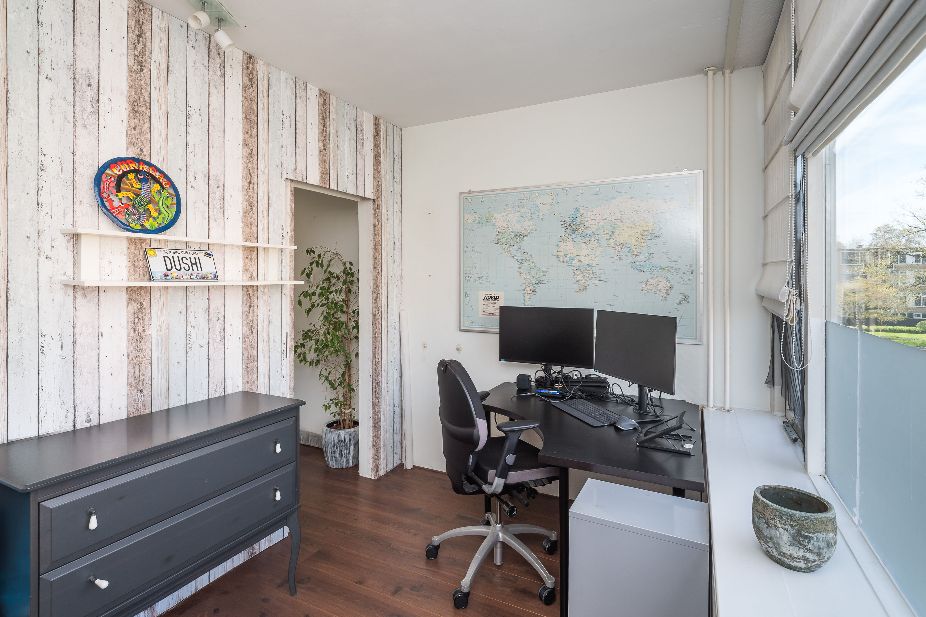 Entree, ruime hal met toegang tot alle vertrekken. Lichte, vergrote woonkamer met een laminaatvloer, mooi uitzicht (ook vanuit het zijraam) en een deur naar het balkon. Aangrenzend bevindt zich een werk-/slaapkamer aan de entreezijde.