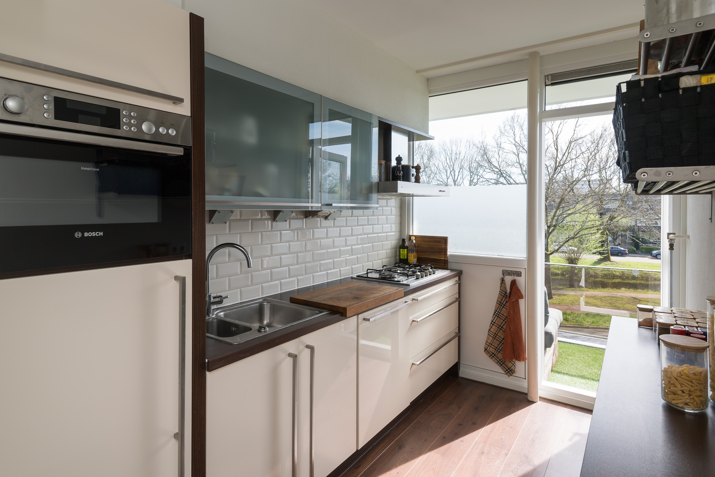 Nette, dichte keuken voorzien van een opstelling aan twee zijden en inbouwapparatuur, waaronder een vaatwasser, 5-pits gaskookplaat, afzuigkap, koelkast en combi-oven. Vanuit de keuken is er eveneens toegang tot het balkon.