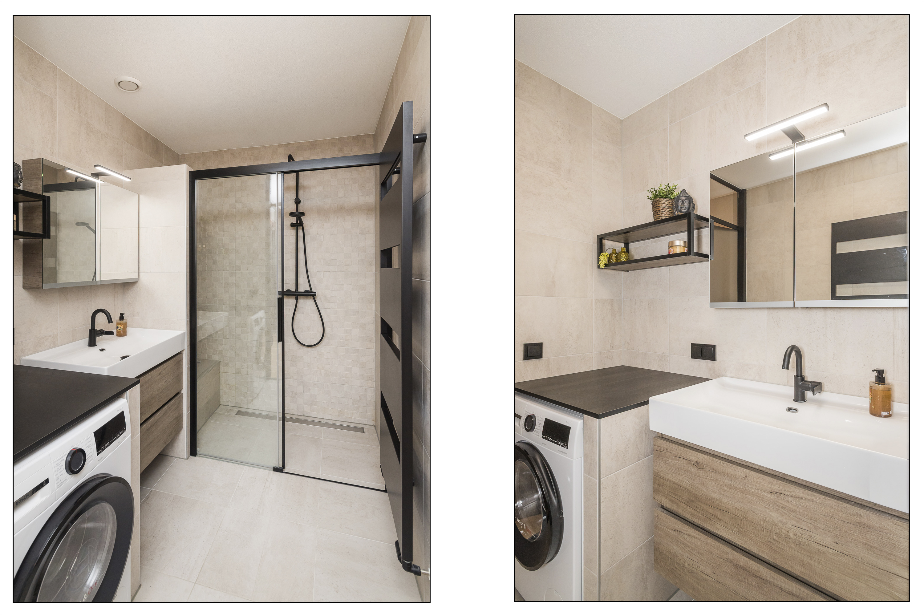 De moderne en luxe, geheel betegelde badkamer biedt een heerlijke inloopdouche met zwarte thermostaatkraan, regendouche en handdouche, een wastafelmeubel met spiegelkast en verlichting, een handdoekradiator en een aansluiting voor de wasmachine.
