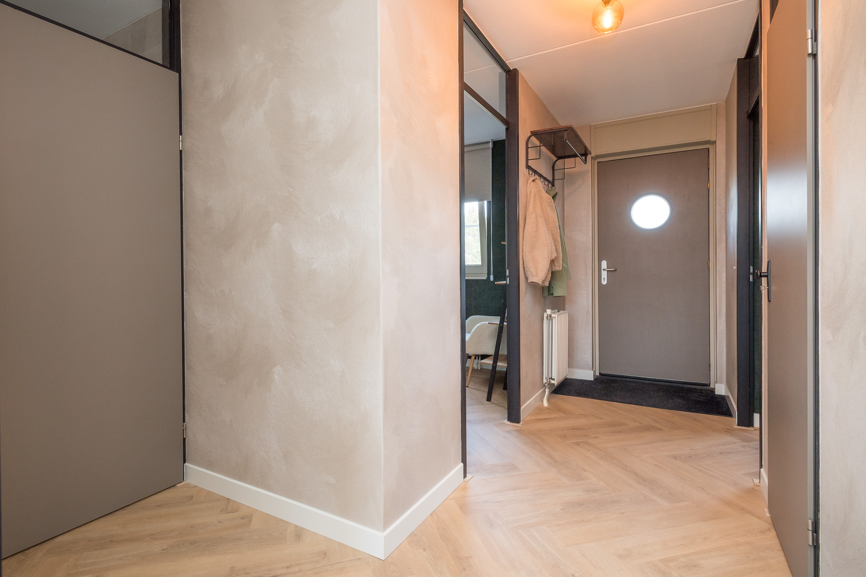 Entree, hal met meterkast en toegang tot alle vertrekken in het appartement. Via een moderne deur met glas bereikt u de gezellige en lichte woonkamer met een open keuken, die toegang biedt tot het zonnebalkon, dat is voorzien van een mooie vloerbekleding.