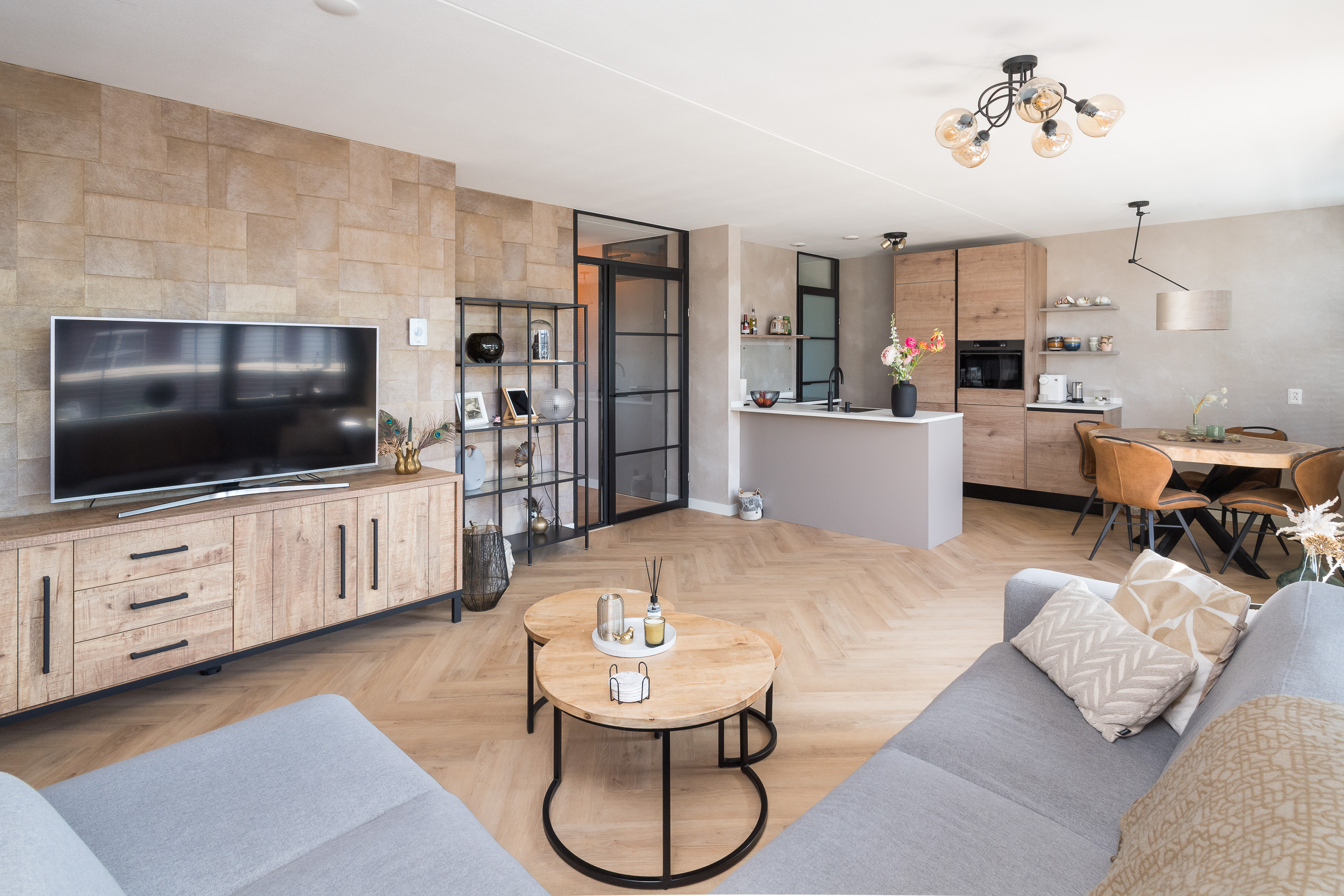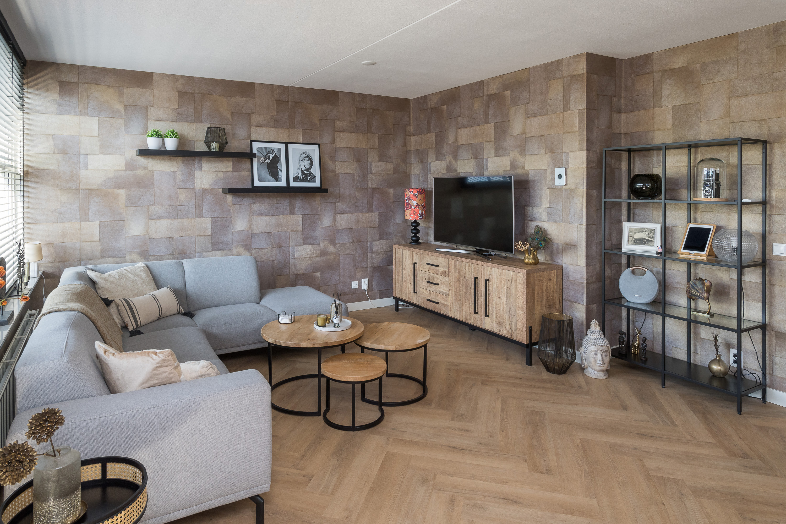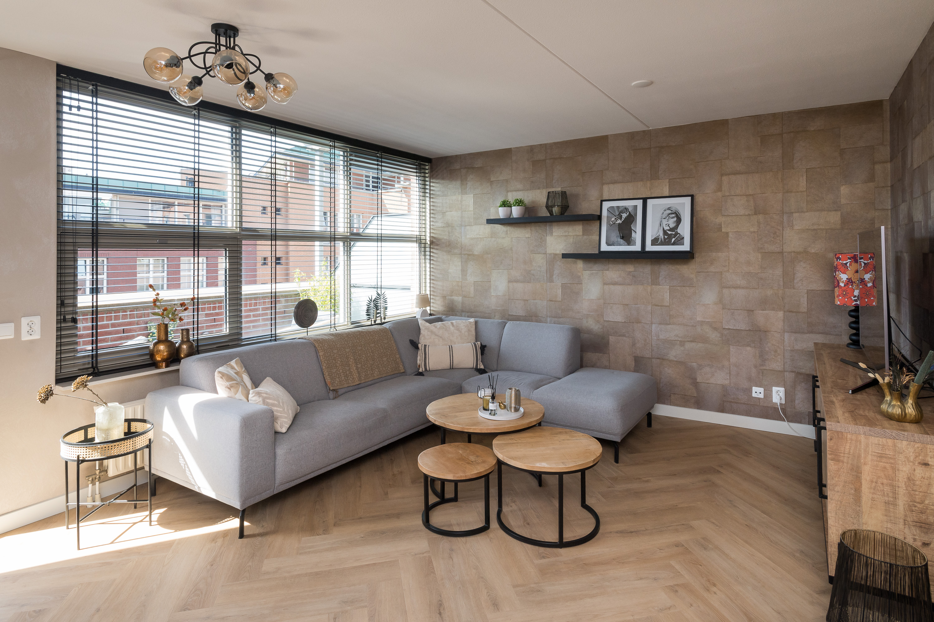 De hal, woonkamer en slaapkamers zijn voorzien van een sfeervolle, doorlopende pvc-visgraatvloer.