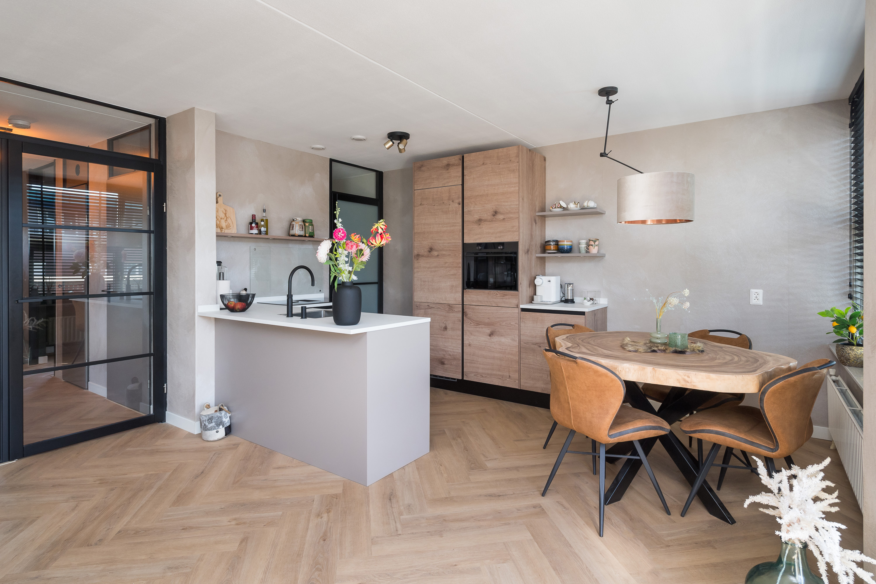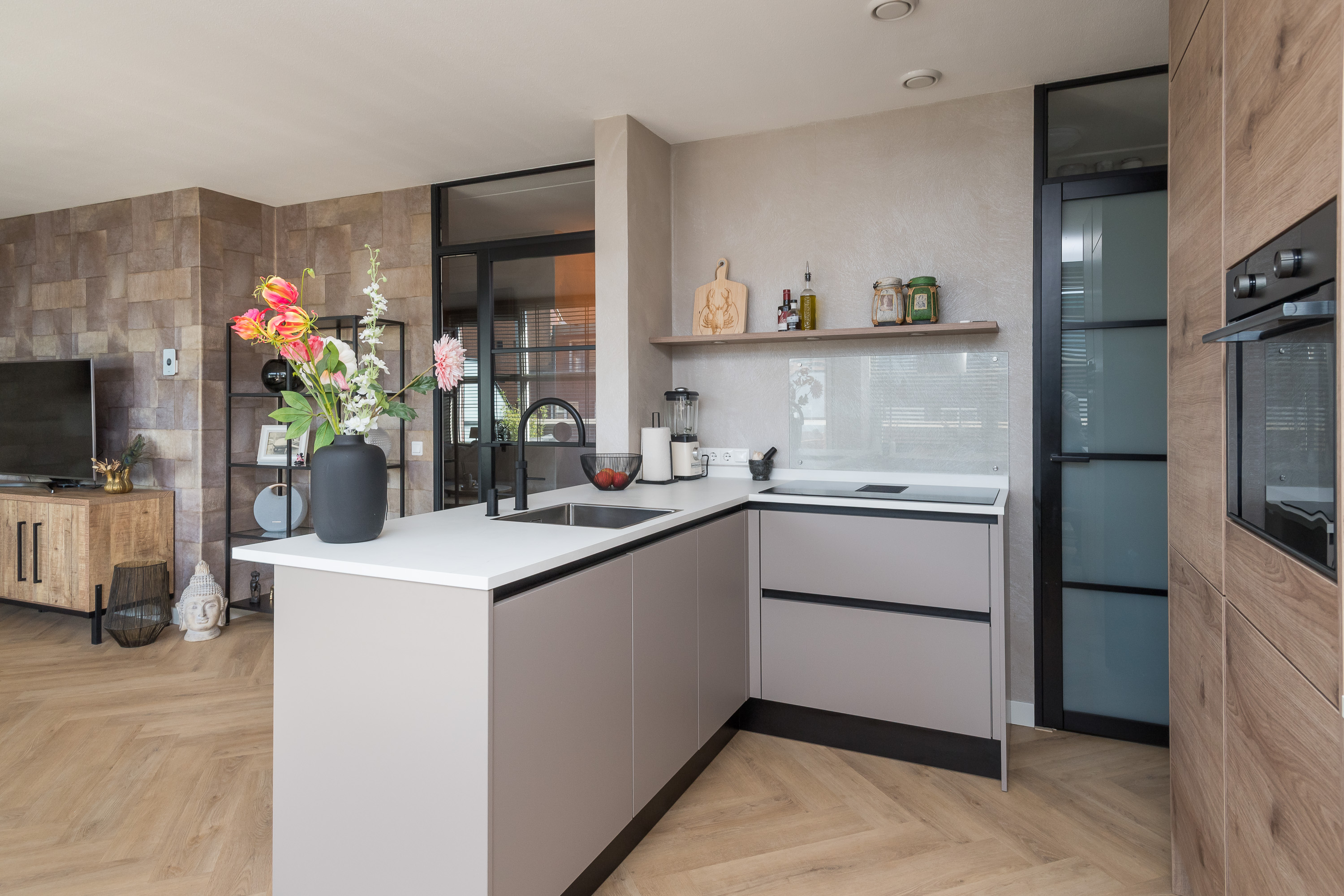 De luxe open keuken is uitgevoerd met een hoekopstelling/schiereiland en een separate wandunit. Het eiland beschikt over een Quooker, spoelbak en inbouwapparatuur, waaronder een vaatwasser en een inductiekookplaat met geïntegreerde afzuiging. Daarnaast vindt u in de wandopstelling een inbouwkoelkast, vriezer, combi-oven en een koffiecorner. Vanuit de keuken heeft u toegang tot de cv-ruimte met opstelling van de cv-ketel.