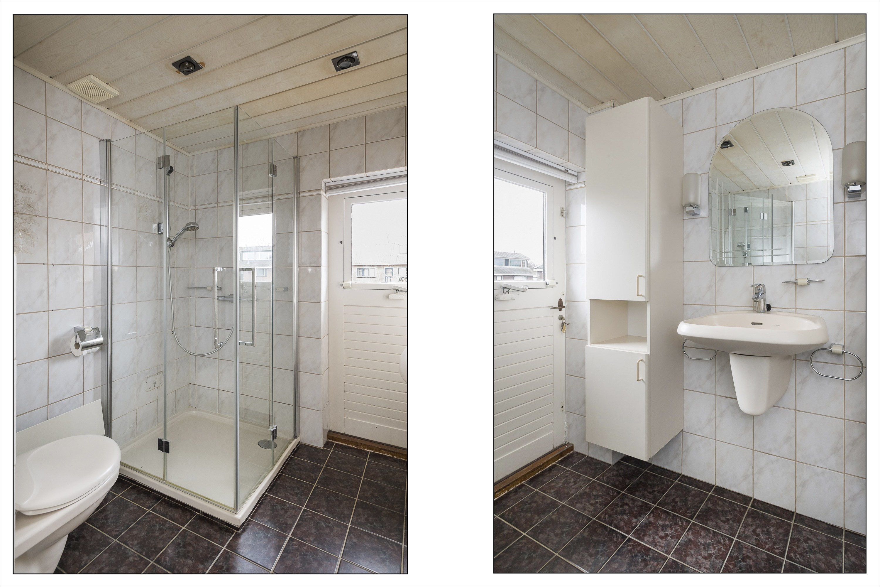 De betegelde badkamer, gelegen aan de achterzijde, is voorzien van een douchecabine met thermostaatkraan, een vaste wastafel met spiegel en meubel, een tweede toilet, een uitzetraam en een deur naar het balkon.