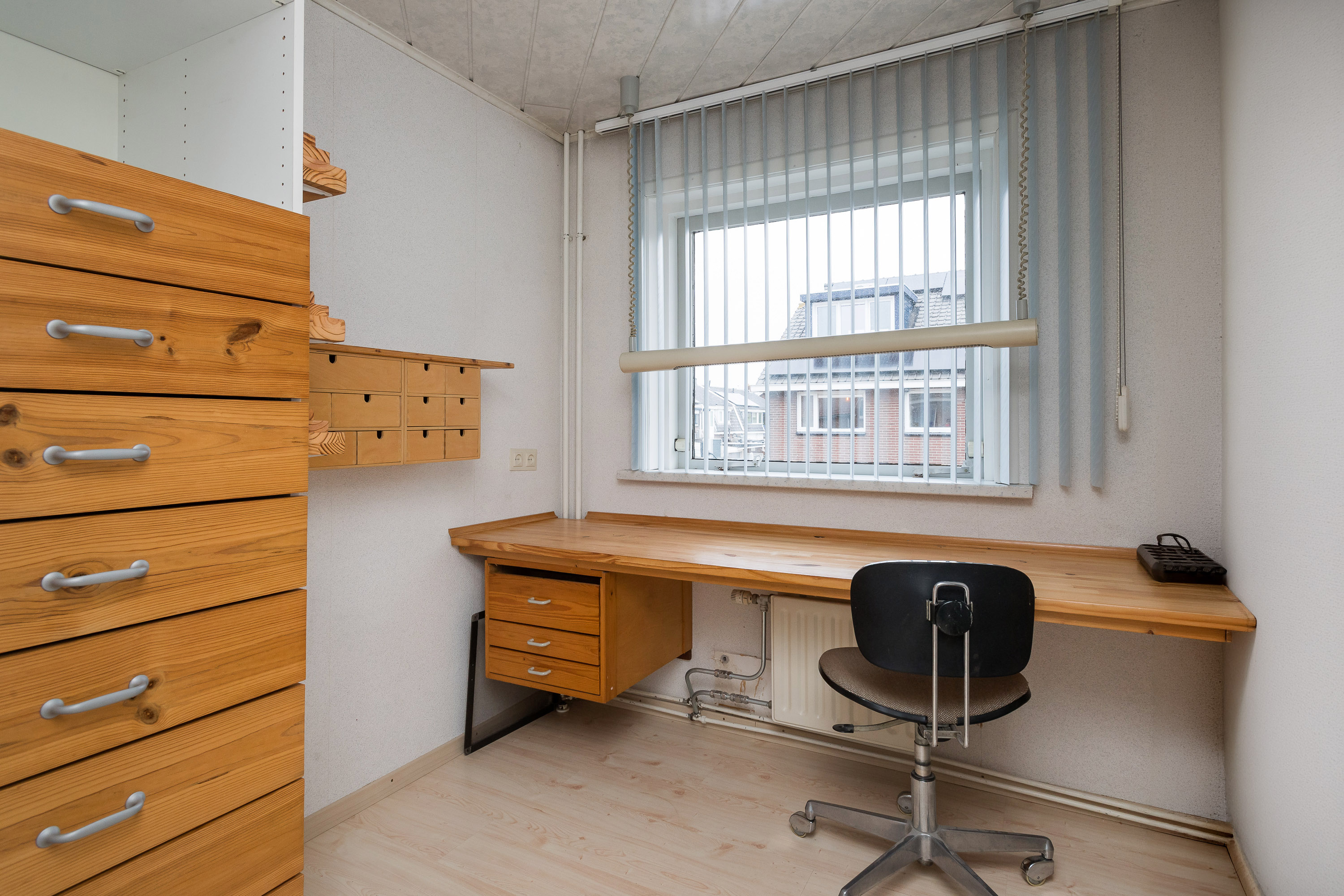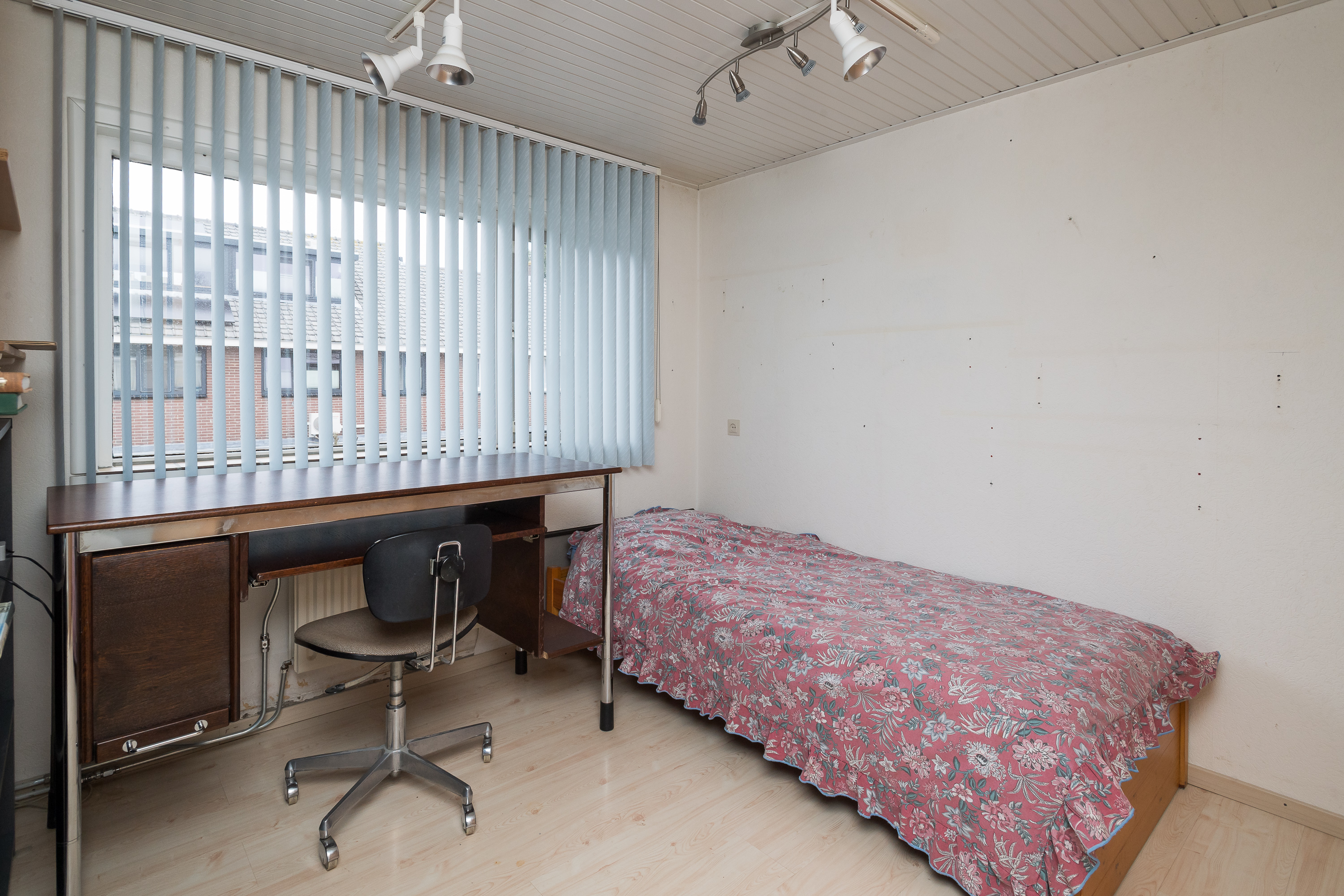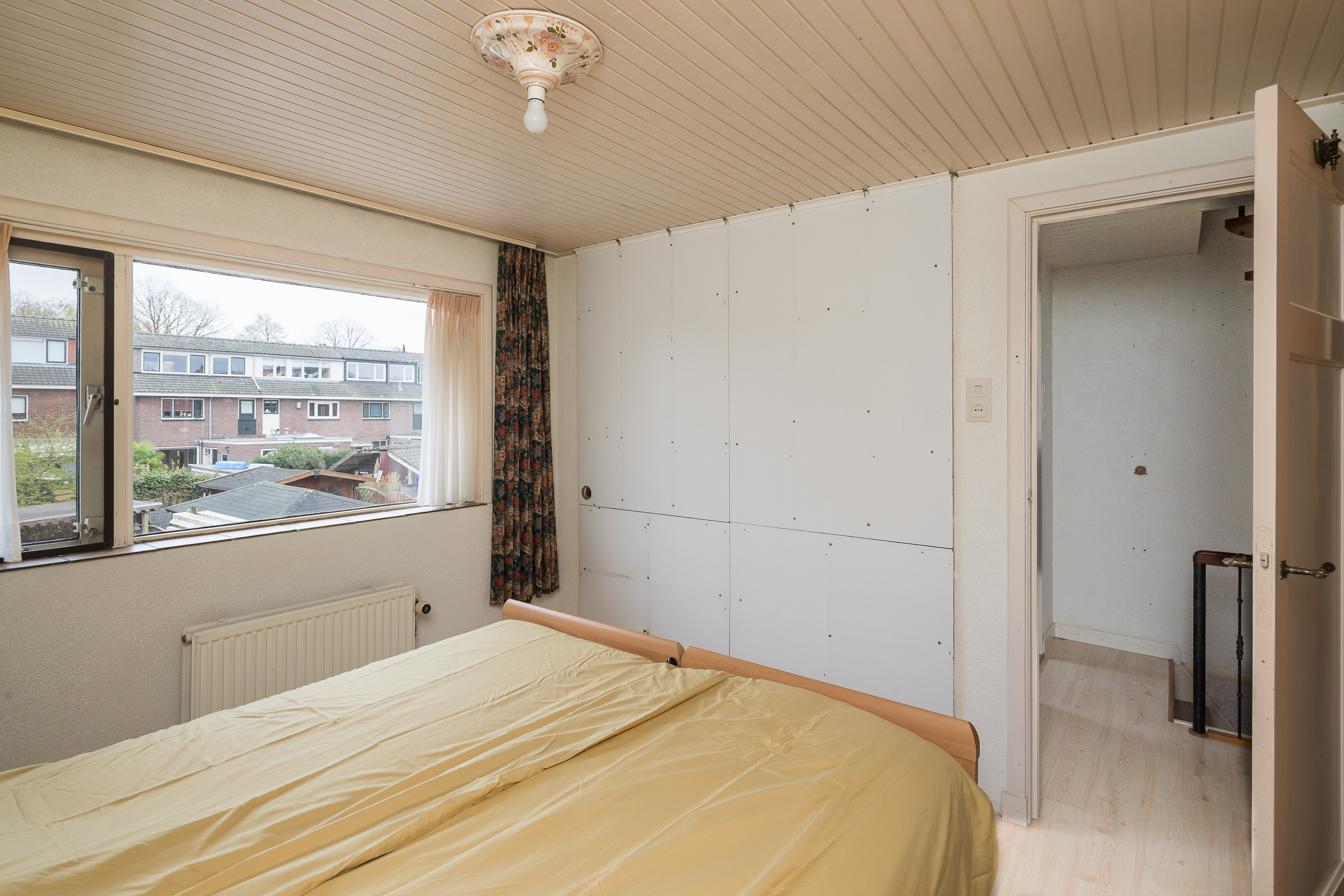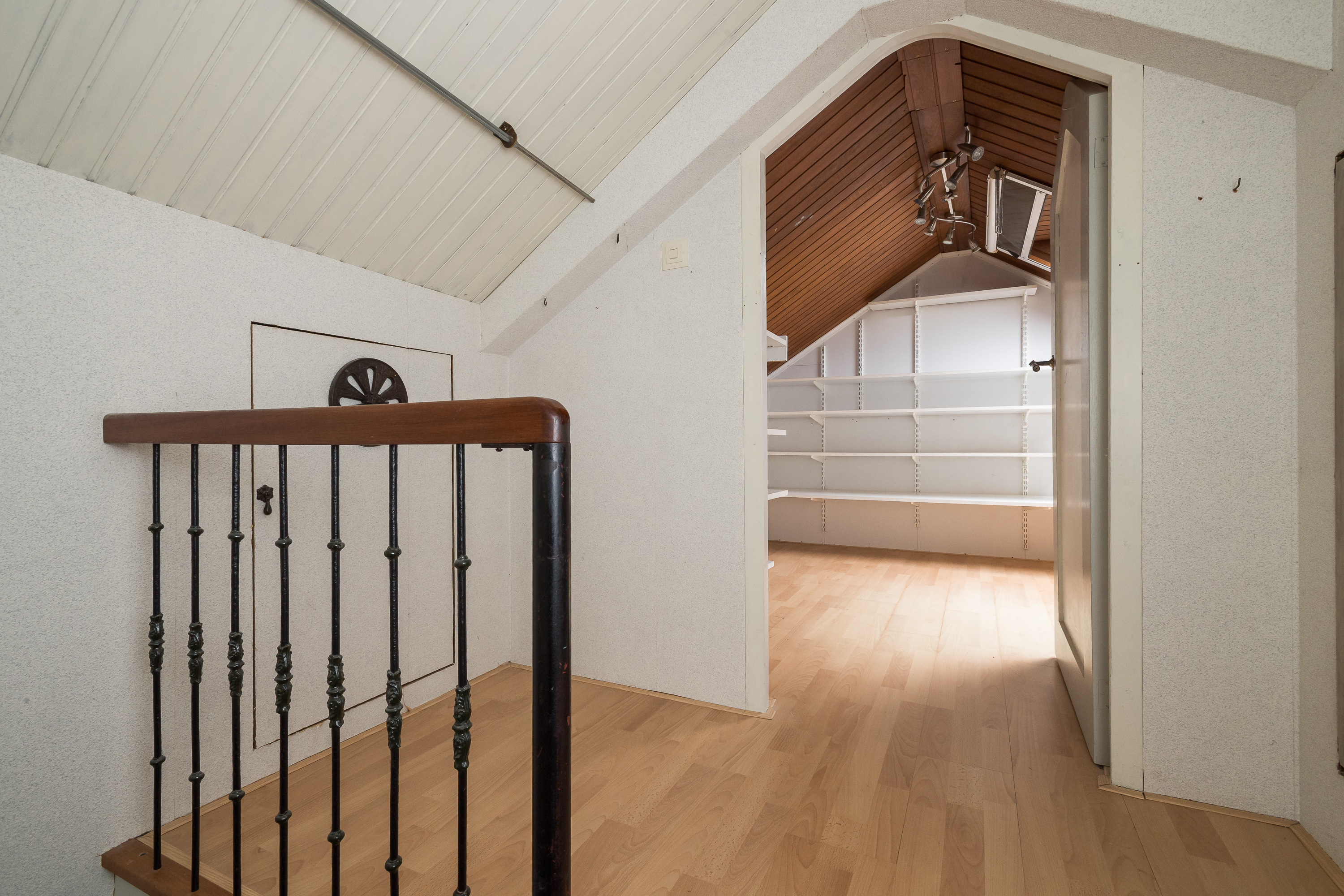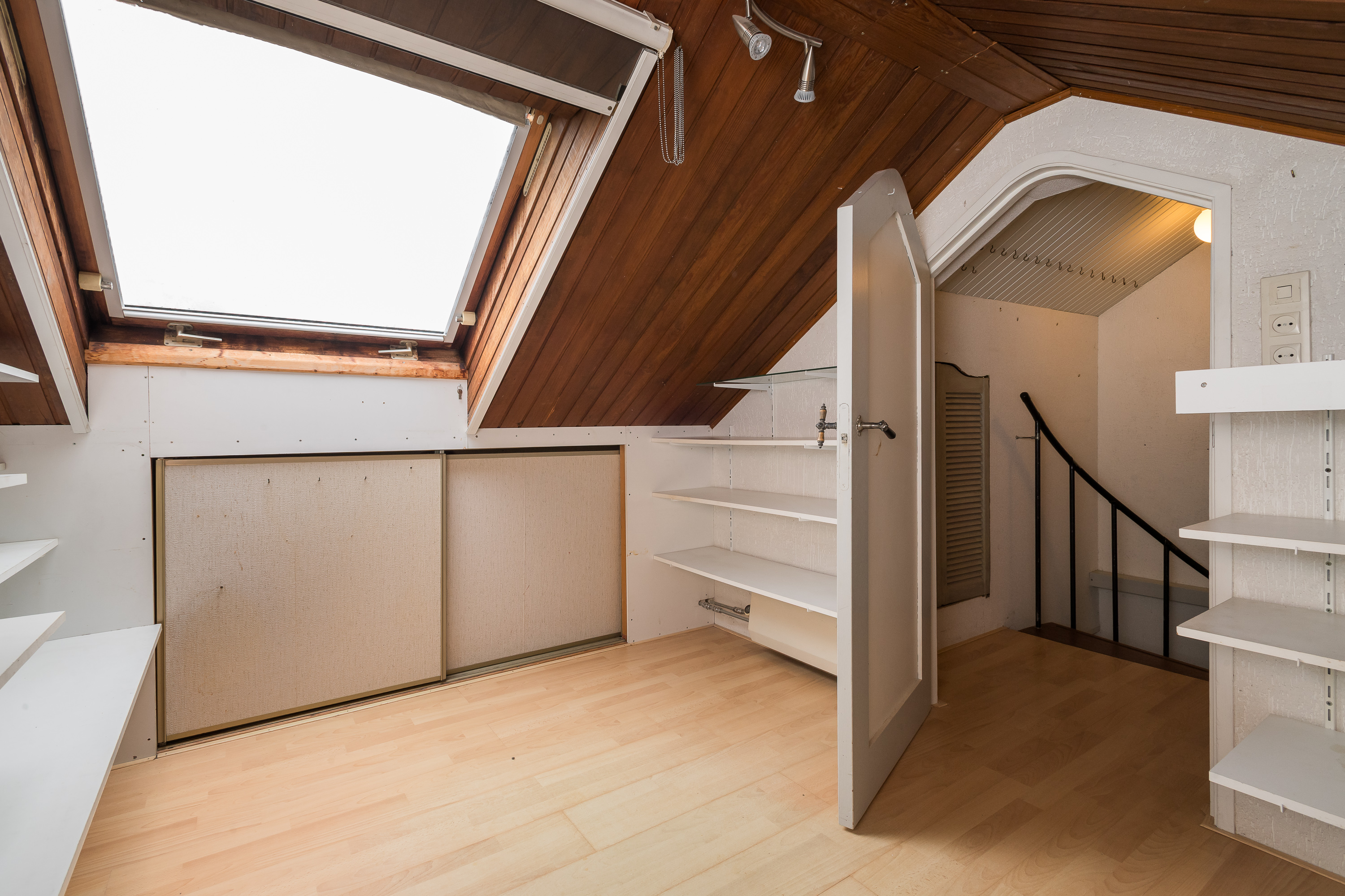 Overloop met bergruimte achter de knieschotten en toegang tot de vierde slaapkamer. De slaapkamer is eveneens voorzien van bergruimte achter de knieschotten en een groot dakraam.