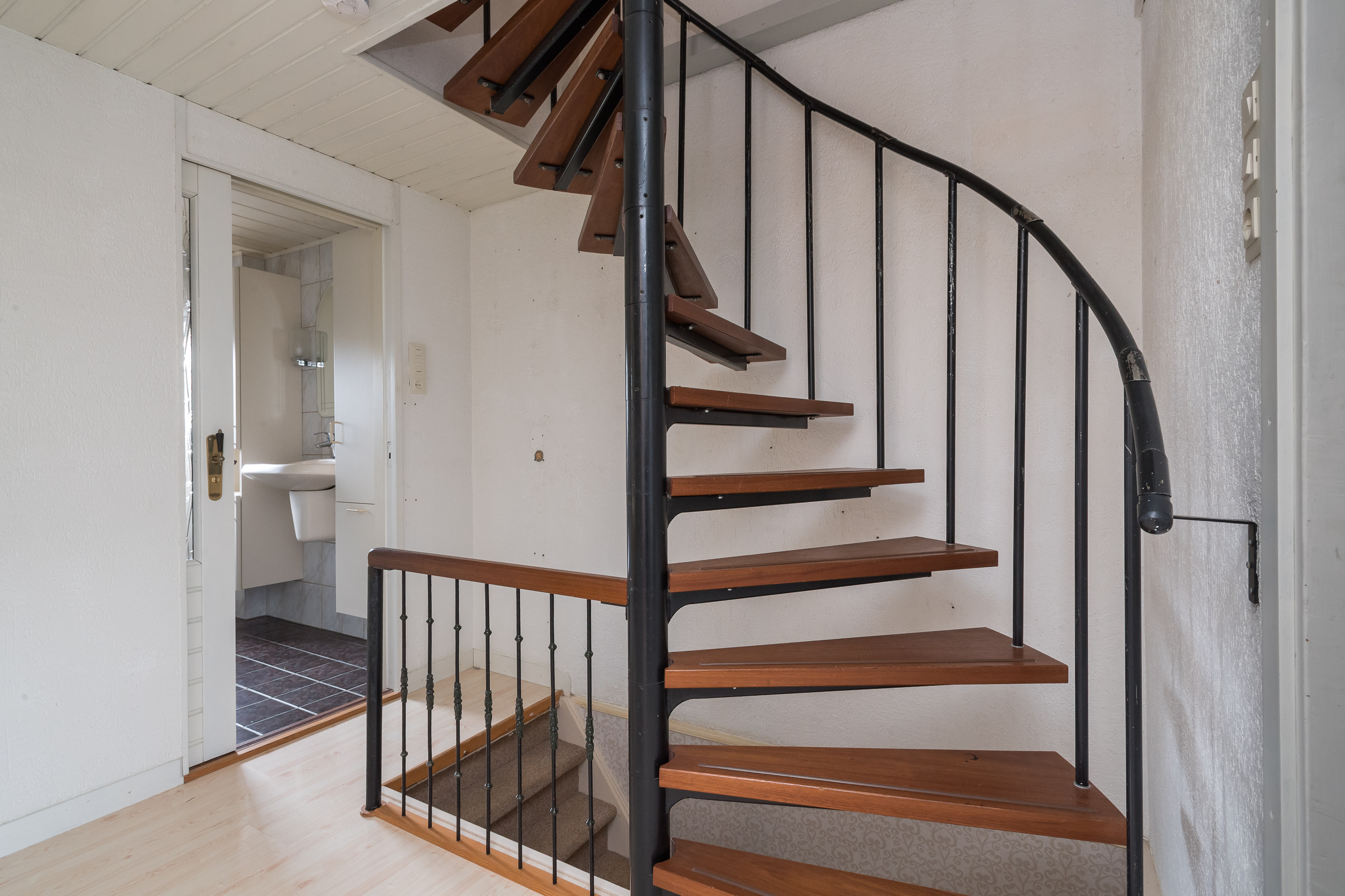 Overloop met wenteltrap naar de tweede verdieping en toegang tot drie slaapkamers, allen voorzien van een laminaatvloer, waarvan één met een vaste kastenwand.
