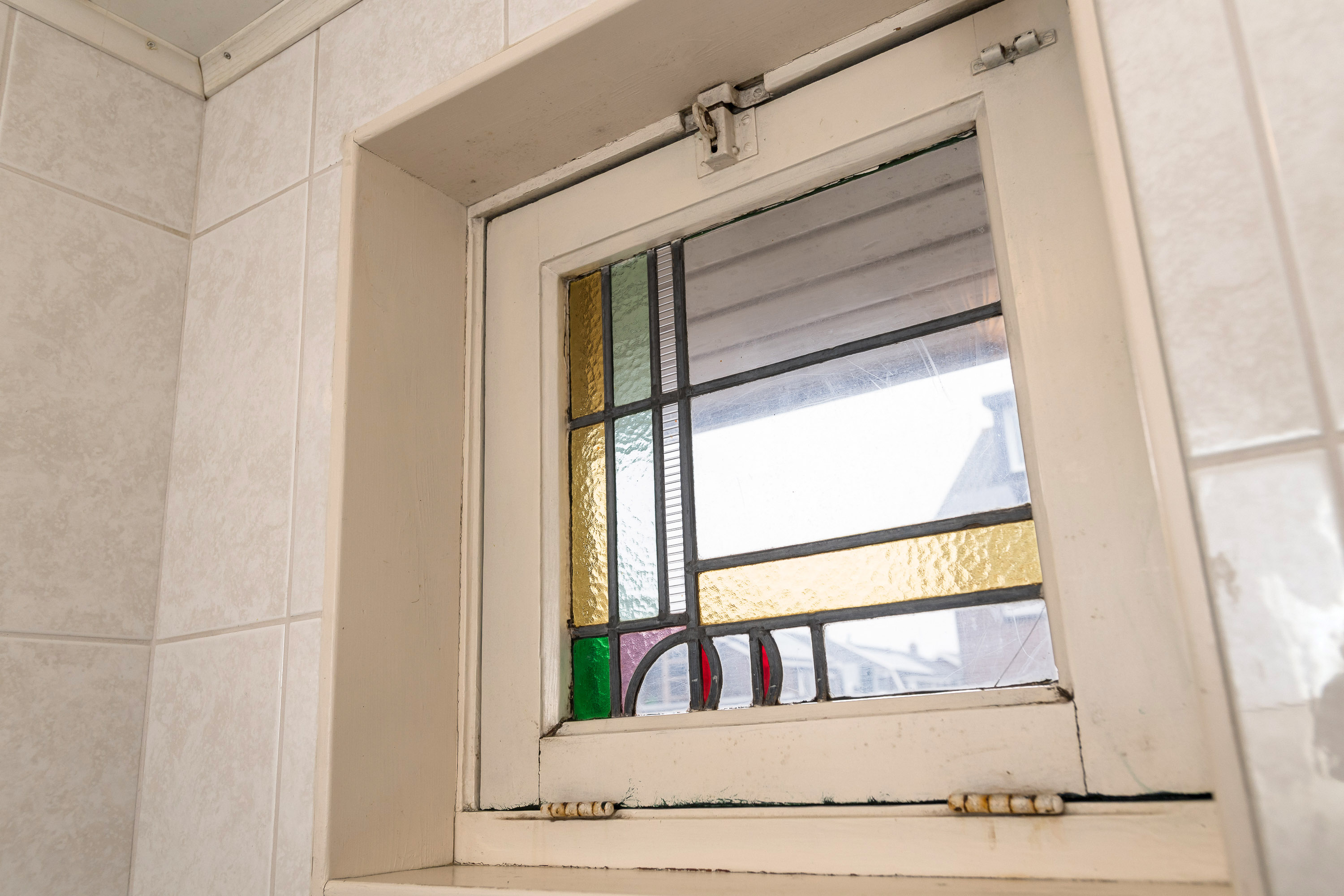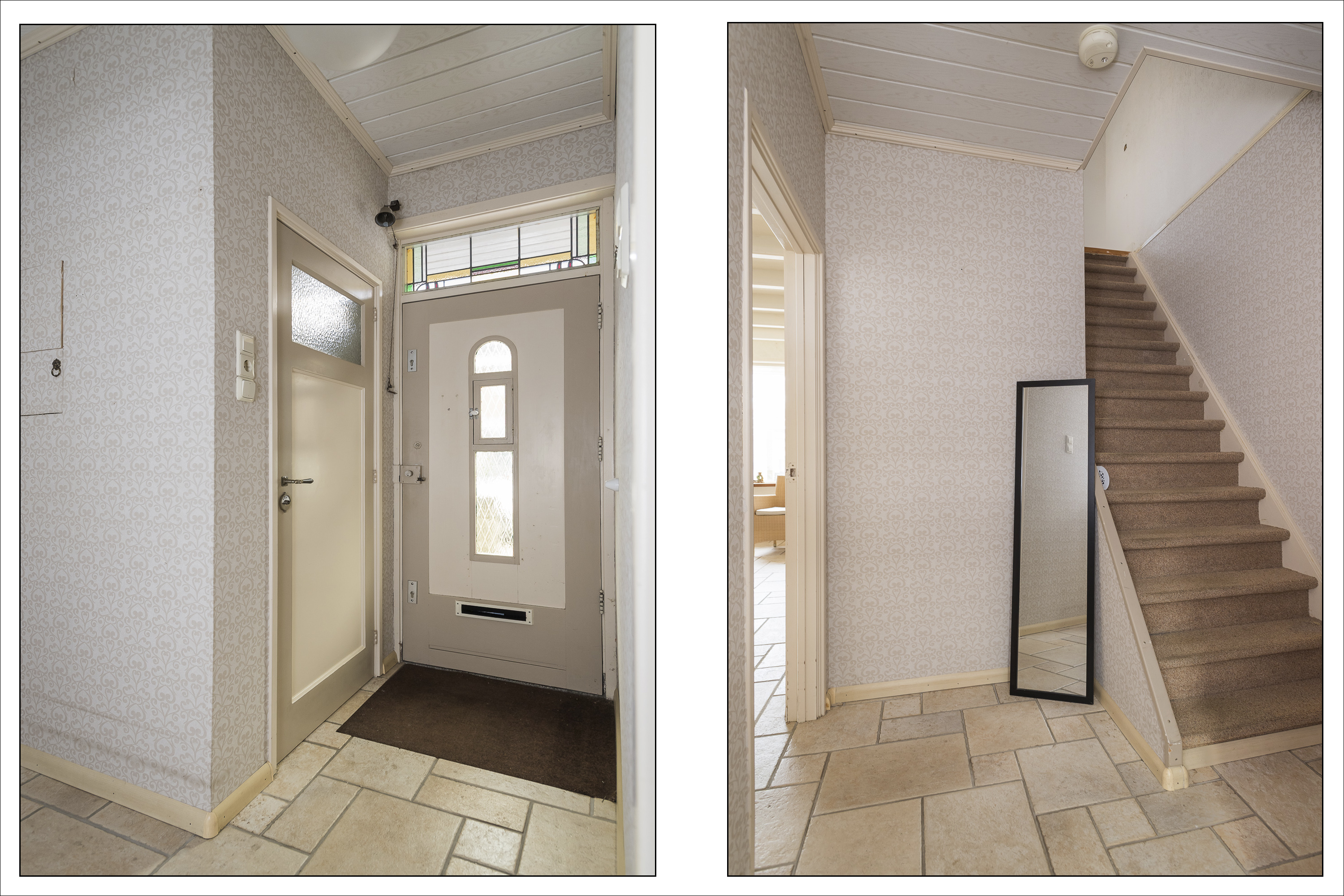 Entree met trapopgang naar de eerste verdieping en toegang tot de toiletruimte met fonteintje. De woonkamer is voorzien van een erker met glas-in-lood, een tegelvloer met vloerverwarming en een deur naar een verdiepte kelderkast met veel opbergruimte.