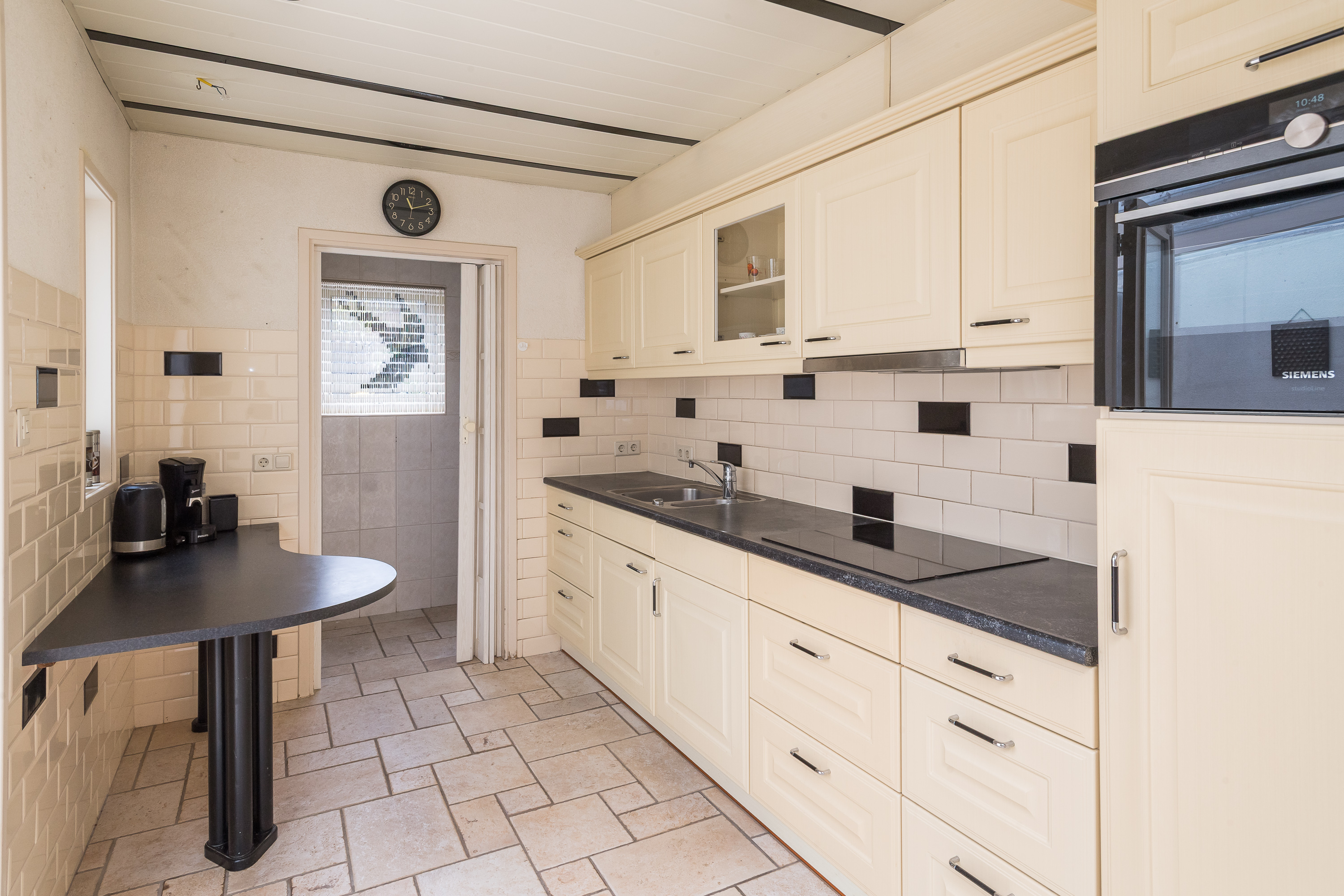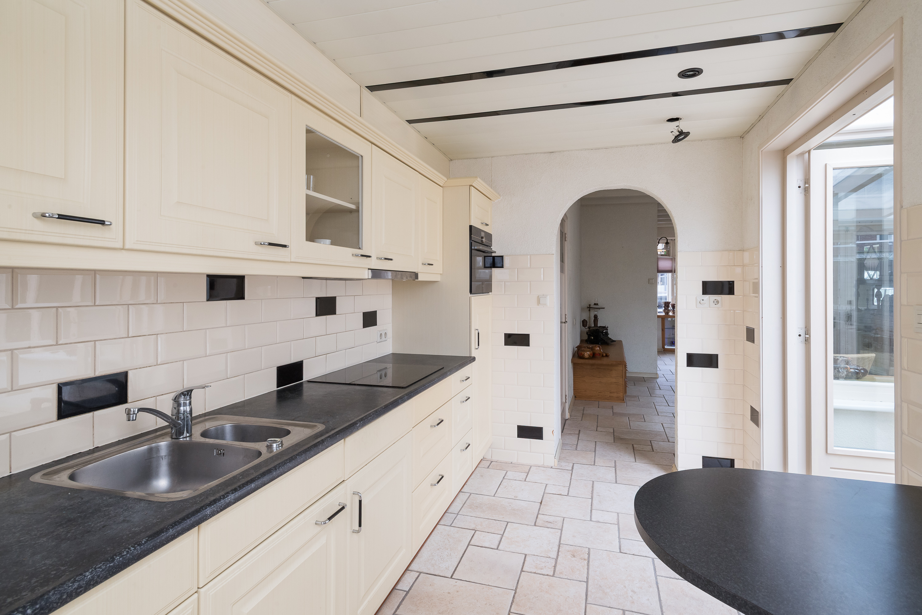 De open keuken aan de achterzijde is ingericht in een rechte opstelling met diverse inbouwapparatuur, waaronder een afzuigkap, combi-oven, koelkast en close-in boiler. De wanden zijn deels betegeld met wit-zwarte metrotegels en de tegelvloer met vloerverwarming loopt door vanuit de woonkamer.
