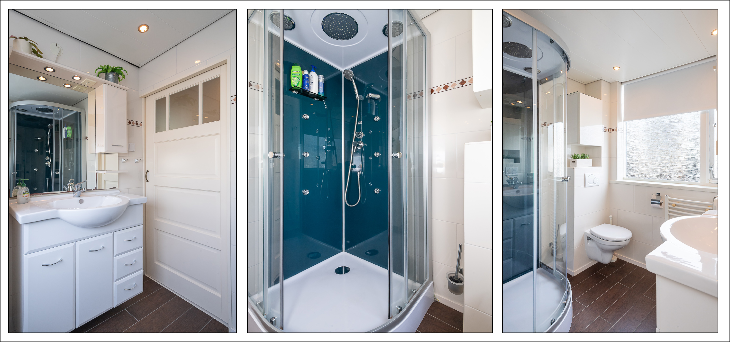 Geheel betegelde badkamer met douchecabine met regendouche en handdouche, wastafel met wastafelmeubel met spiegel en verlichting, 2e toilet en handdoeken radiator.