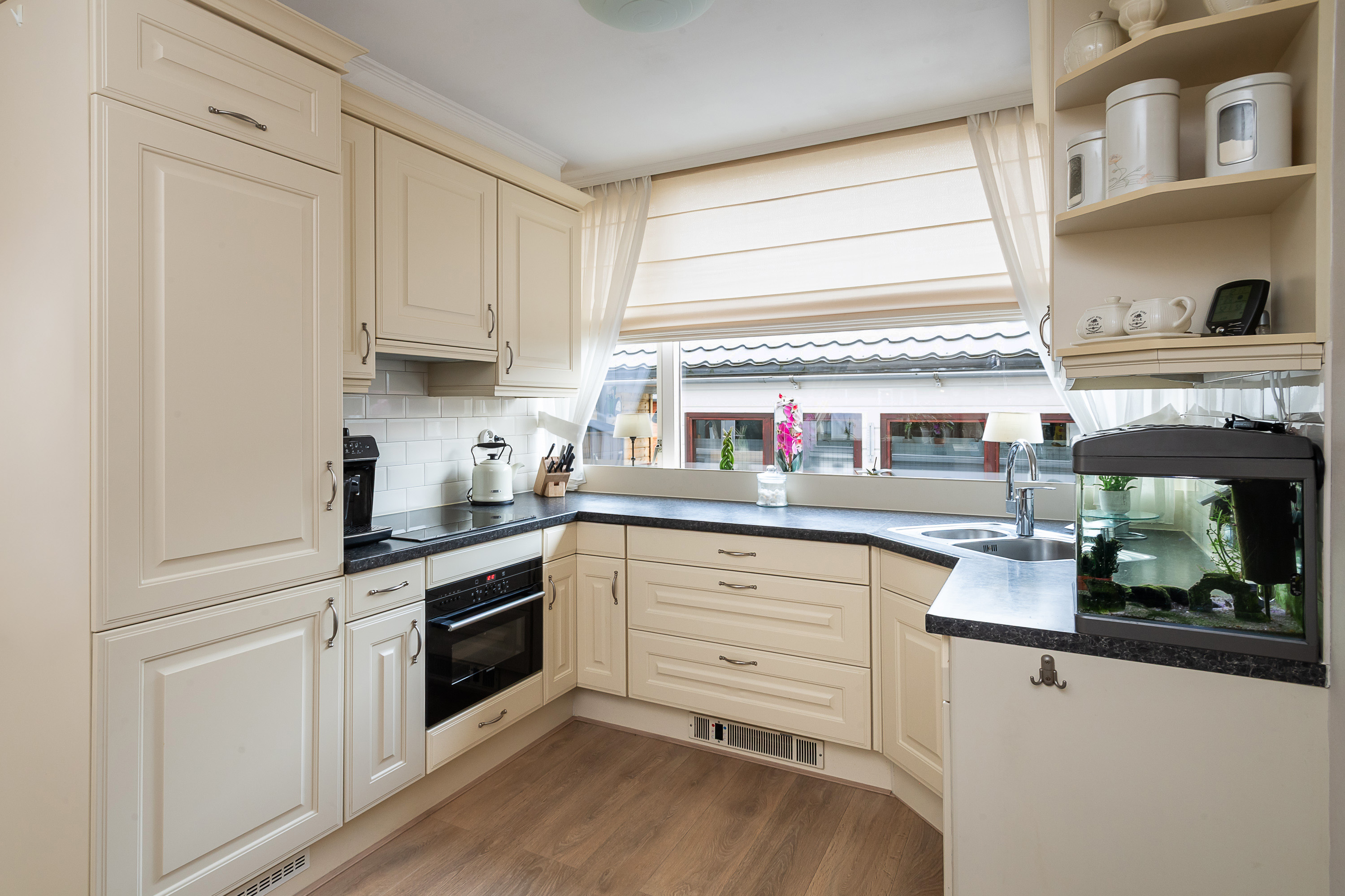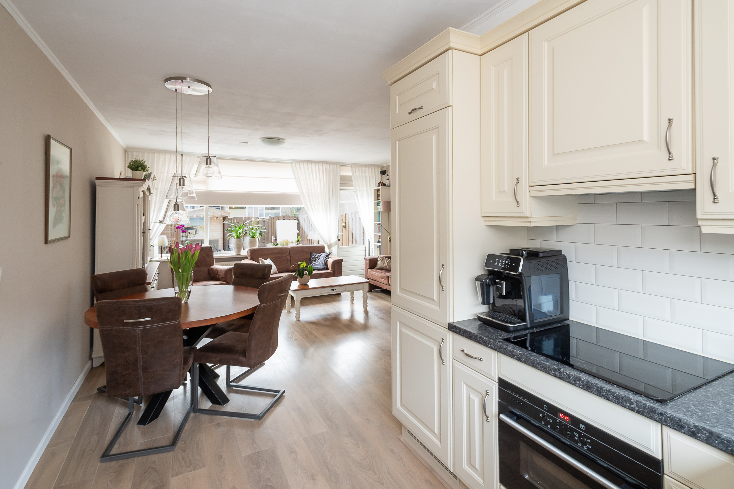 Open keuken in hoekopstelling voorzien inbouwapparatuur waaronder een inductiekookplaat, combi-oven, koelkast, vriezer en vaatwasser (Siemens). Close-in boiler en kickspace (plintverwarming).
