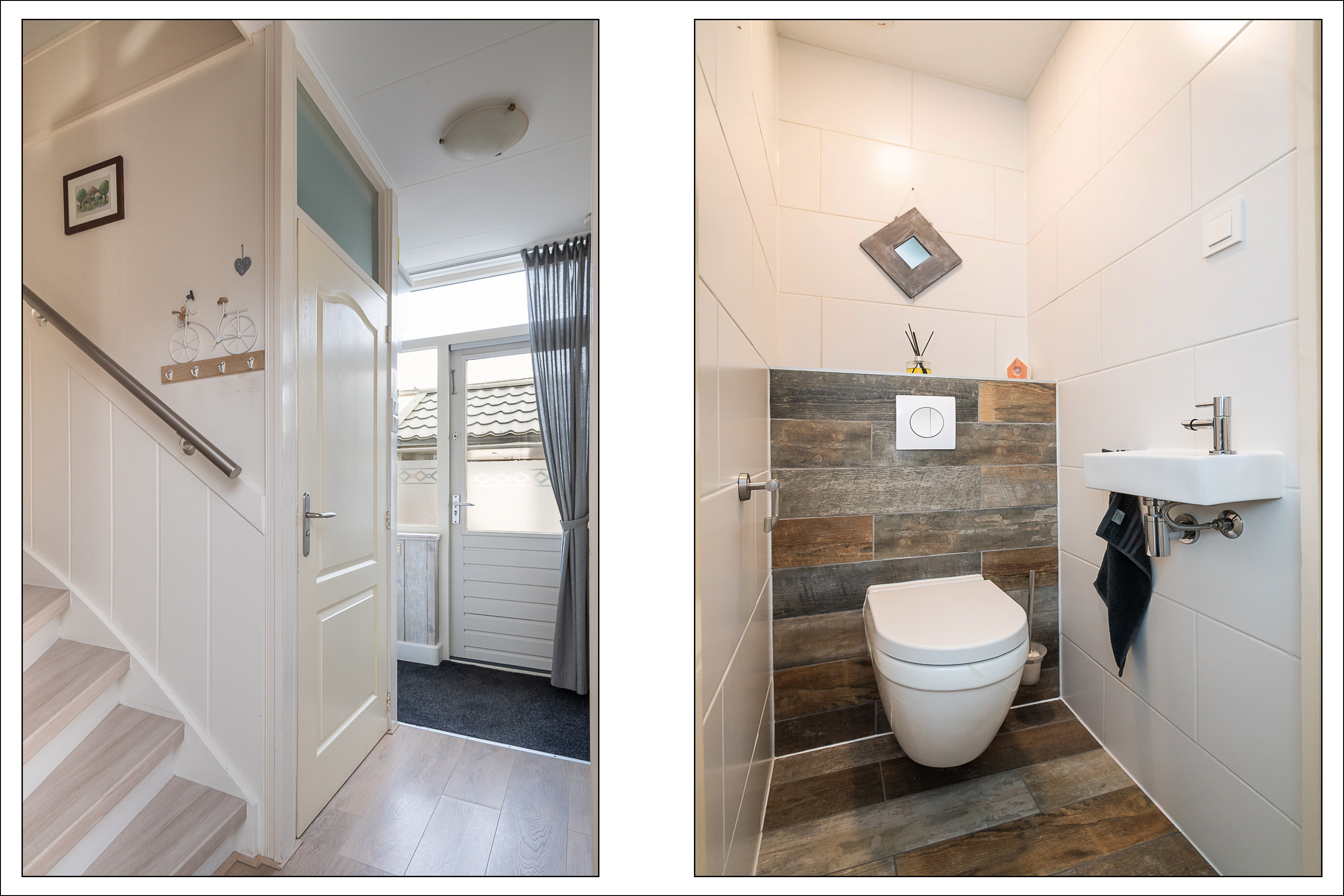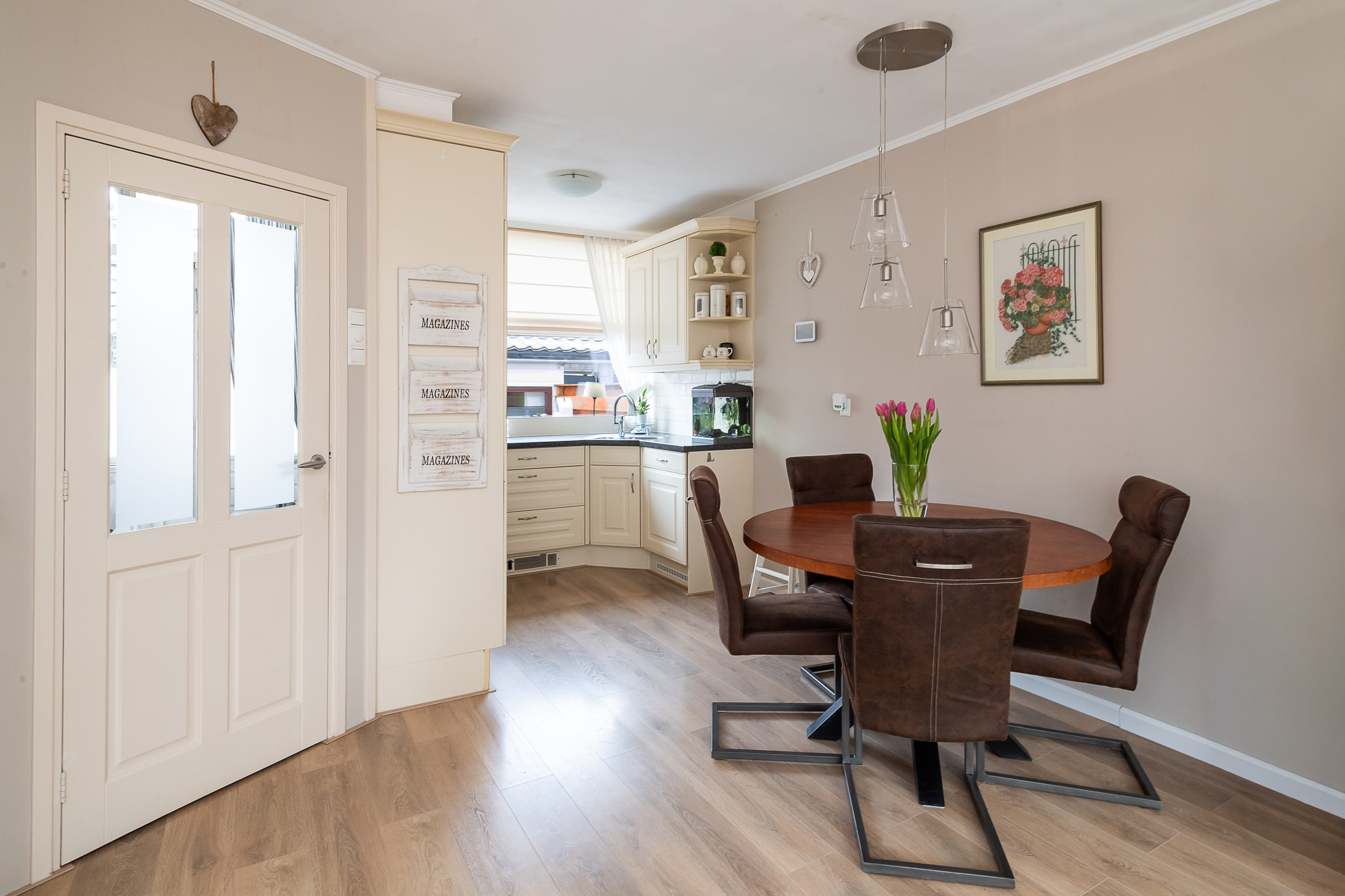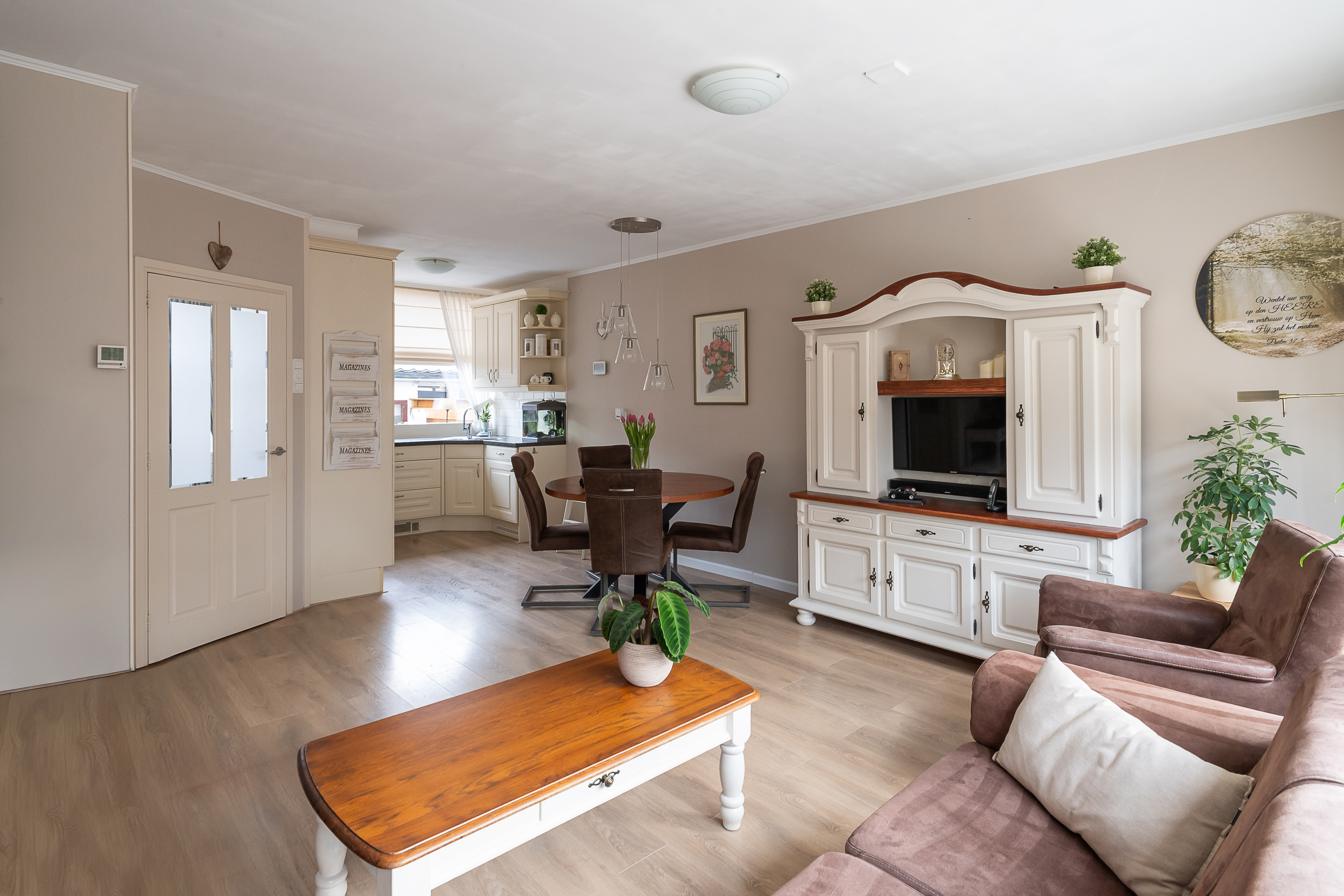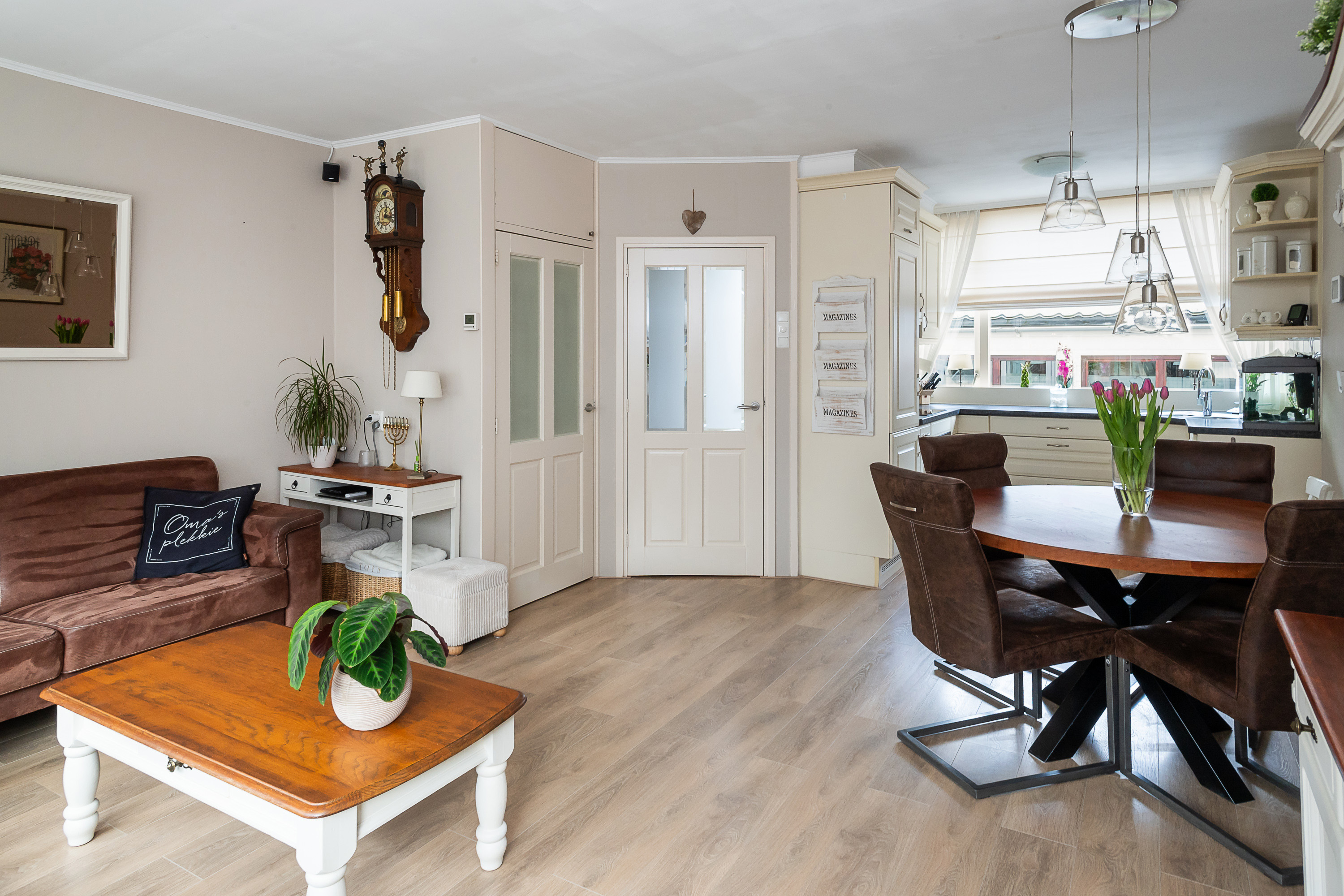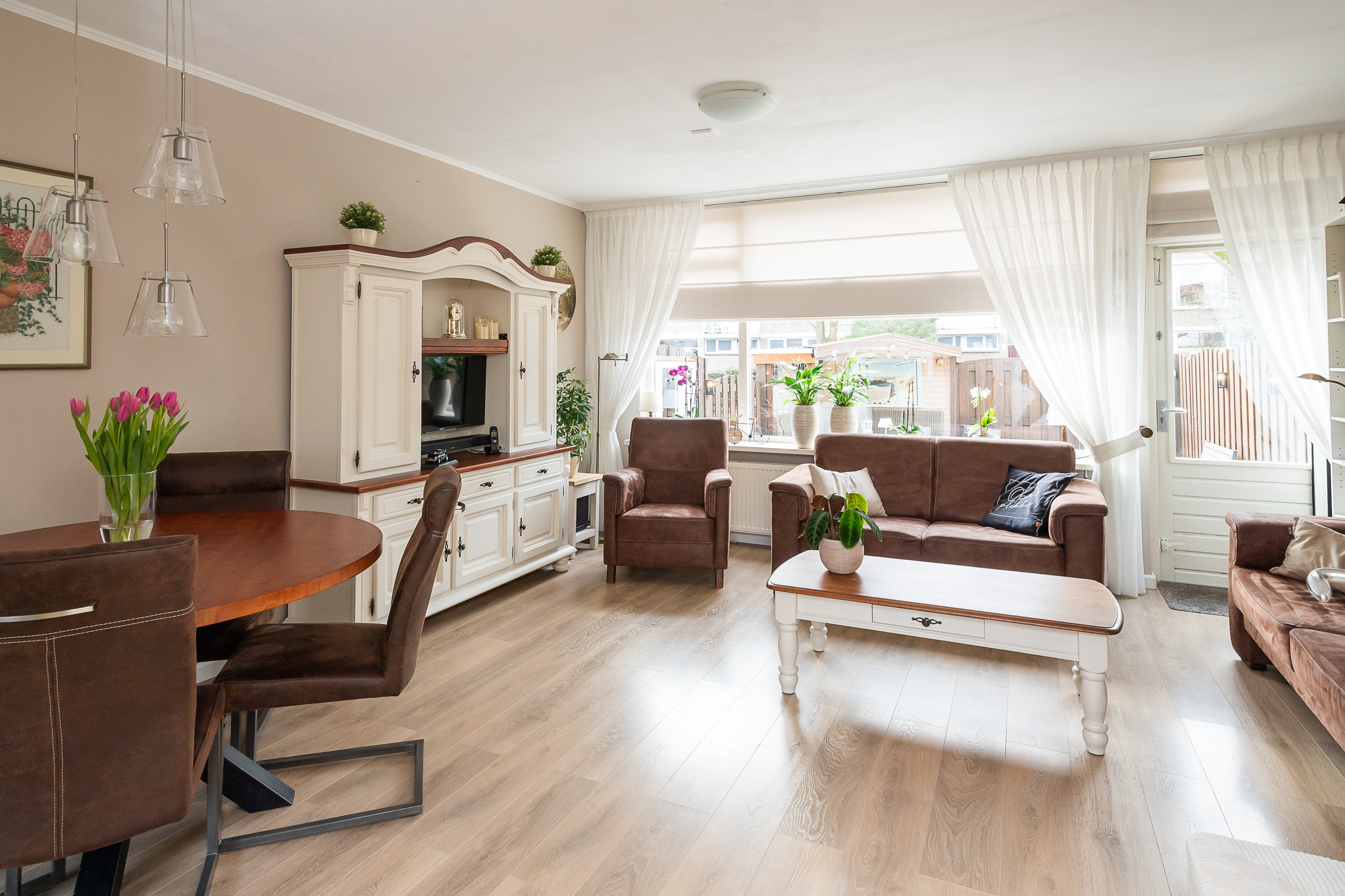 Entree via de achterzijde met meterkast met 3 fase-aansluiting, trapopgang naar de eerste verdieping en toegang tot het toilet met fonteintje. De gezellige, tuingerichte woonkamer is voorzien van een vaste trapkast, een fraaie laminaatvloer met vloerverwarming en een deur naar de achtertuin.