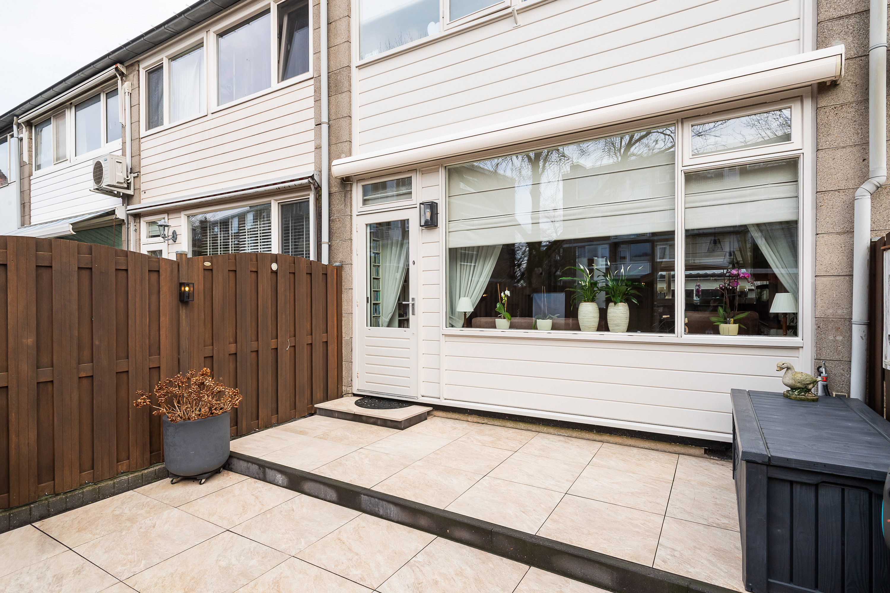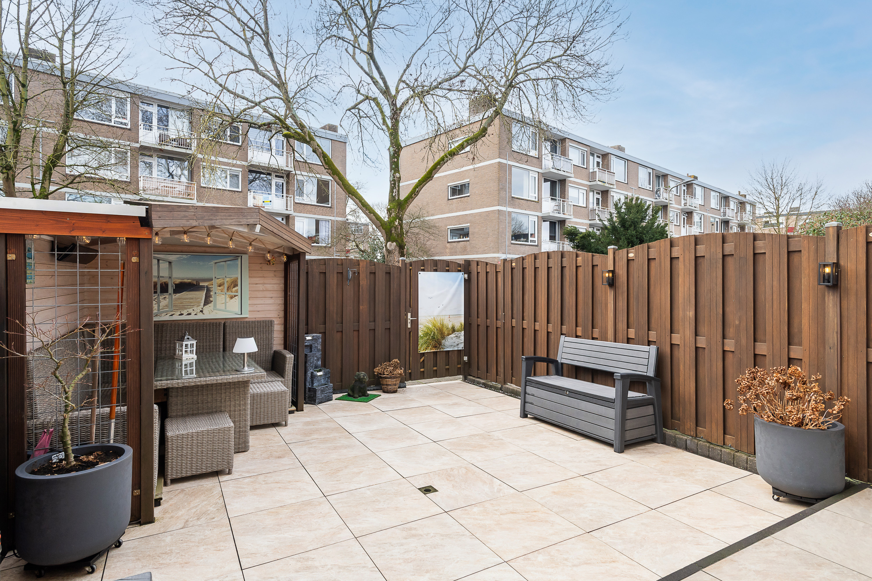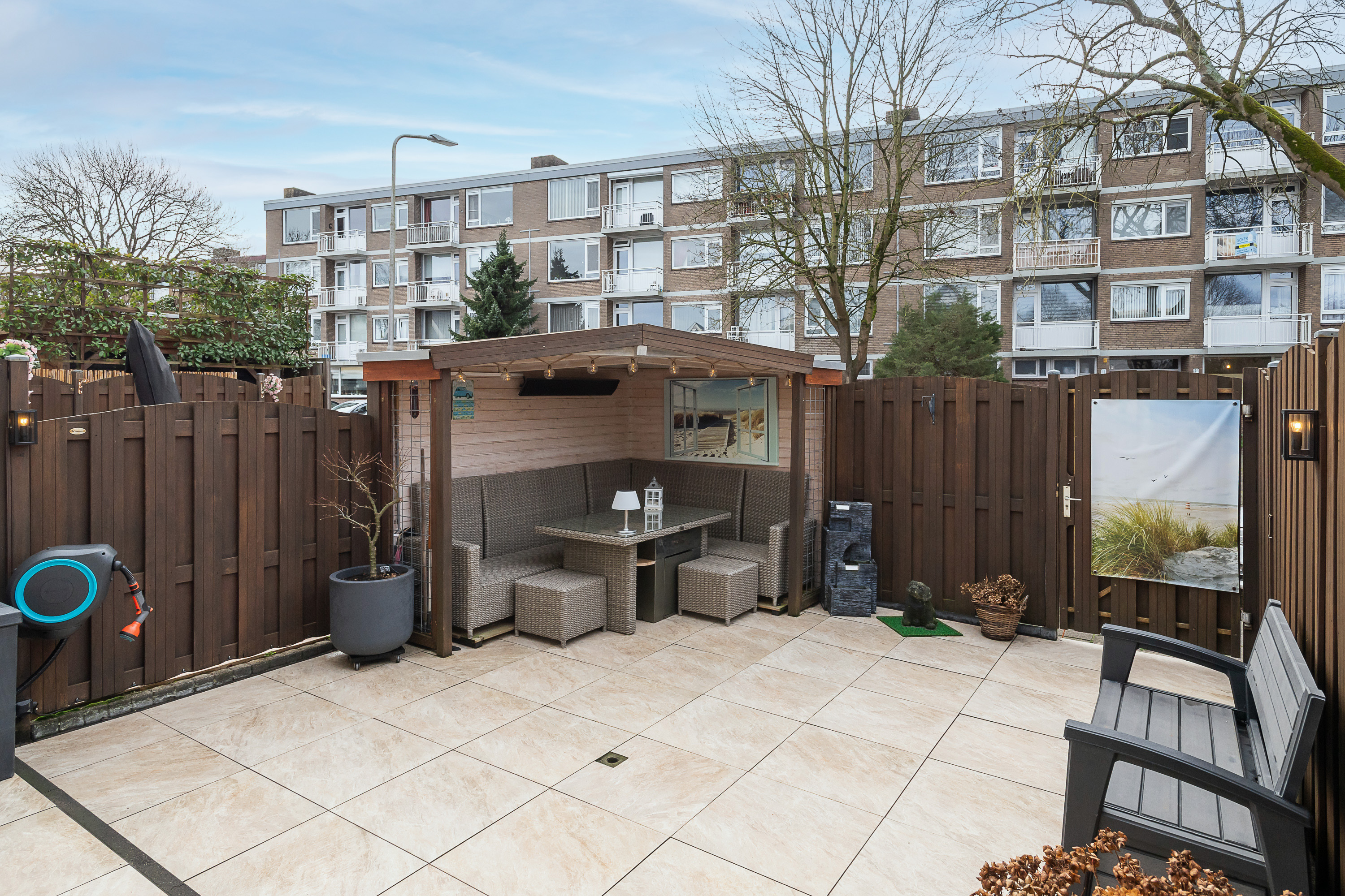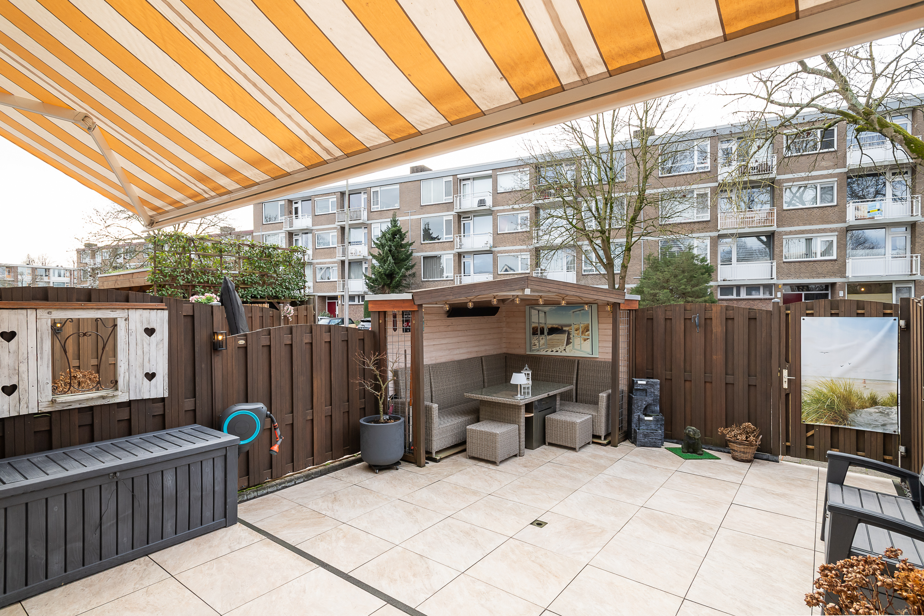 De tuin is betegeld met keramische tegels, gelegen op het Zuid- Westen en voorzien van een overkapping met een ‘zitje’ en schuttingen. Elektrisch bedienbaar zonnescherm aanwezig.