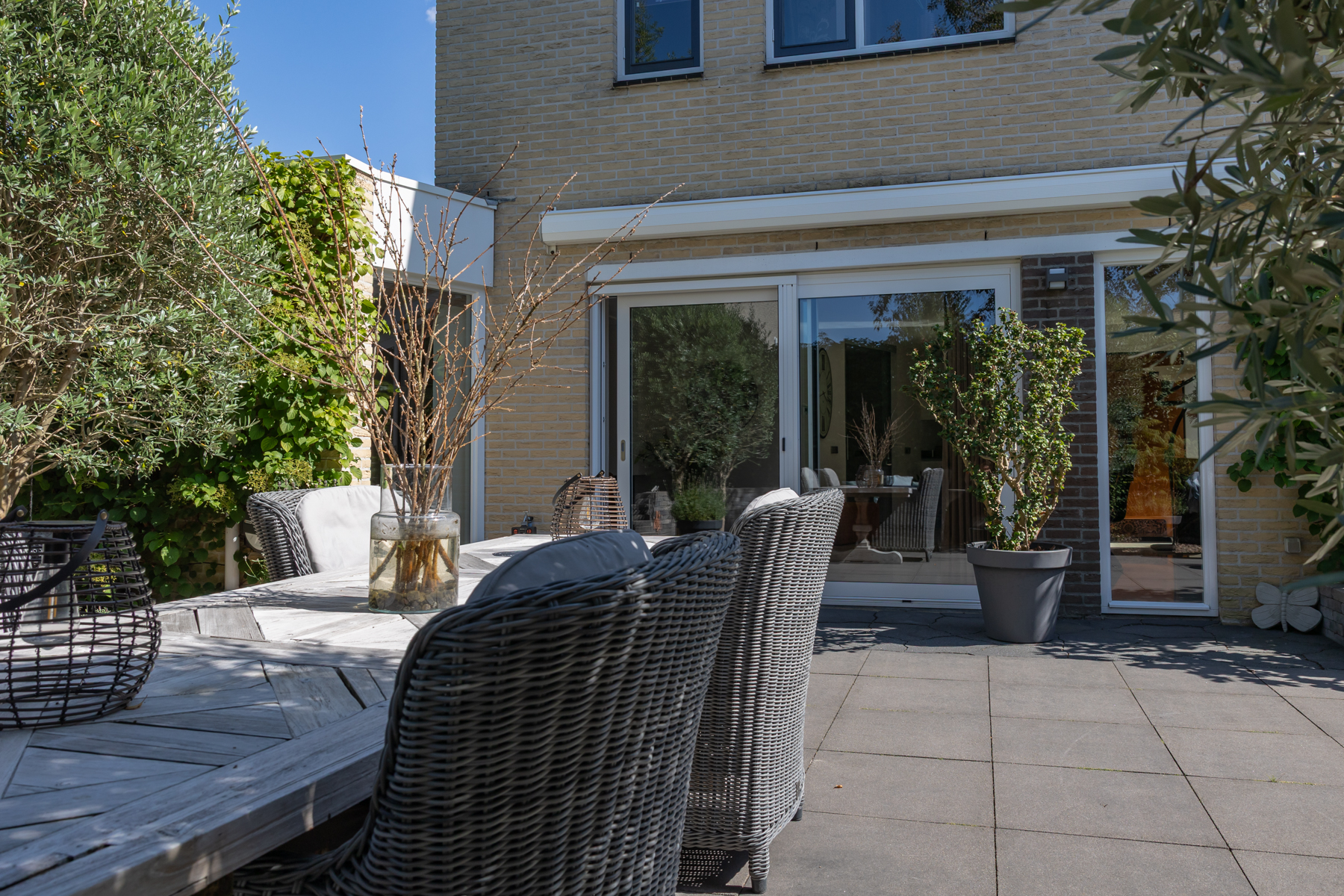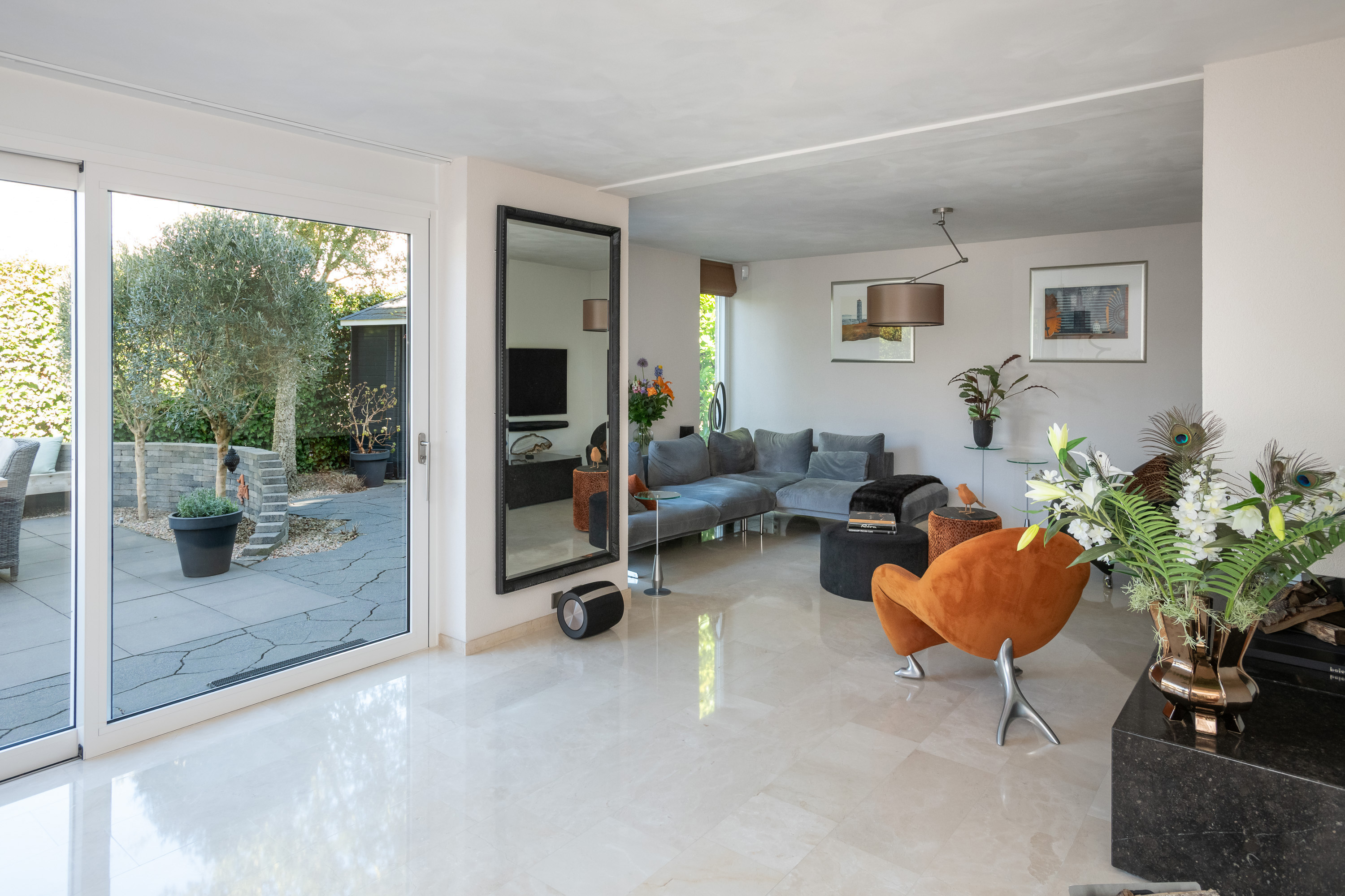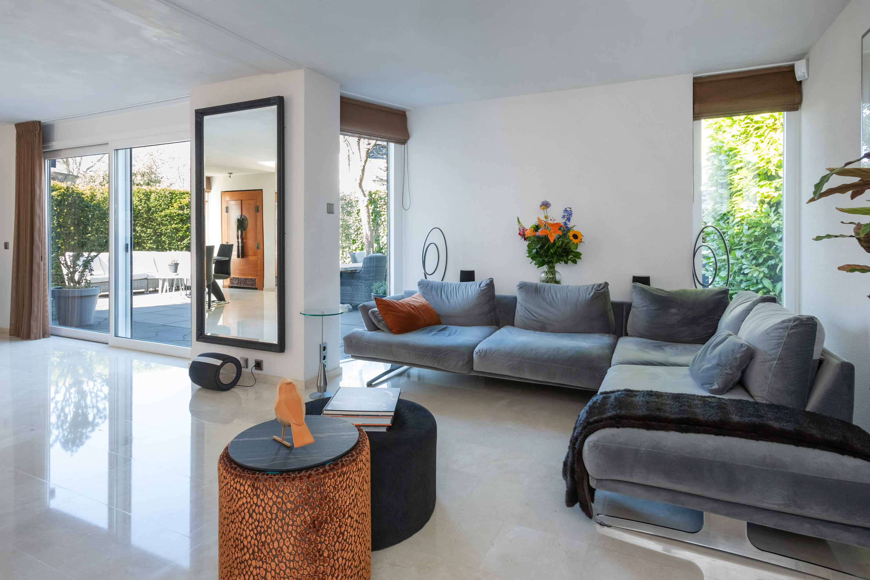 Entree, hal met garderobe, meterkast, ruime toilet met fonteintje. Via matglazen schuifdeuren bereikt u de living met marmeren vloer, vloerverwarming (hoofdverwarming), zijraam, nis, open haard met een natuurstenen plateau (Belgisch hardsteen/ Arduin) en een schuifpui (2021) naar achtertuin op het Westen en zijtuin op het Zuiden. De tuin is betegeld en voorzien van een groene haag, olijfbomen en terrassen aan de achterzijde en de zijkant. Elektrisch bedienbaar zonnescherm en watertappunt aanwezig. Via de zijkant bereikt u via een poort naar de oprit.