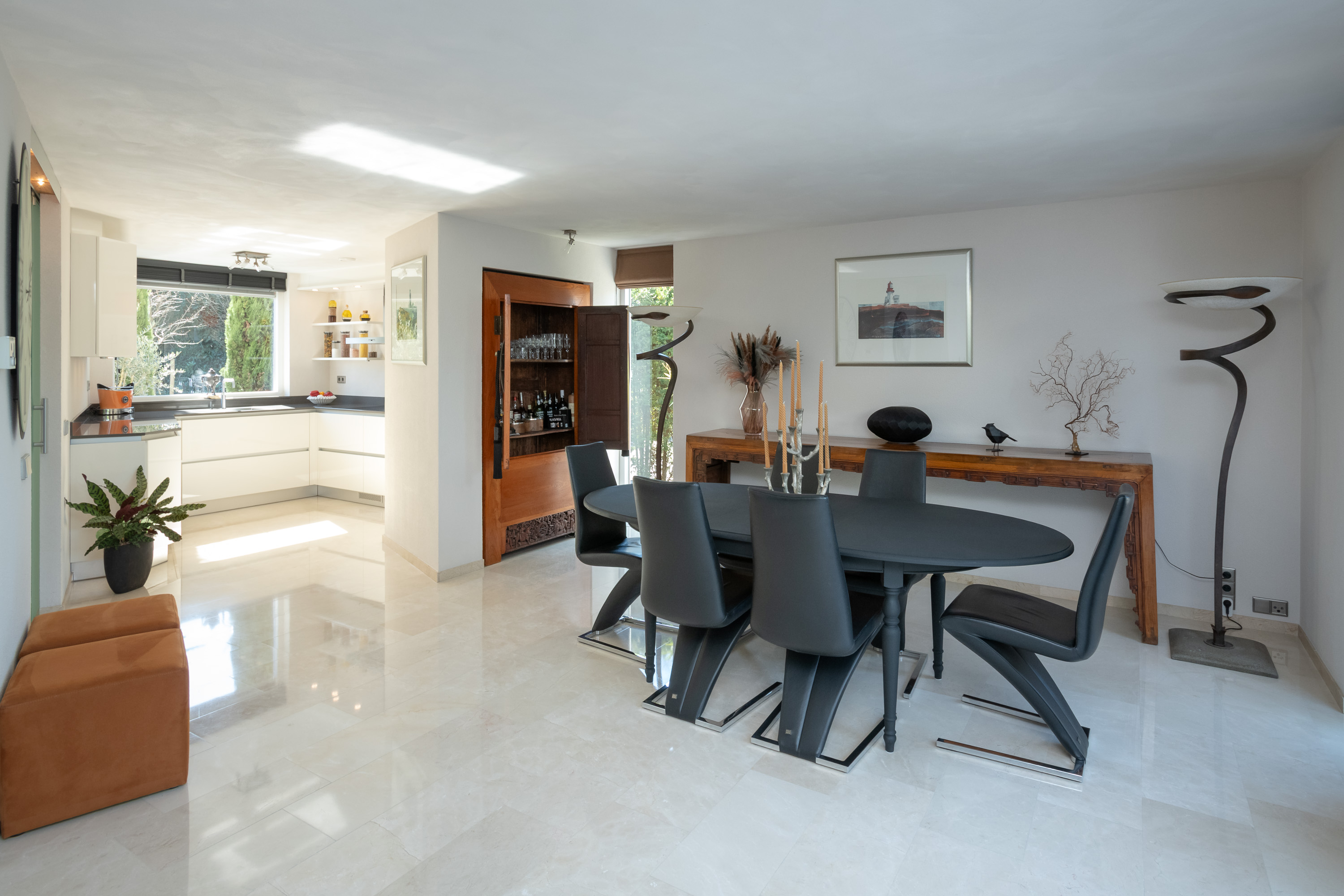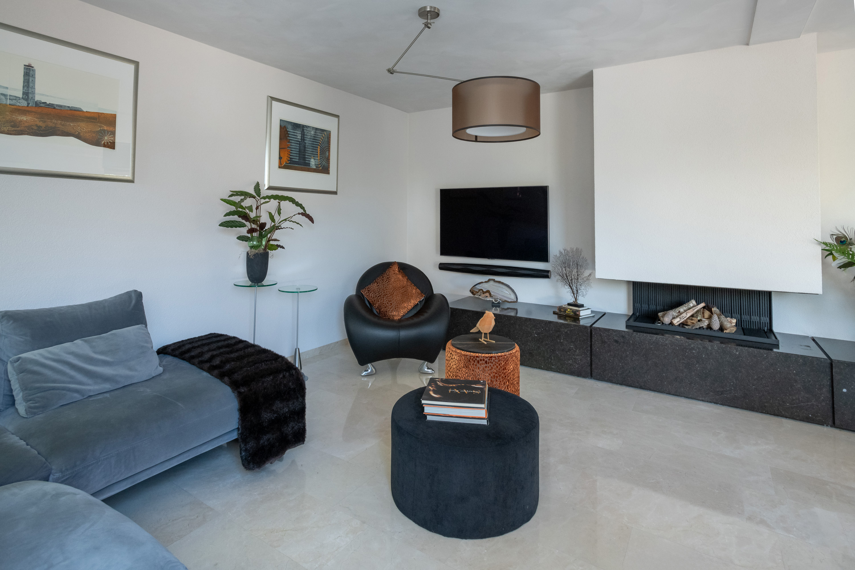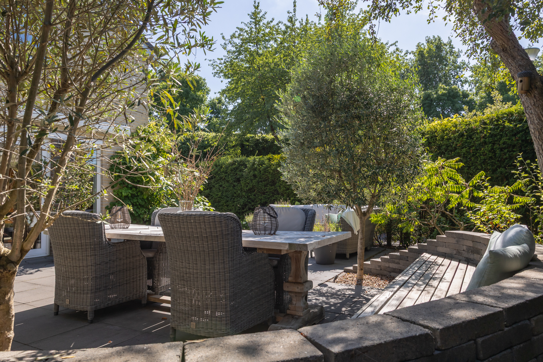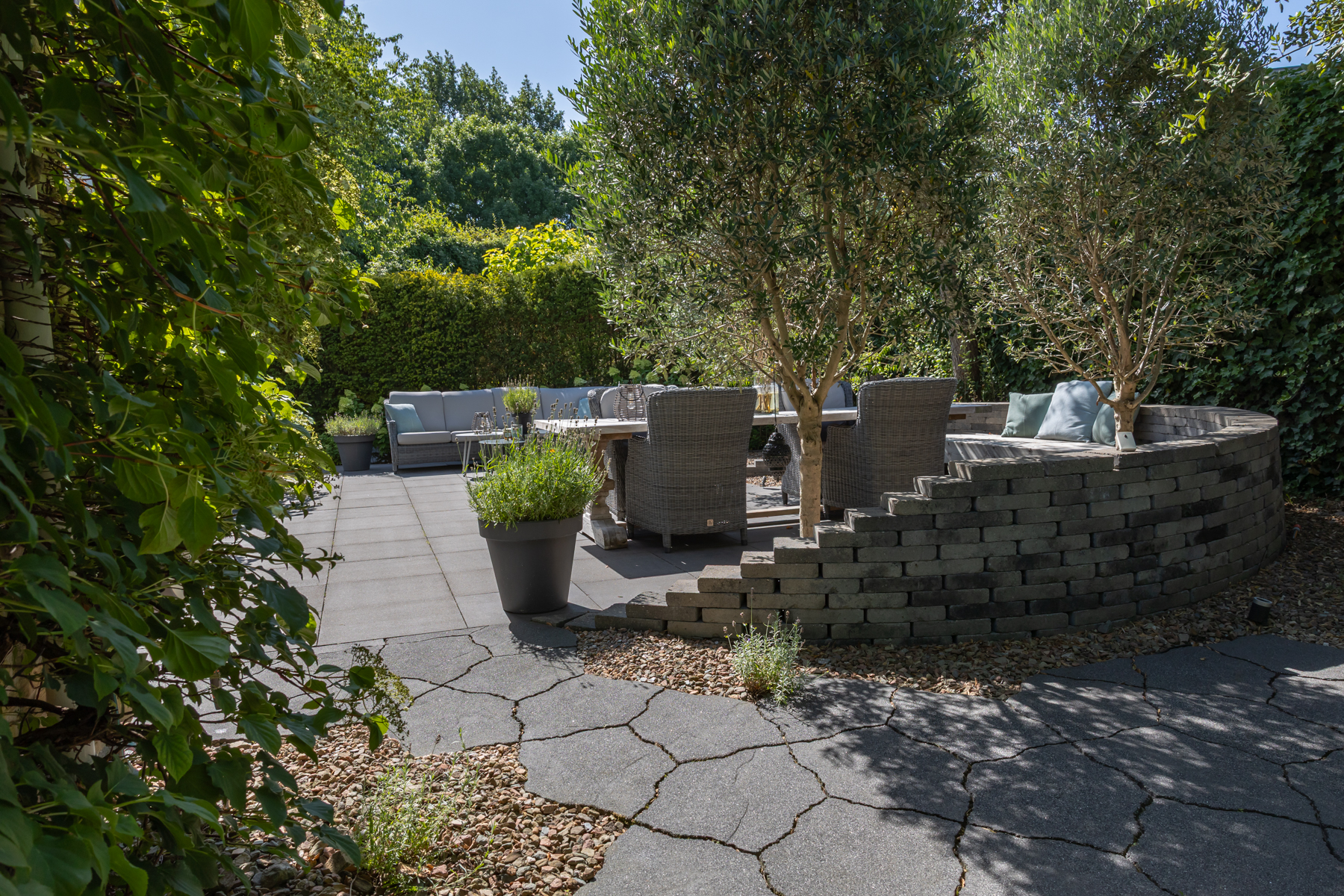 Entree, hal met garderobe, meterkast, ruime toilet met fonteintje. Via matglazen schuifdeuren bereikt u de living met marmeren vloer, vloerverwarming (hoofdverwarming), zijraam, nis, open haard met een natuurstenen plateau (Belgisch hardsteen/ Arduin) en een schuifpui (2021) naar achtertuin op het Westen en zijtuin op het Zuiden. De tuin is betegeld en voorzien van een groene haag, olijfbomen en terrassen aan de achterzijde en de zijkant. Elektrisch bedienbaar zonnescherm en watertappunt aanwezig. Via de zijkant bereikt u via een poort naar de oprit.