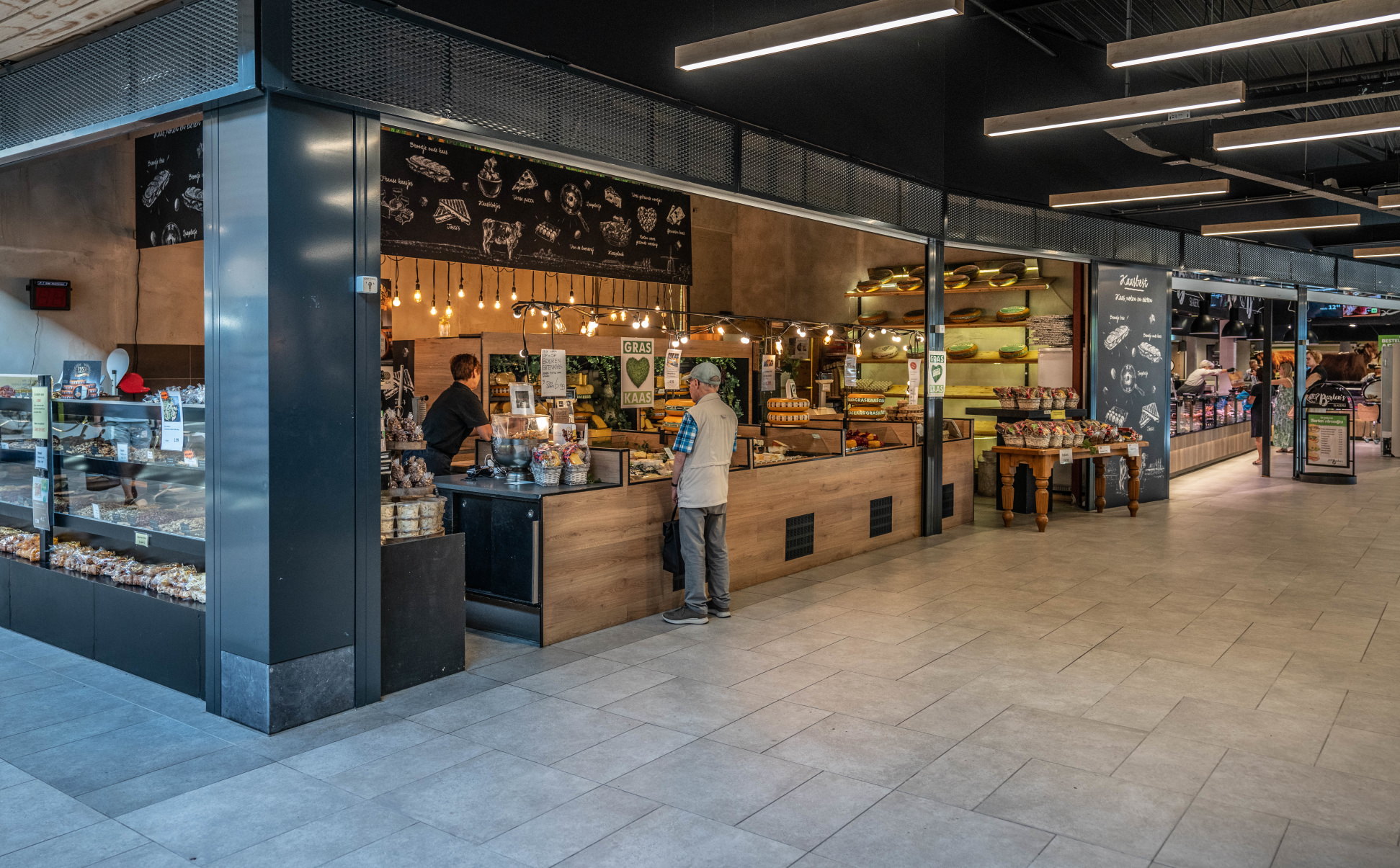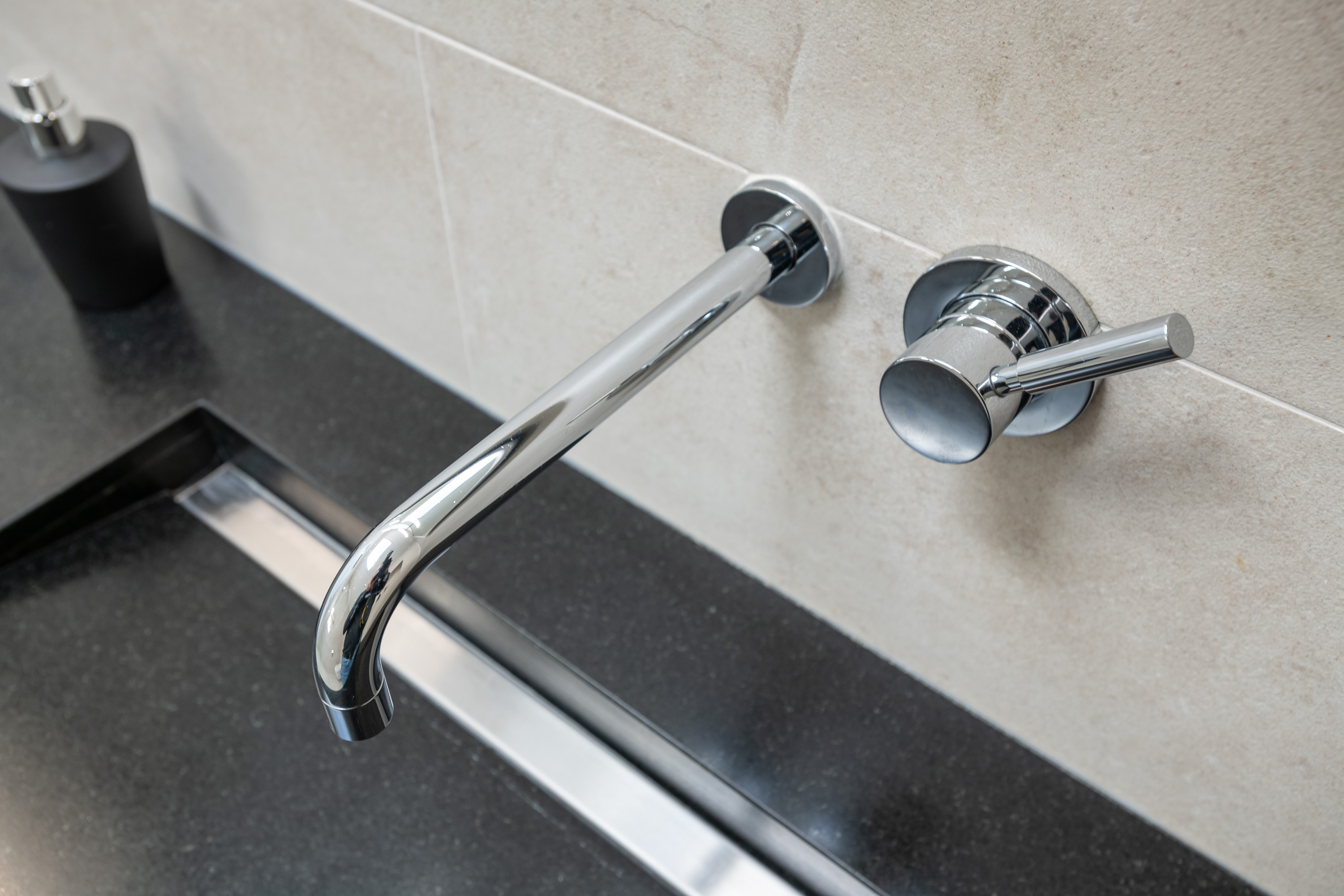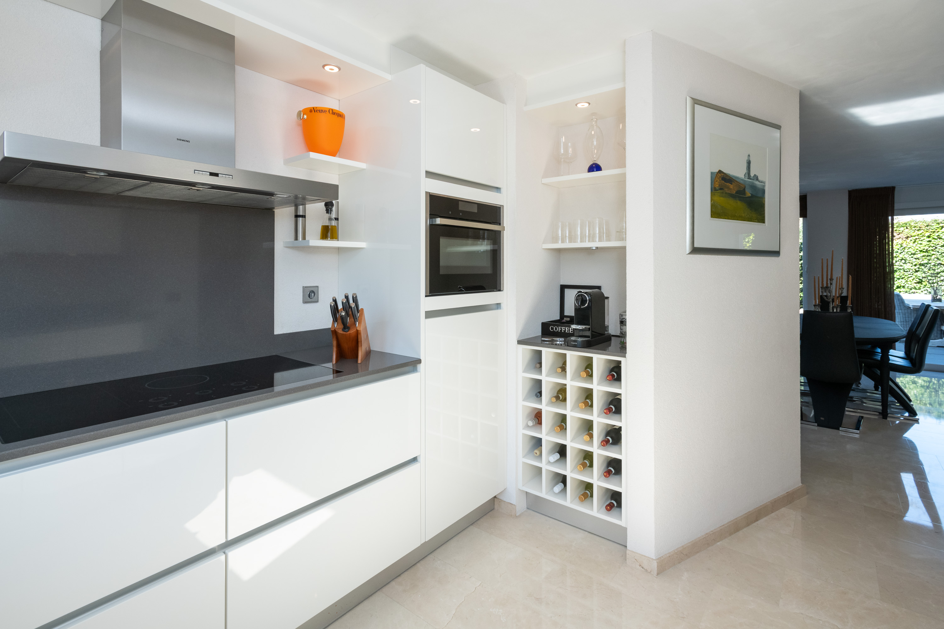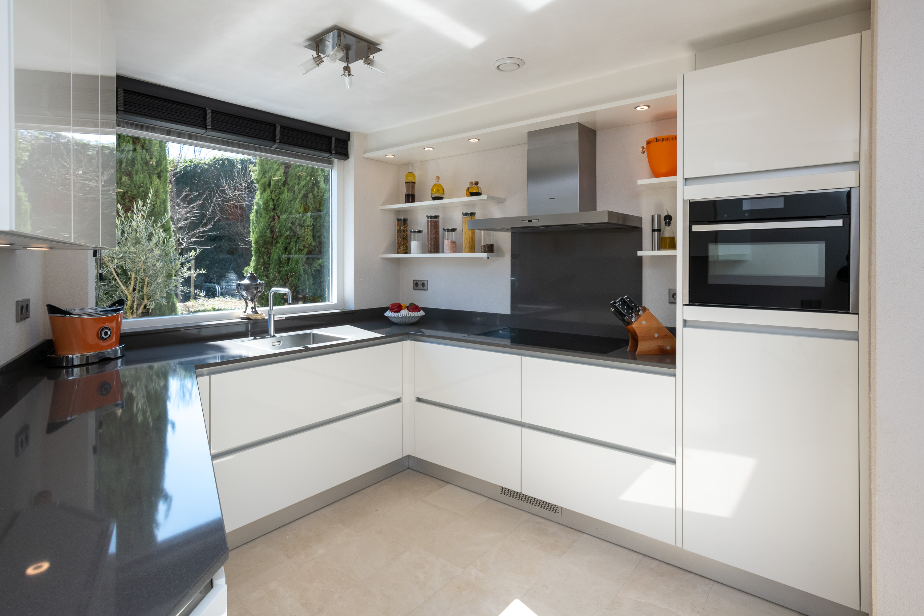 Moderne open keuken (greeploos) gesitueerd aan de voorzijde met ruime U-opstelling, composiet bladen, inbouwapparatuur waaronder een brede inductie-kookplaat (90 cm breed), Quooker, combi-heteluchtoven, koelkast, afzuigkap en vaatwasser. Planken en vakkenkast met verlichting voor wijnflessen.