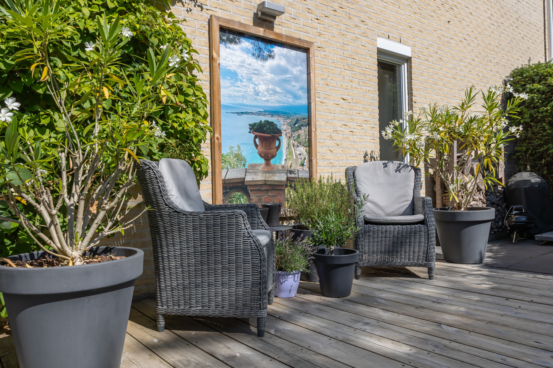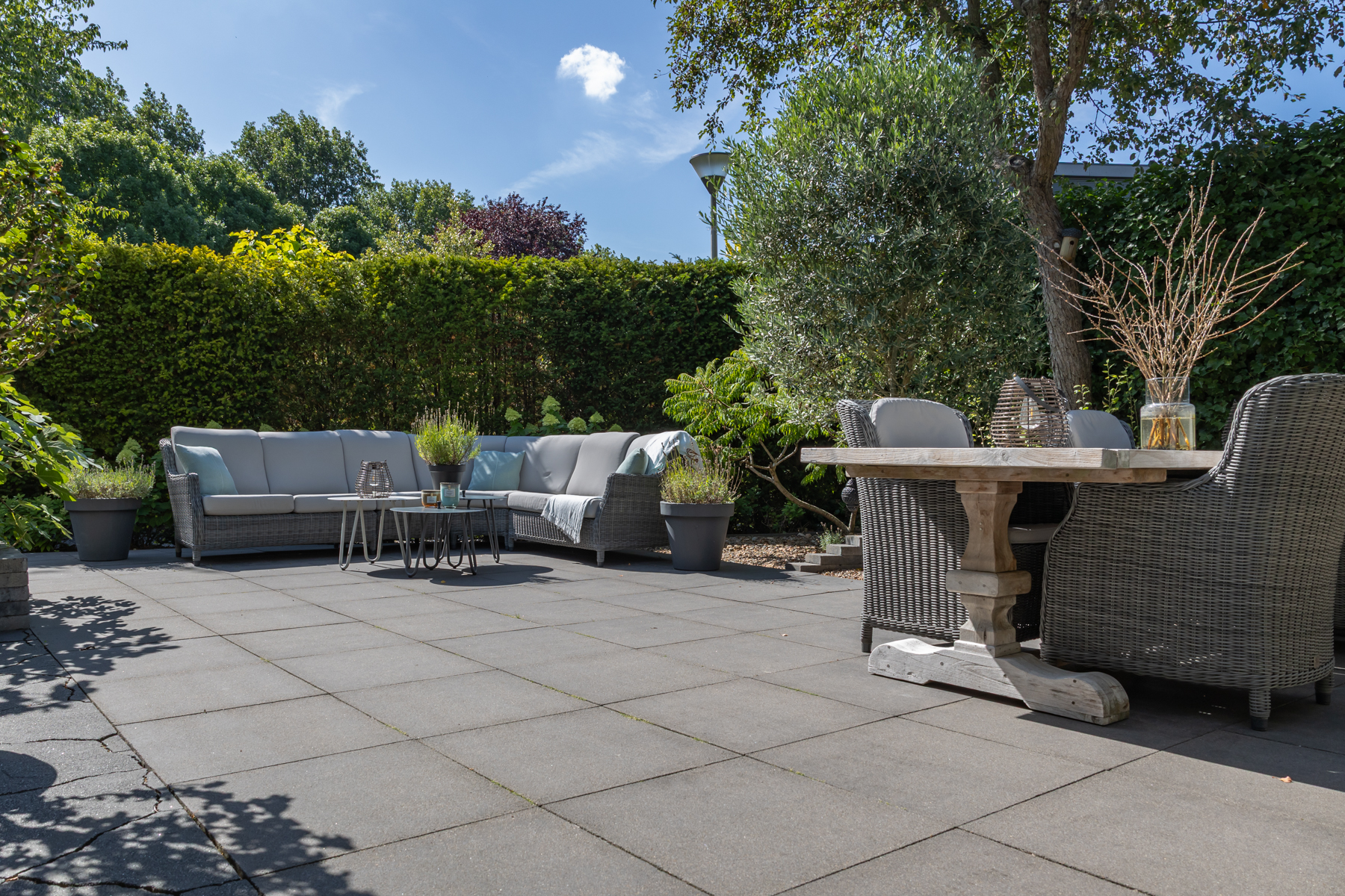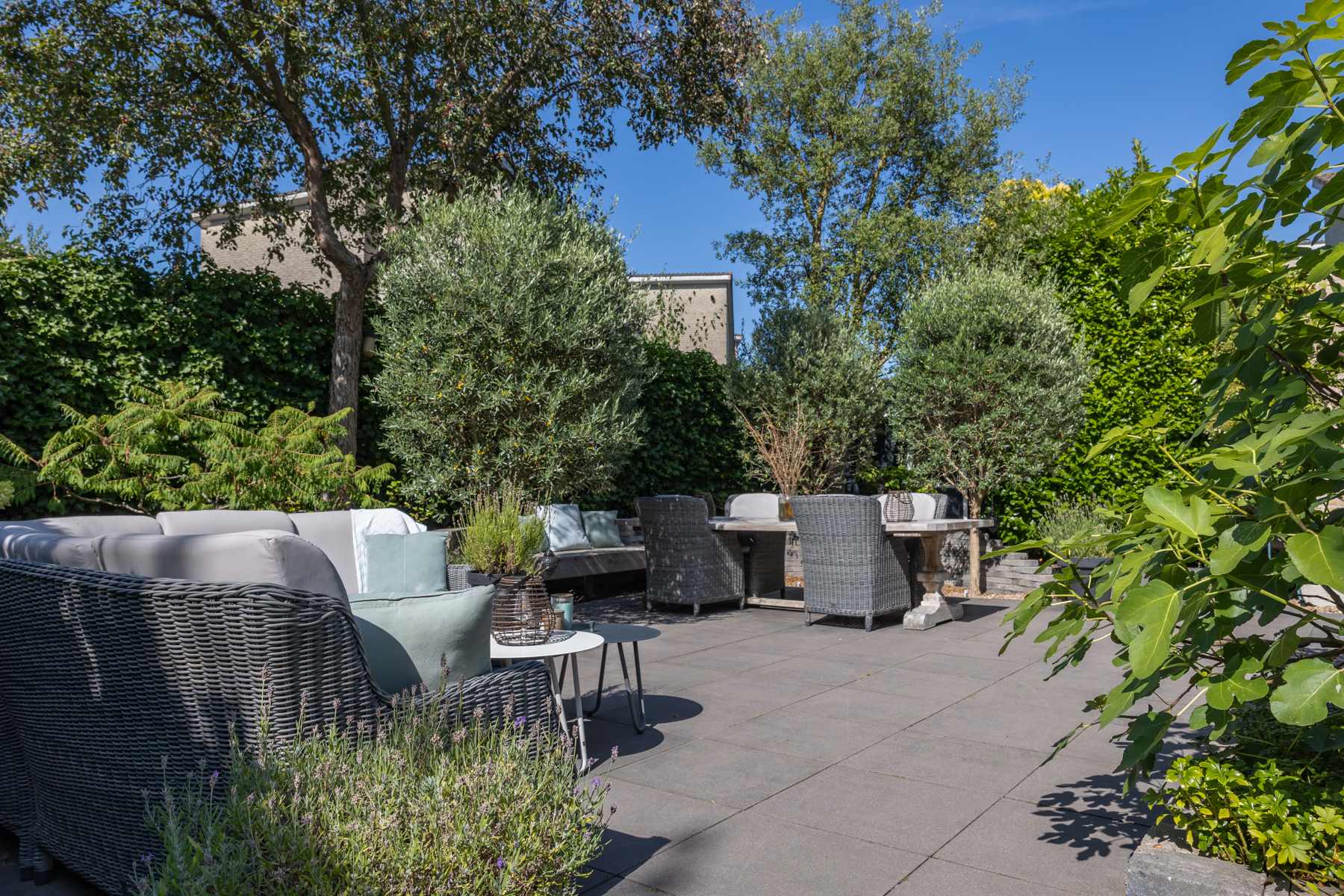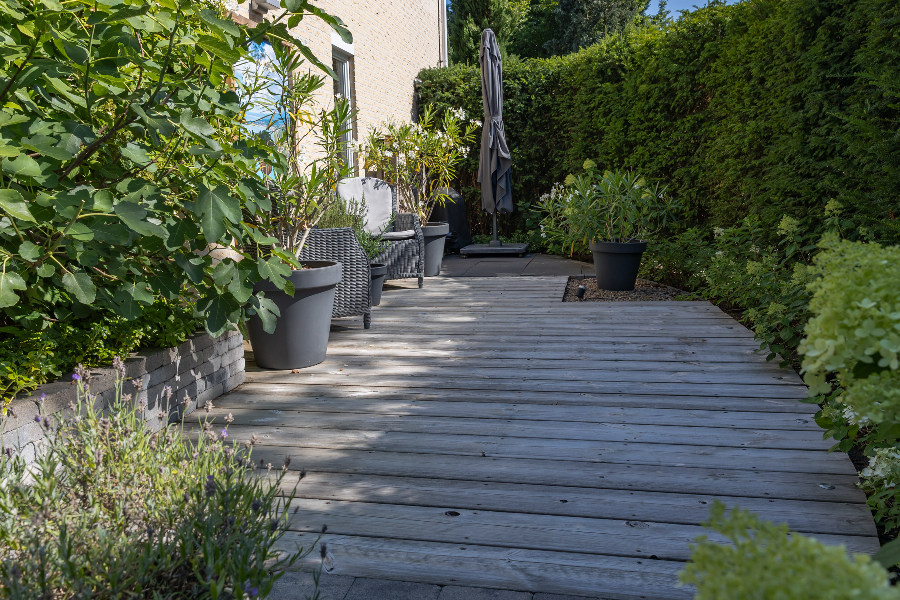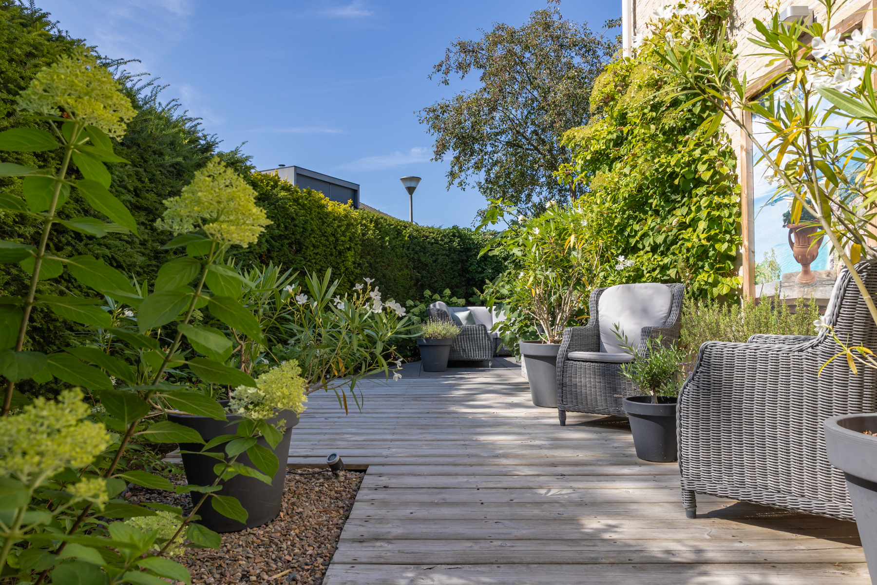 Achtertuin op het Westen en zijtuin op het Zuiden.