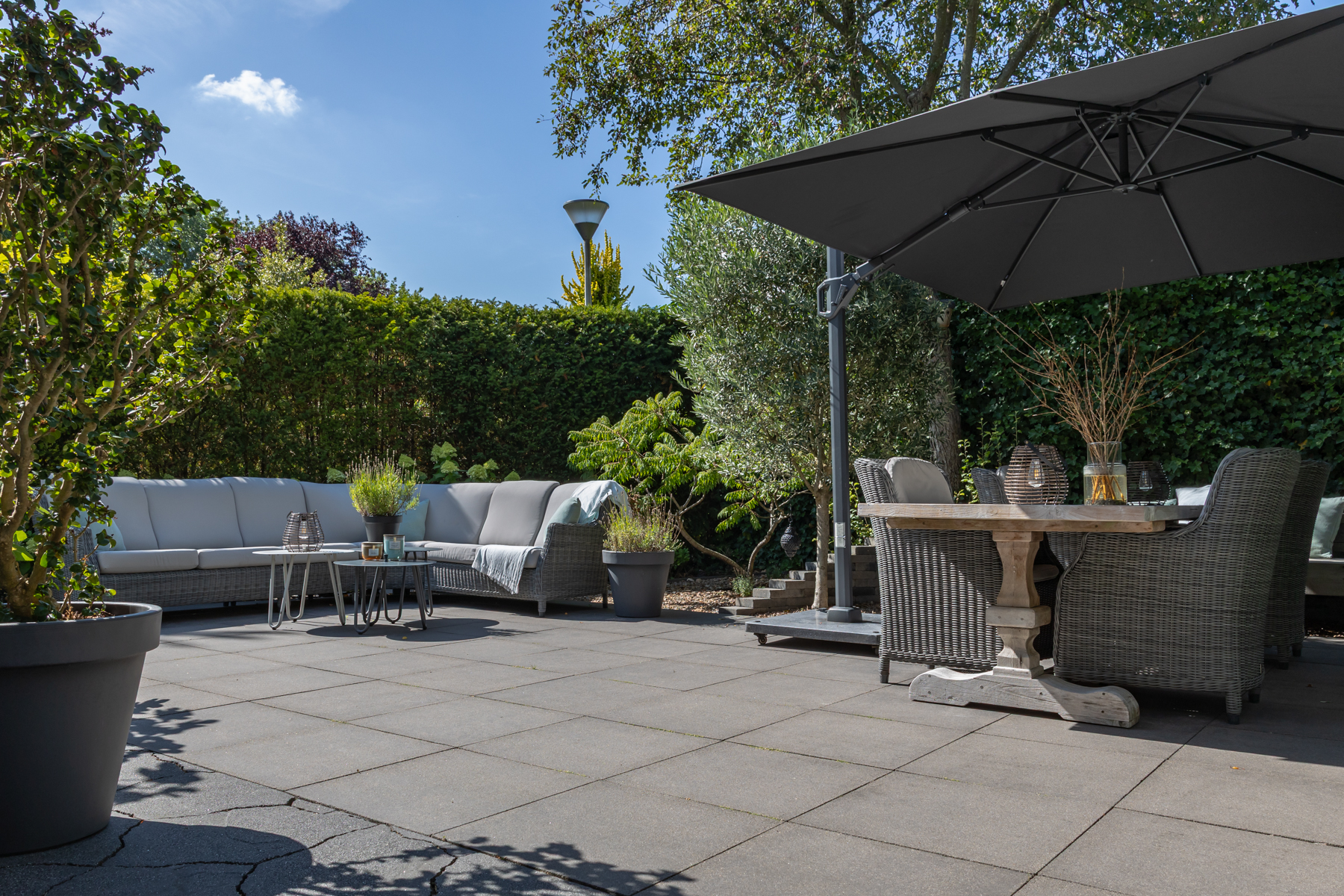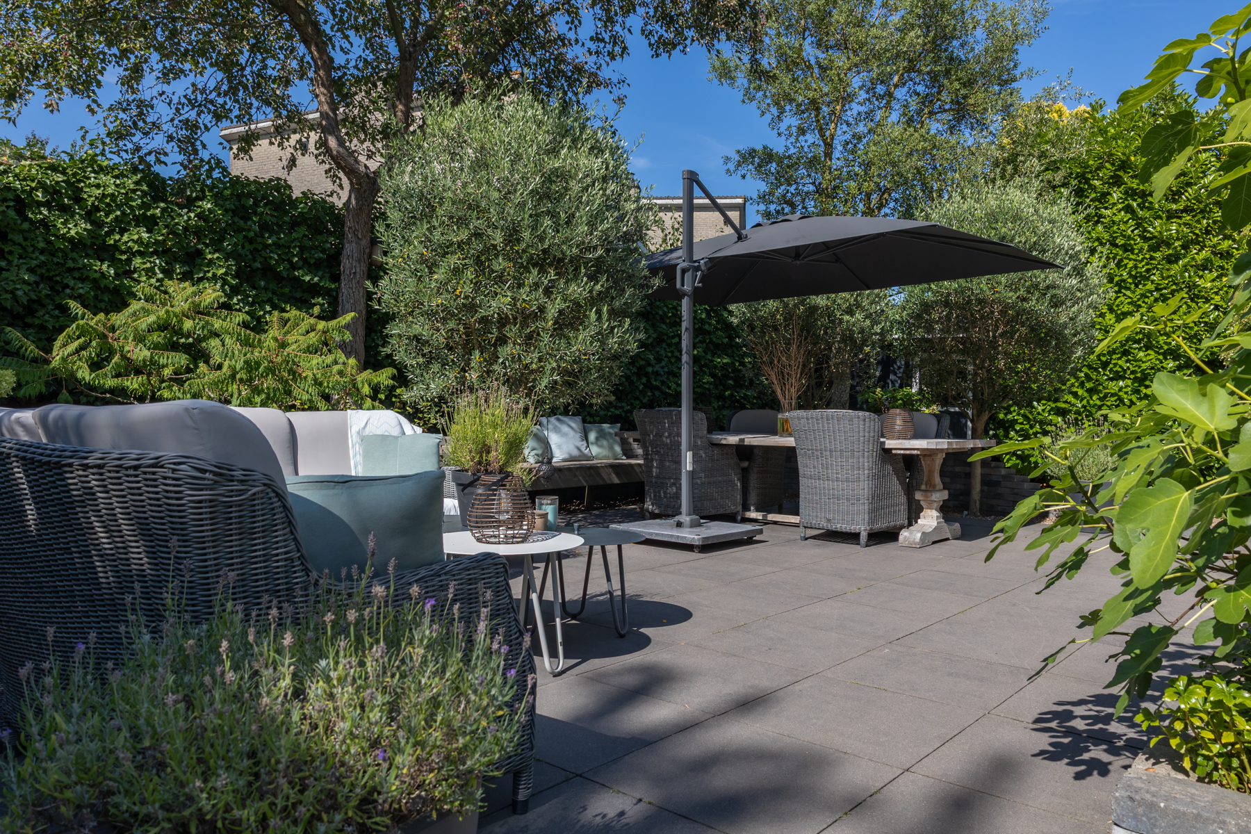Elektrisch bedienbaar zonnescherm tuinzijde.