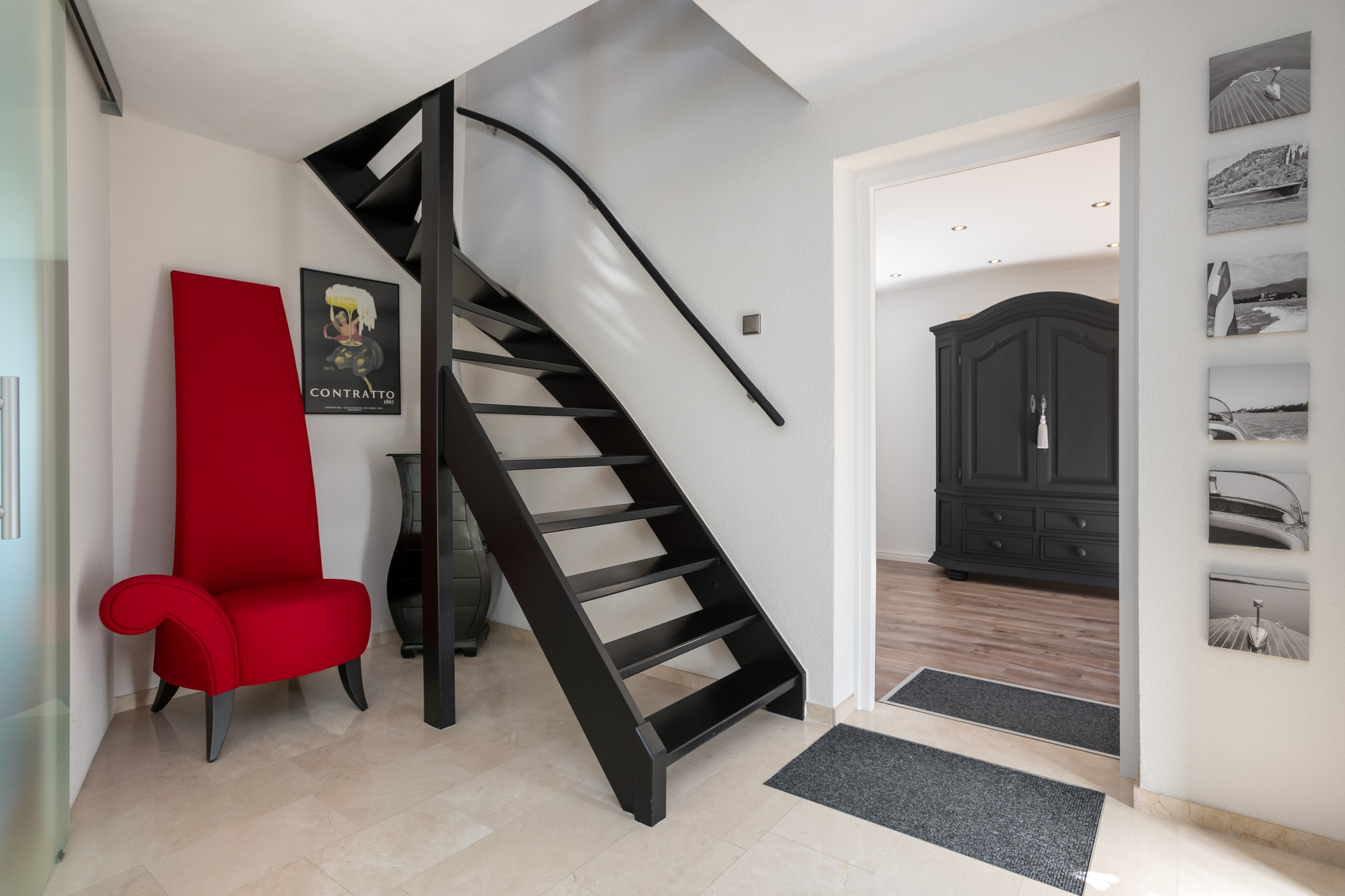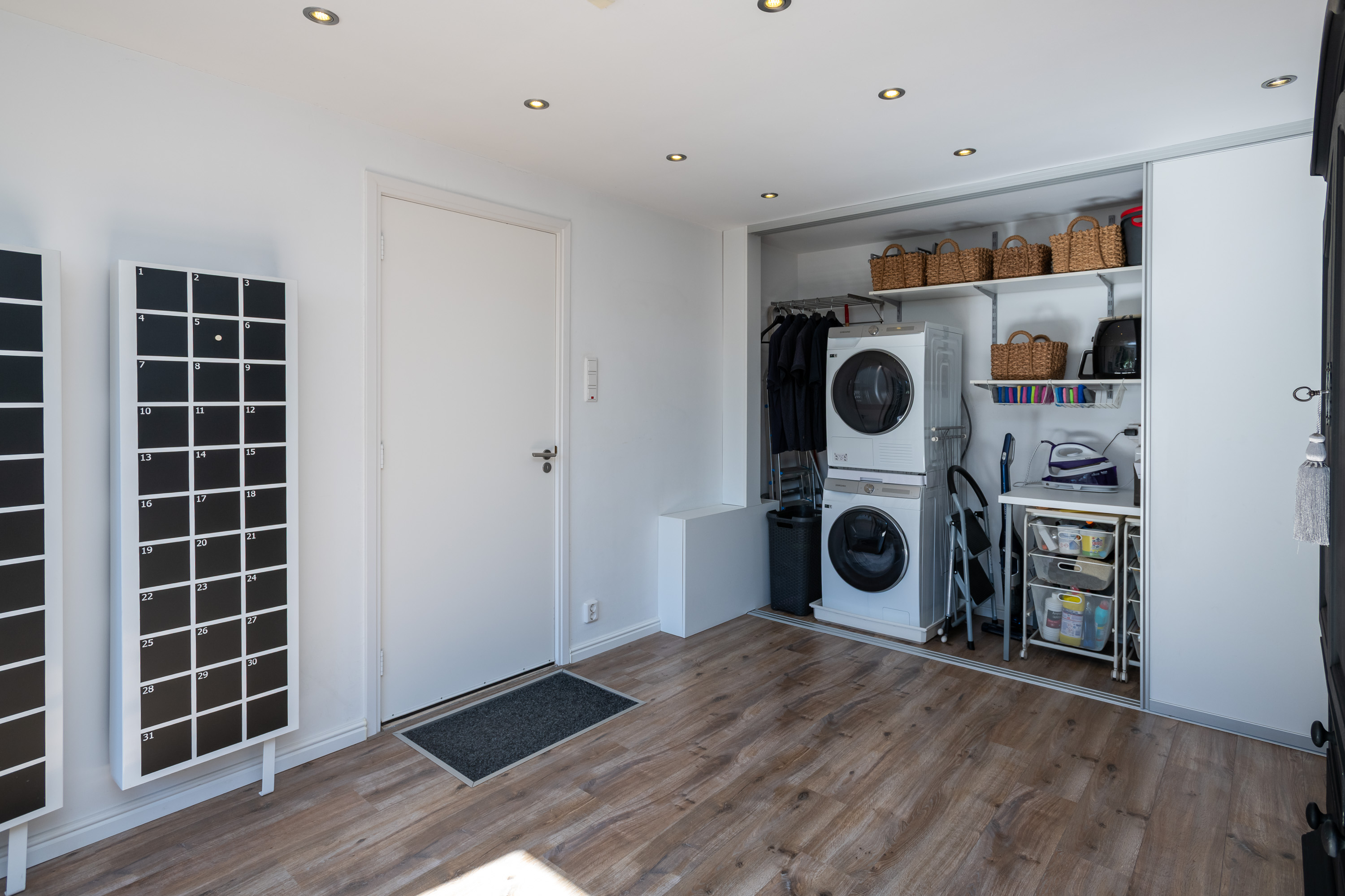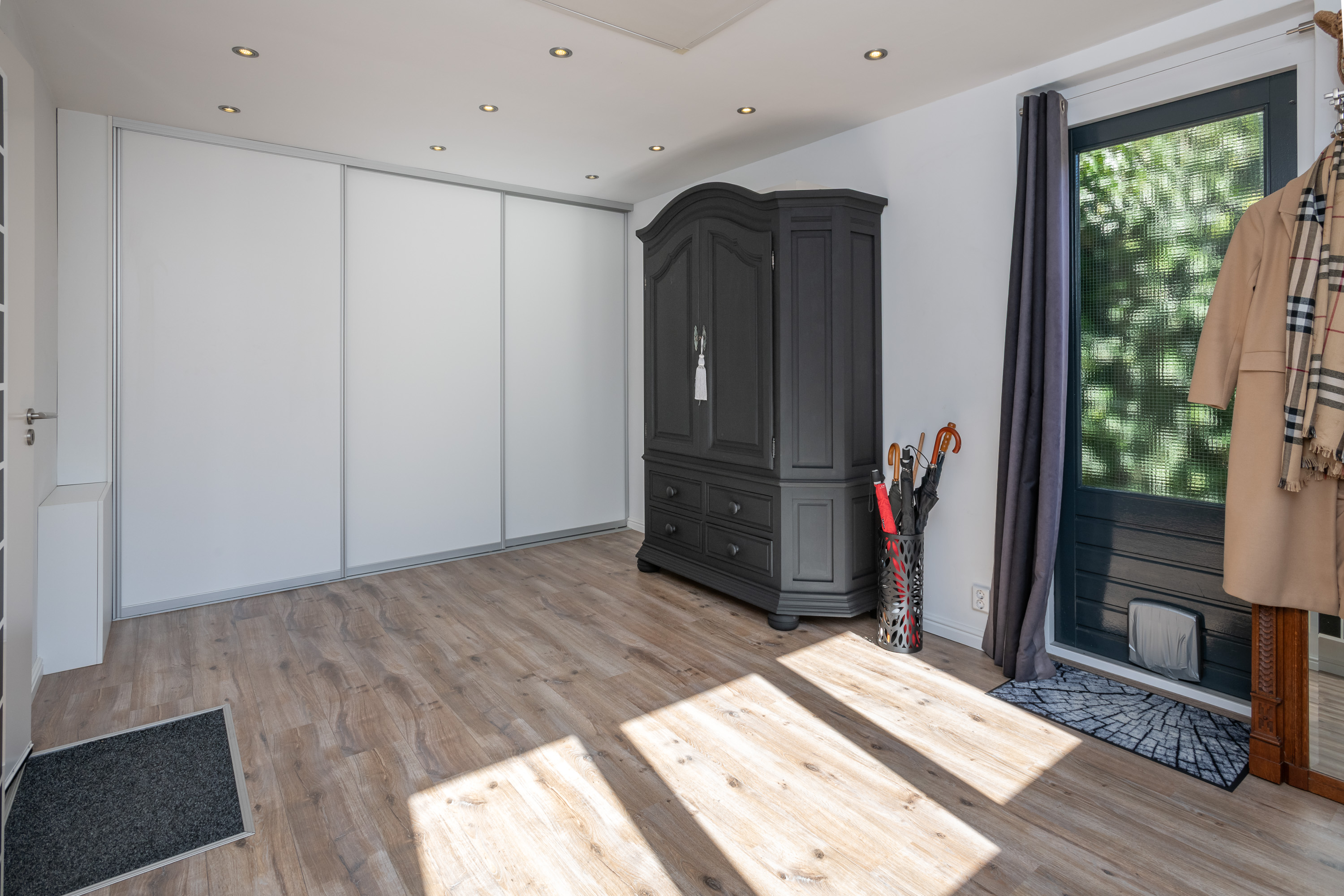 Via de hal is er toegang tot een kamer met een schuifkastenwand (Pinchetti & van Caem) waarin een wasmachine-aansluiting, raam, zijraam en deur naar de zijtuin en oprit. Vlizotrap naar een bergzolder. Open trap vanuit de hal naar de 1e verdieping.