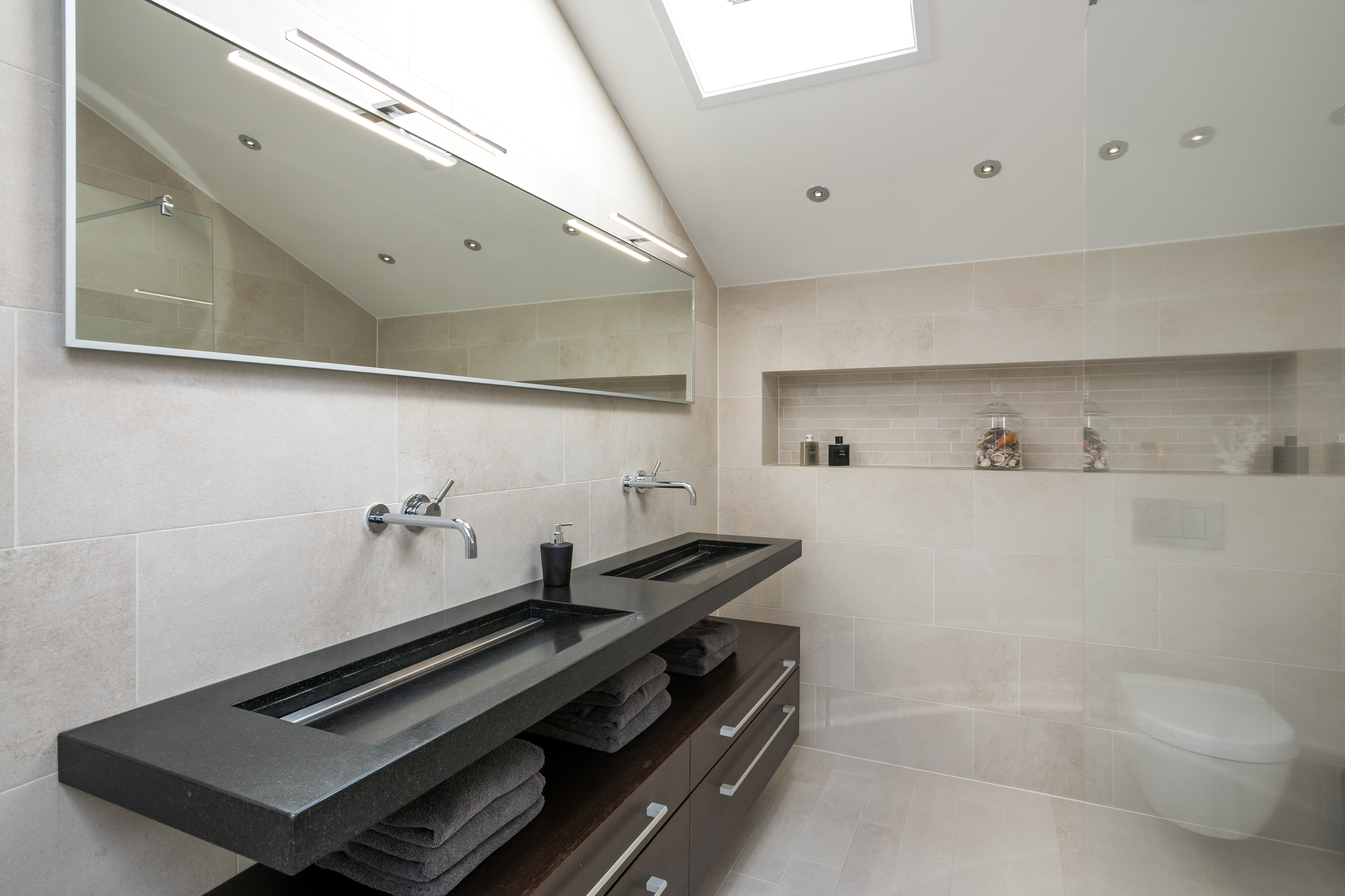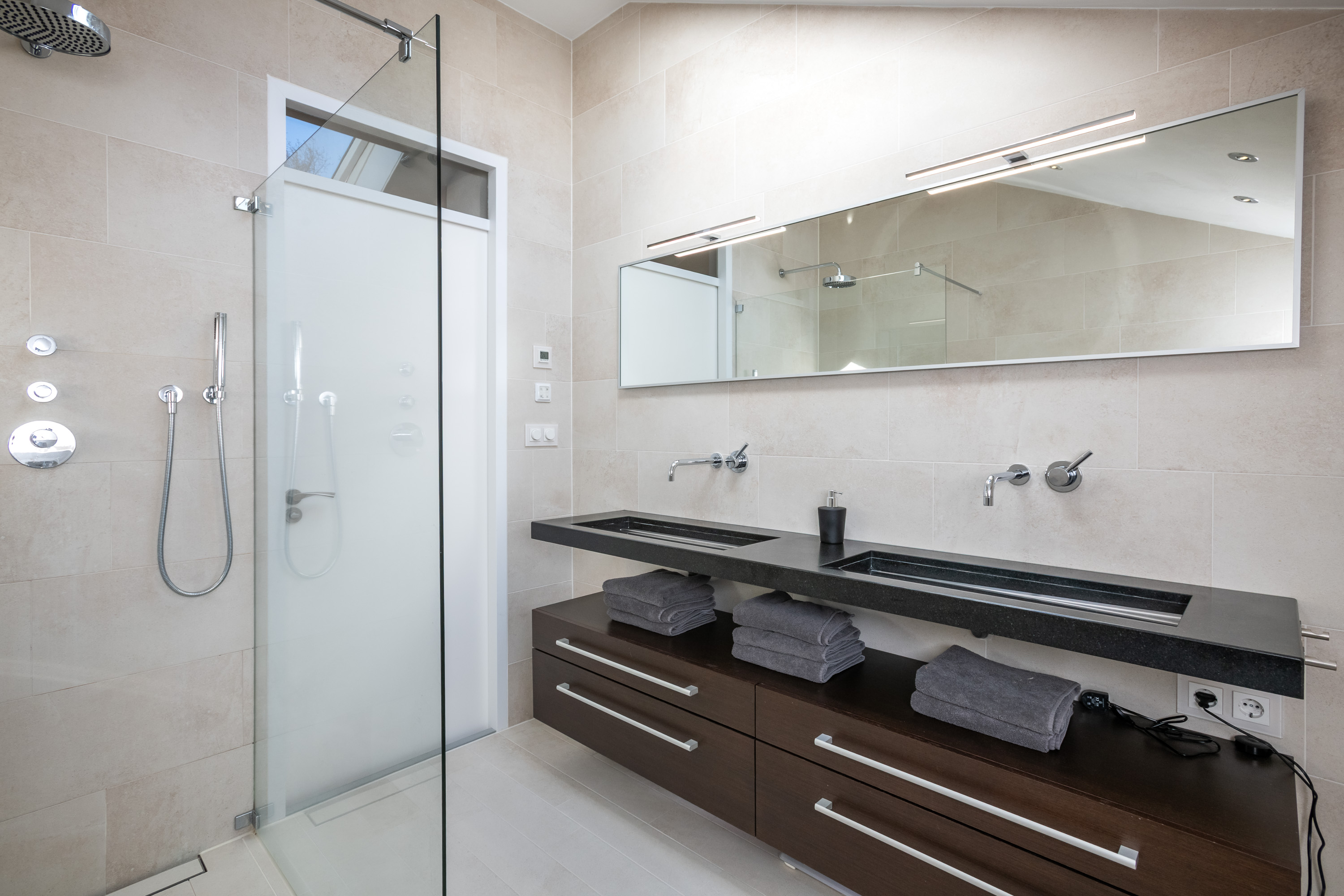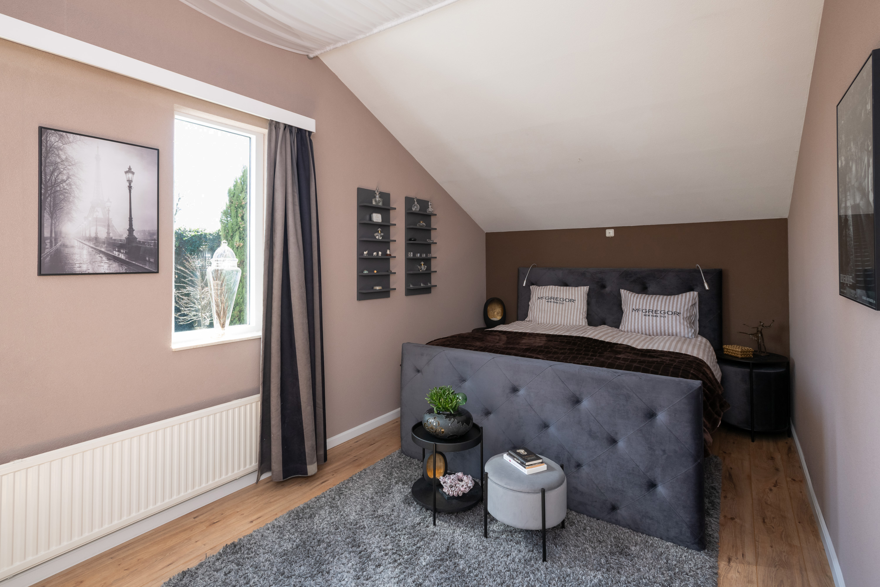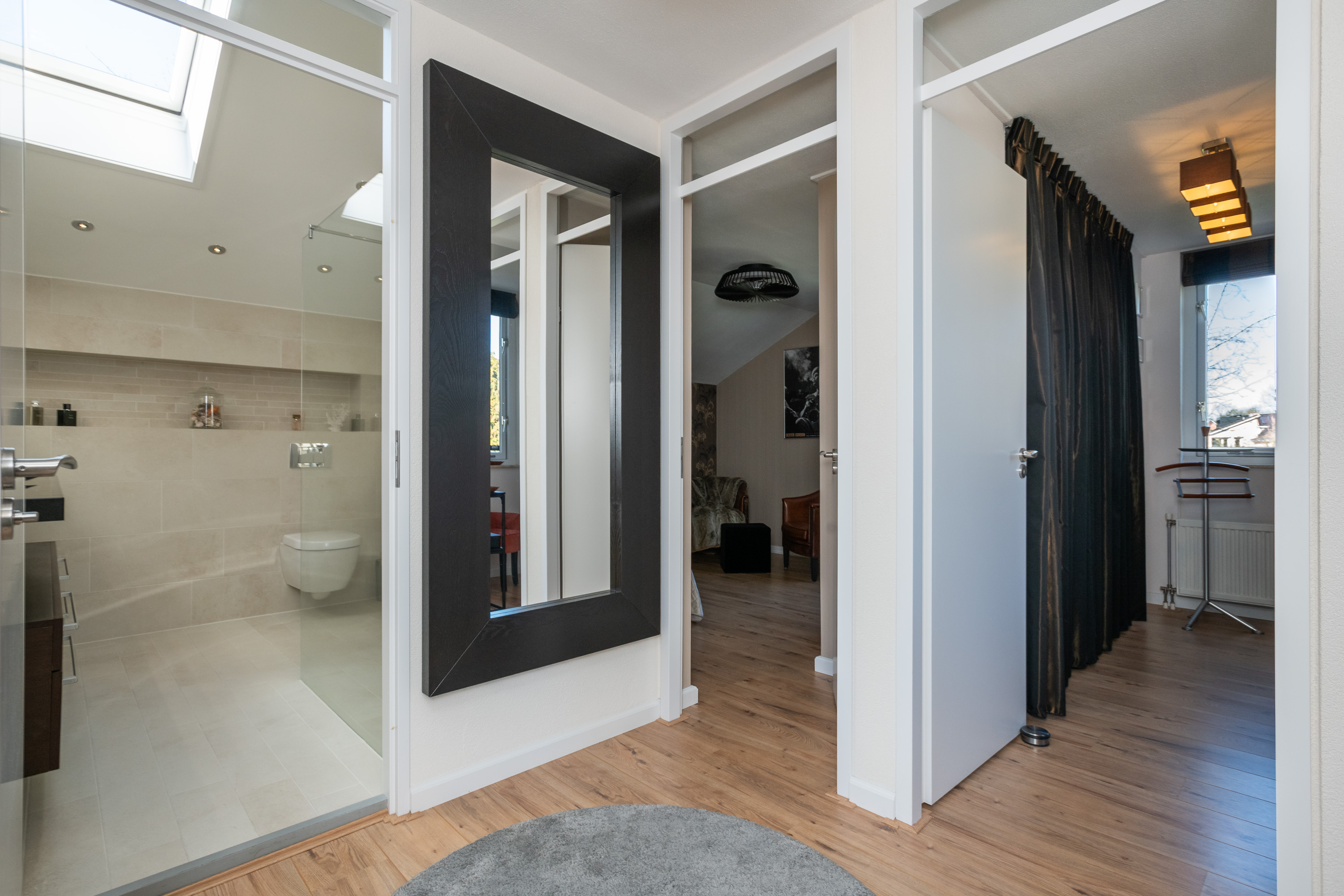 Overloop met toegang tot een luxe badkamer met breed Belgisch hardstenen wastafelblad (merk: Assenti) en twee inbouwkranen (Villeroy & Boch), een spiegel met verlichting en spiegelverwarming, wastafelmeubel, elektrische vloerverwarming, ruime inloopdouche met glazen wand, handdouche en regendouche. De badkamer is beschikt over een prettige lichtinval via een dakraam. De ruime ouderslaapkamer is voorzien van airco en is gesitueerd aan de voorzijde met hoge nok. Aan de achterzijde bevindt zich nog een 2e slaapkamer en 3e werk/-garderobekamer. Via een vaste trap vanaf de overloop bereikt u de 2e verdieping.