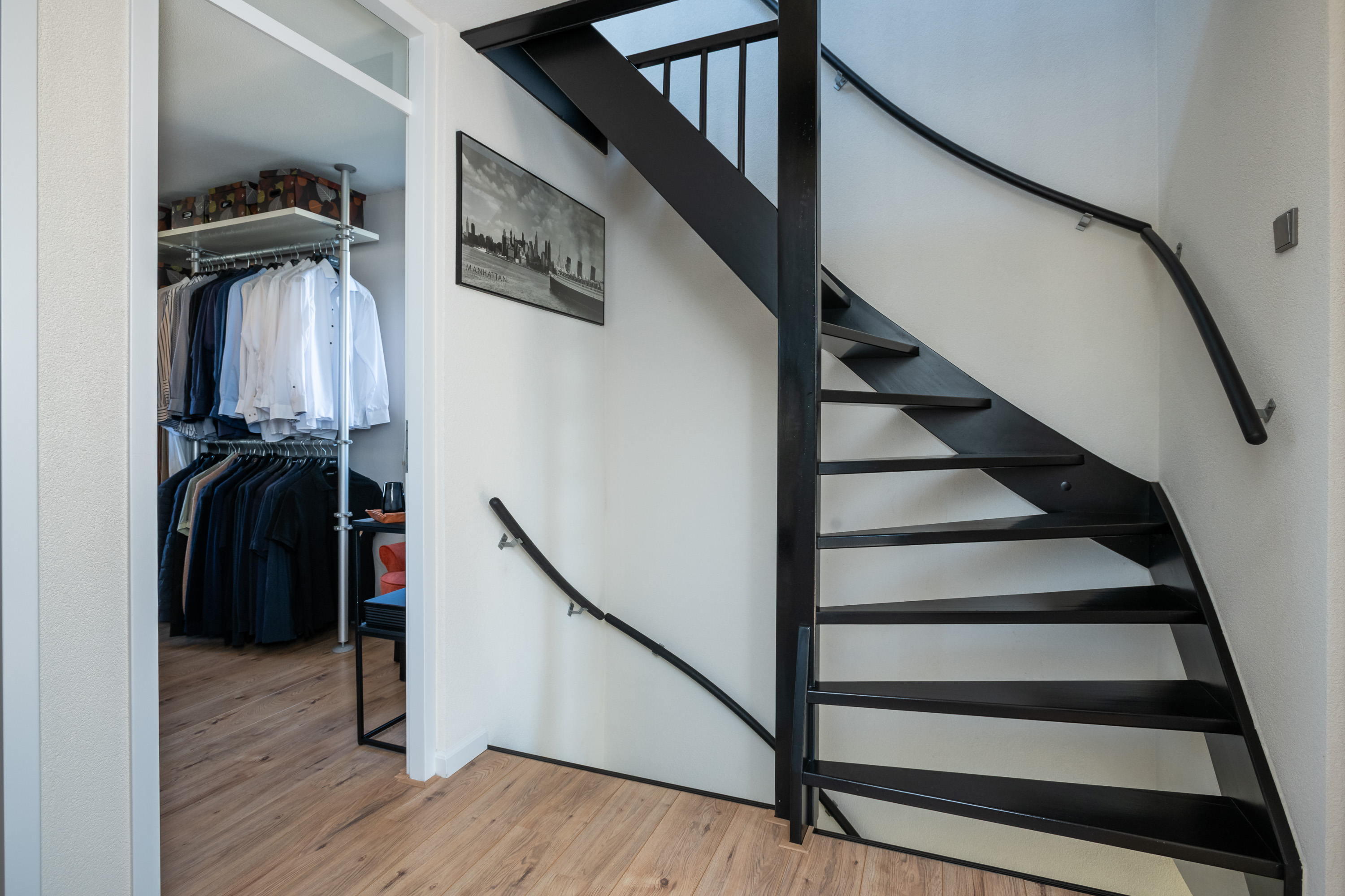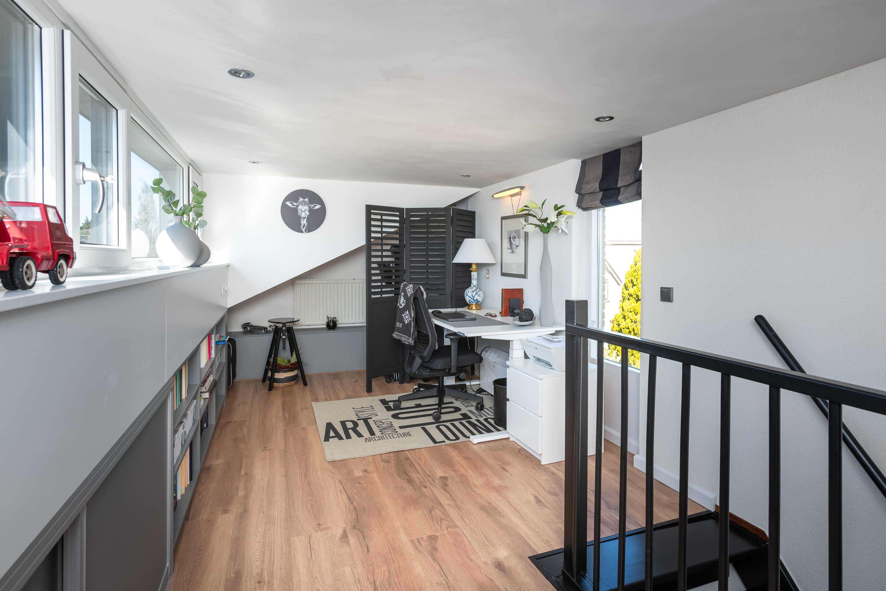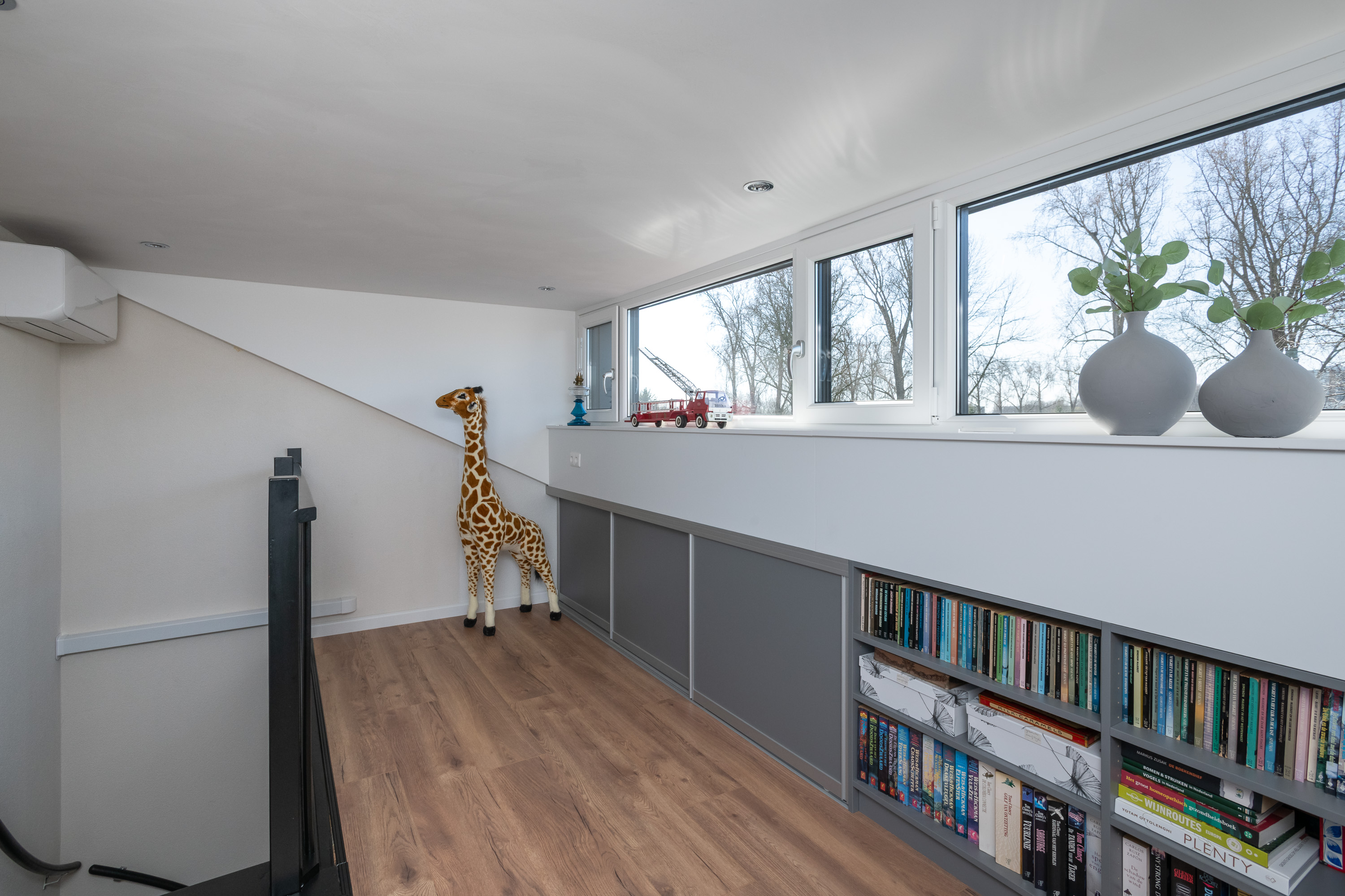 Overloop met een in 2023 geplaatste dakkapel en multifunctionele ruimte met airco/warme lucht, vaste opbergruimte, laminaatvloer en opstelling CV-ketel. Ideale ruimte voor een ‘thuiswerkplek’ of hobbyruimte!