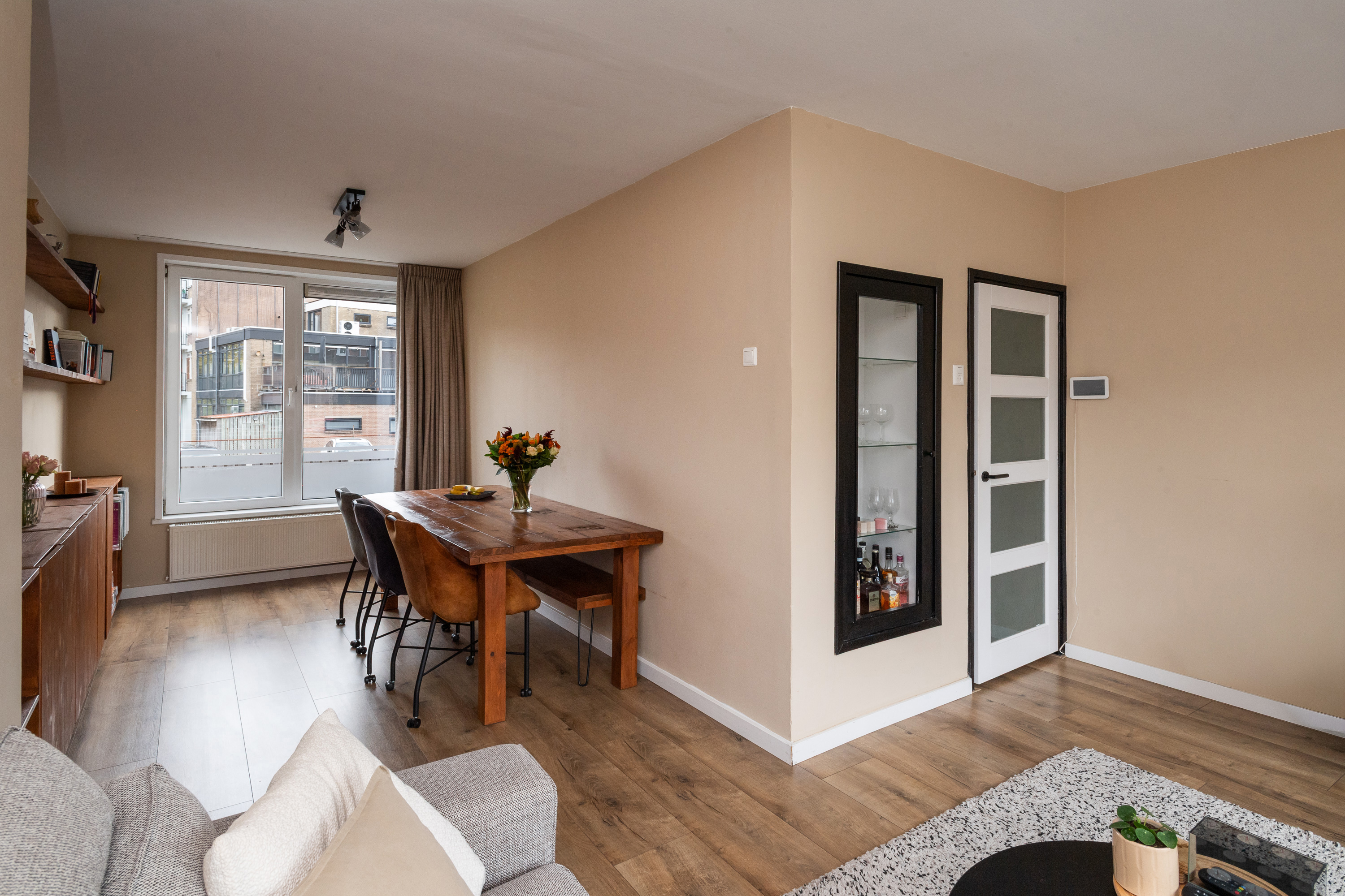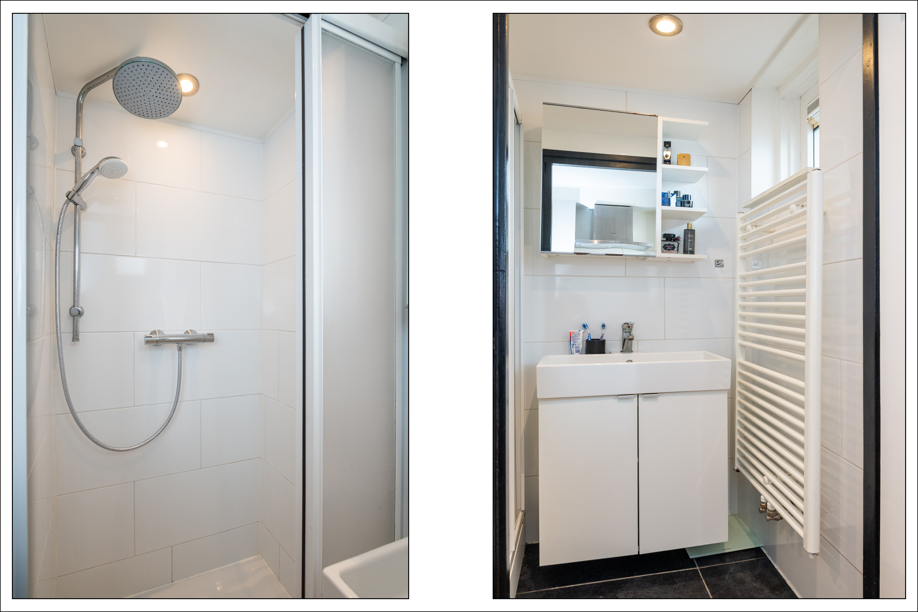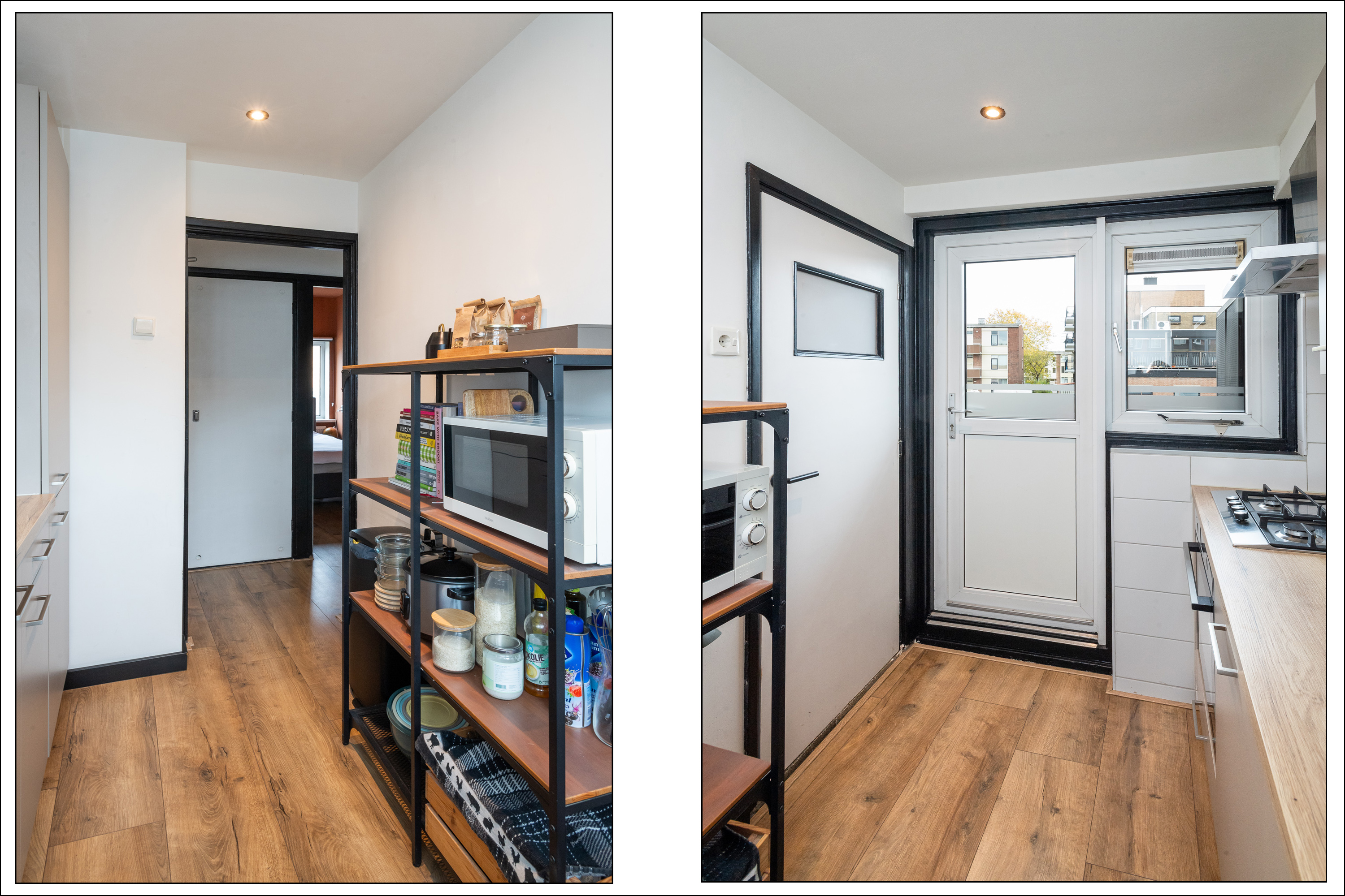Entree met meterkast en gang met toegang tot alle vertrekken in het appartement. Ruime en lichte L-vormige woon-/eetkamer (voorheen 2 kamers) met een laminaatvloer, zijraam, nis met inbouwspots en een strakke wandafwerking. Via de gang bereikt u de overige 2 slaap-/werkkamers. Vanuit de keuken is er toegang tot een betegelde doucheruimte met douche, wastafel en wastafelmeubel.
