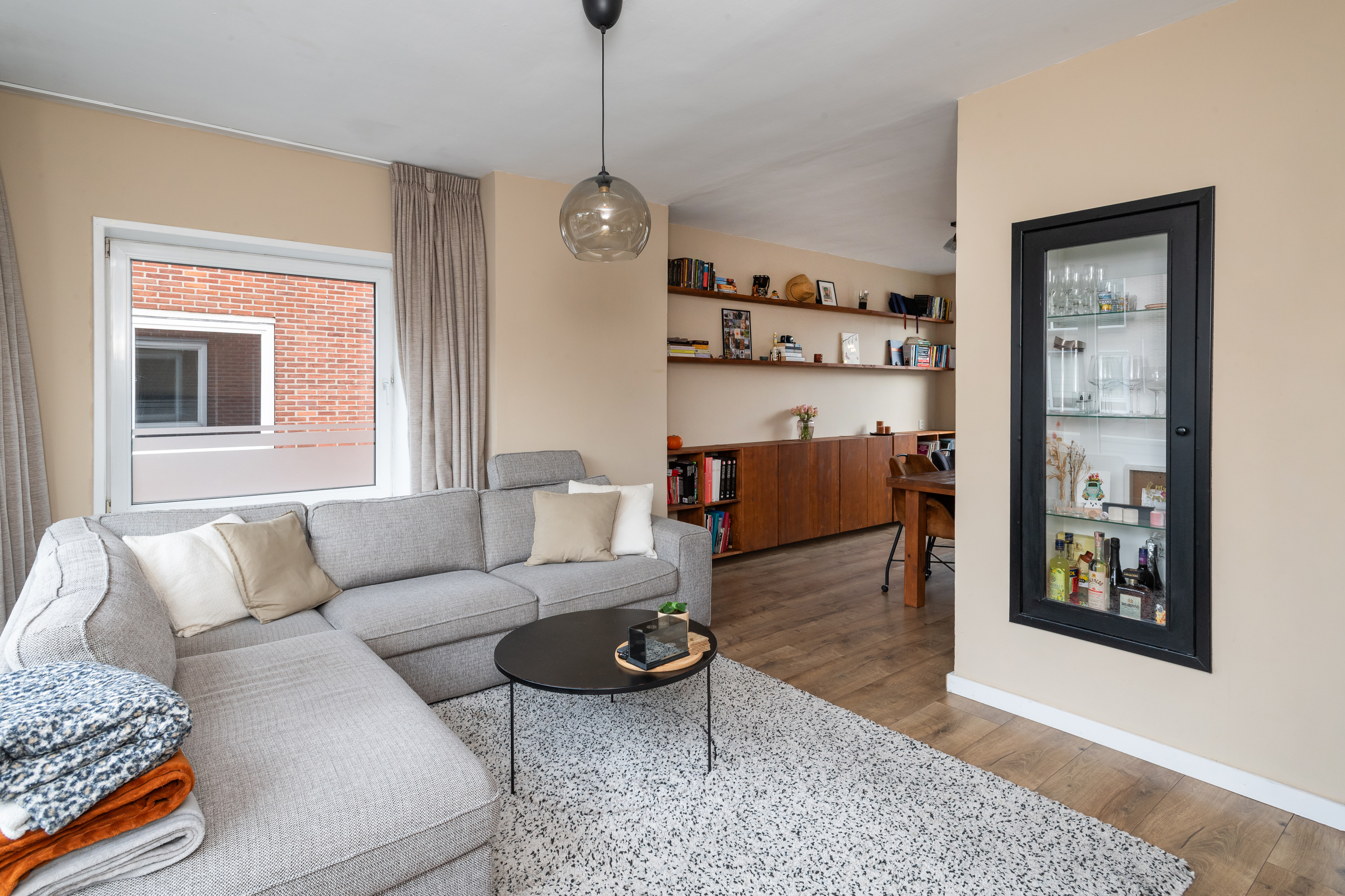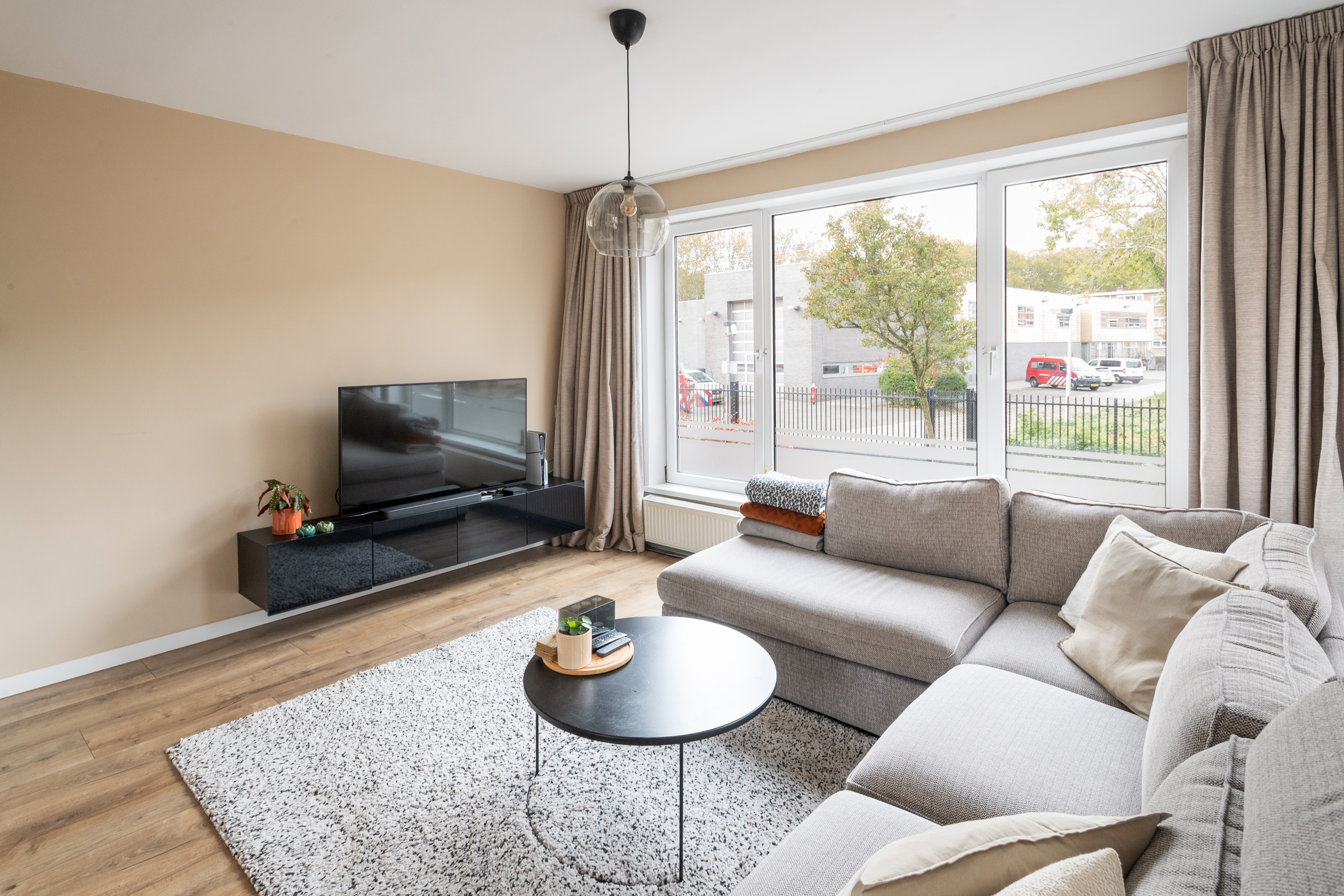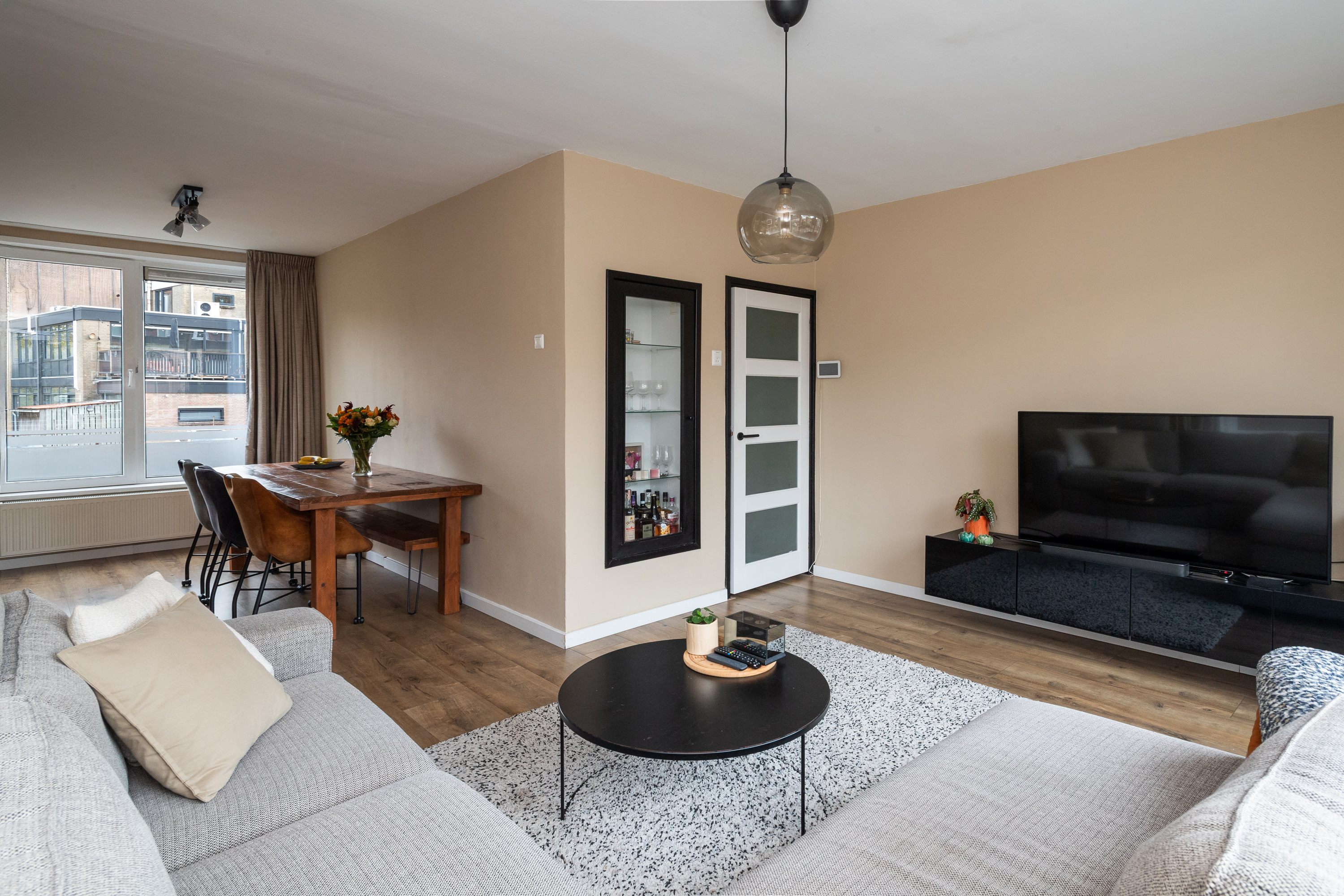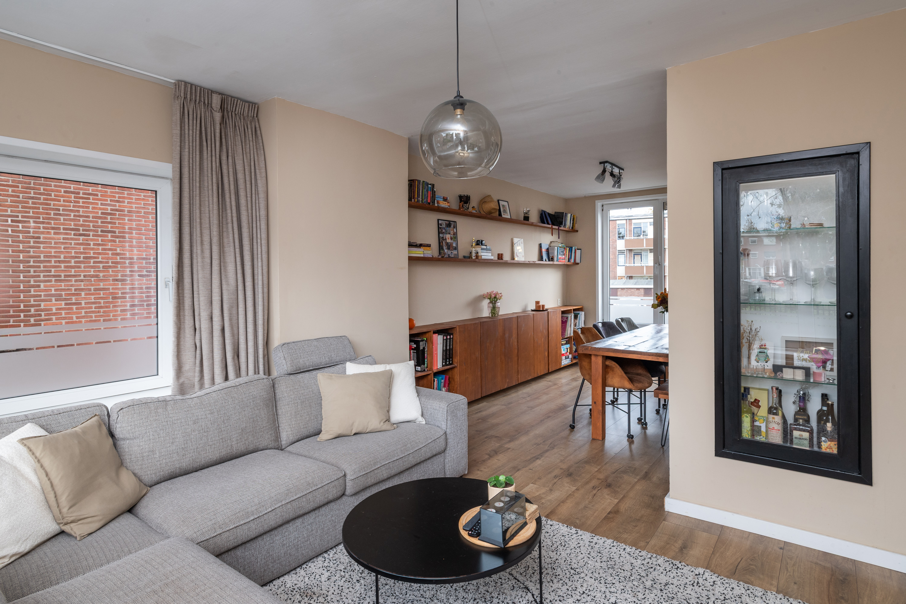 Entree met meterkast en gang met toegang tot alle vertrekken in het appartement. Ruime en lichte L-vormige woon-/eetkamer (voorheen 2 kamers) met een laminaatvloer, zijraam, nis met inbouwspots en een strakke wandafwerking. Via de gang bereikt u de overige 2 slaap-/werkkamers. Vanuit de keuken is er toegang tot een betegelde doucheruimte met douche, wastafel en wastafelmeubel.
