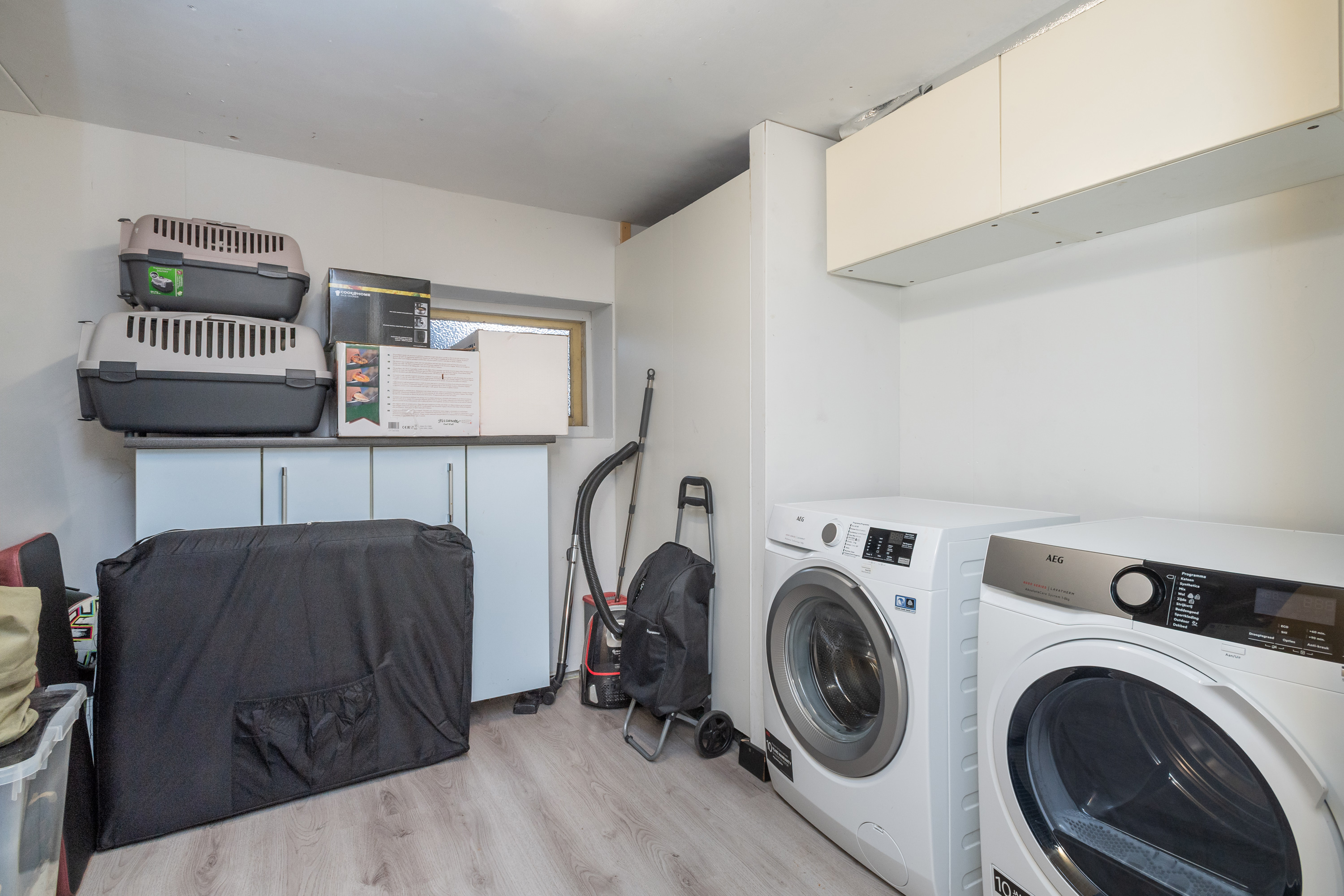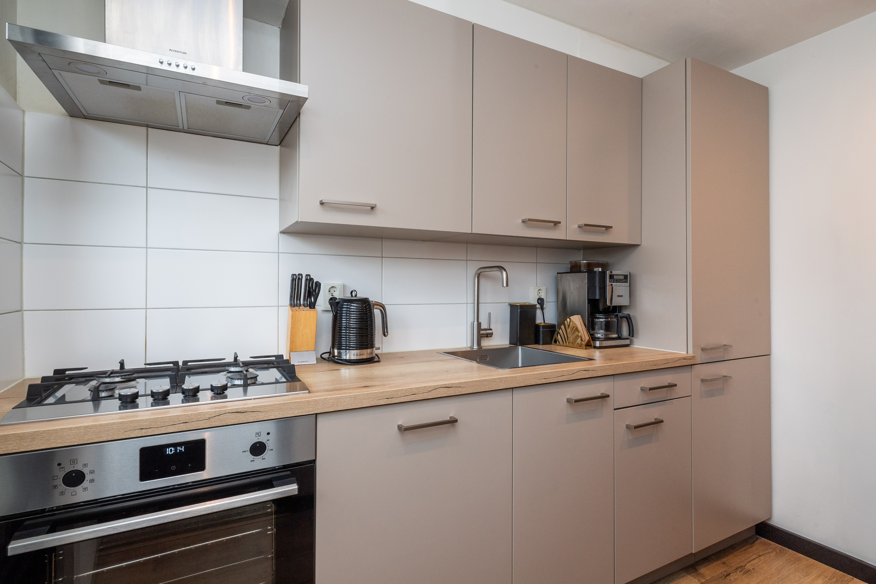 De fraaie keuken is voorzien van (inbouw)-apparatuur waaronder een vaatwasser, oven, gaskookplaat, afzuigkap en een losse koelkast.