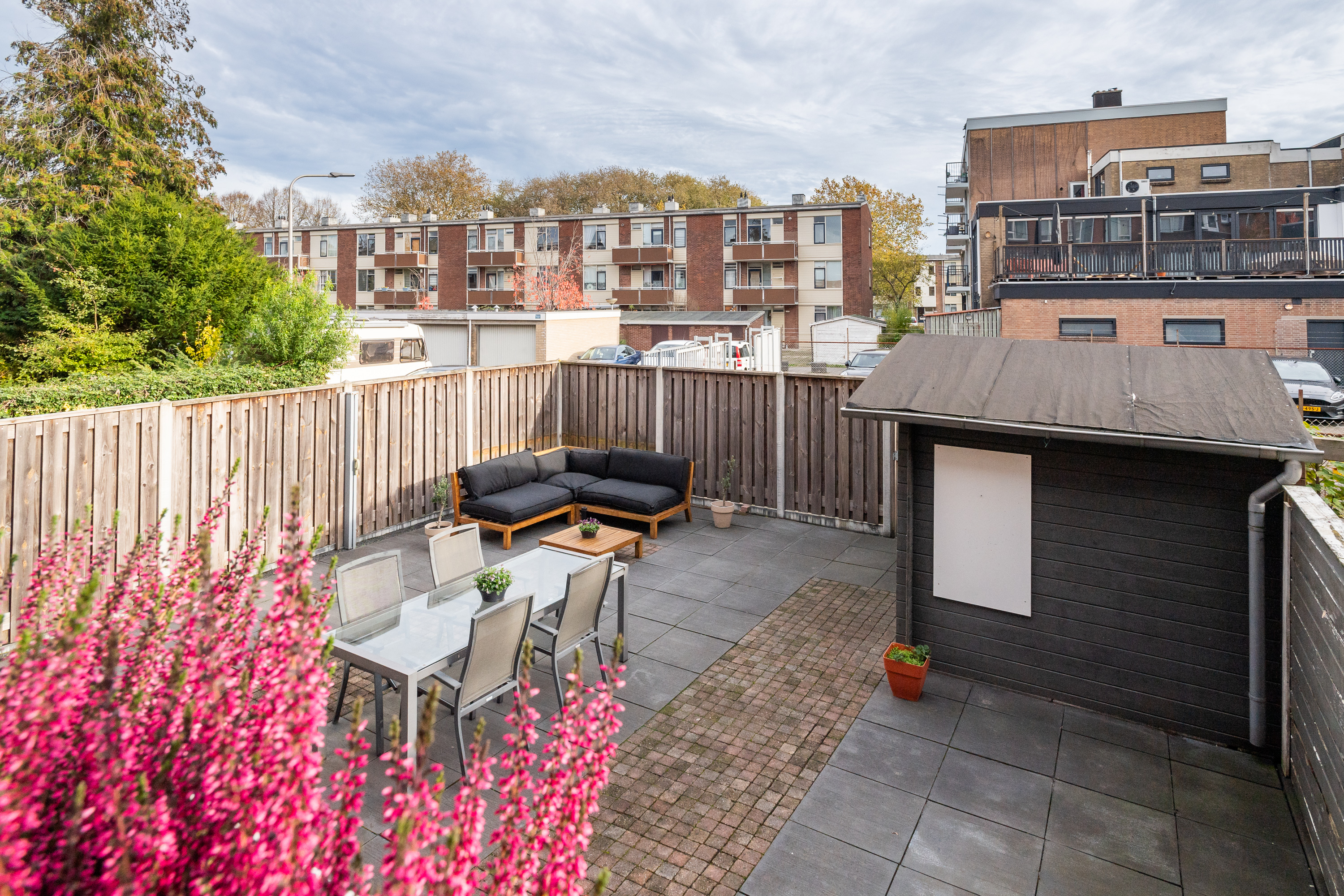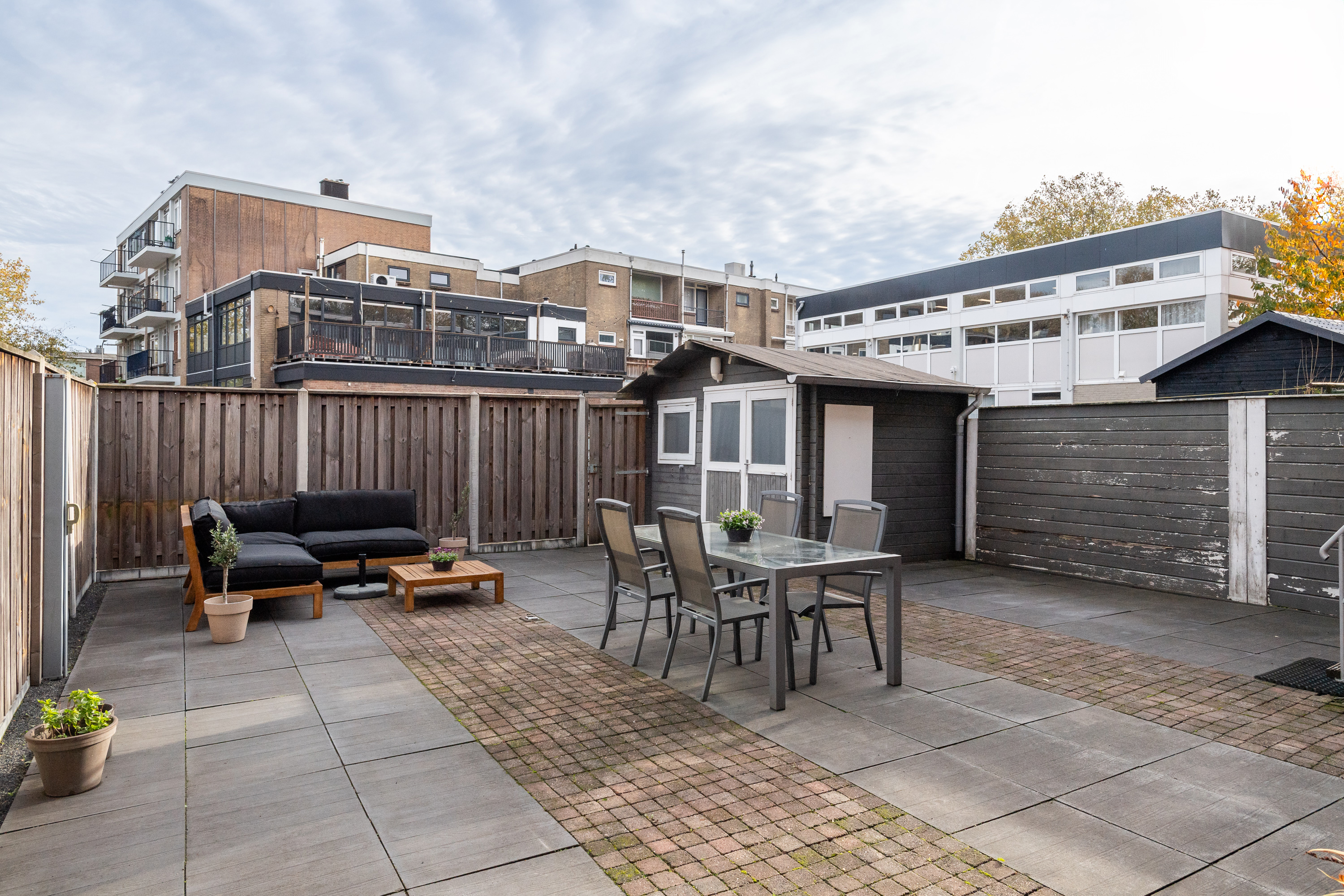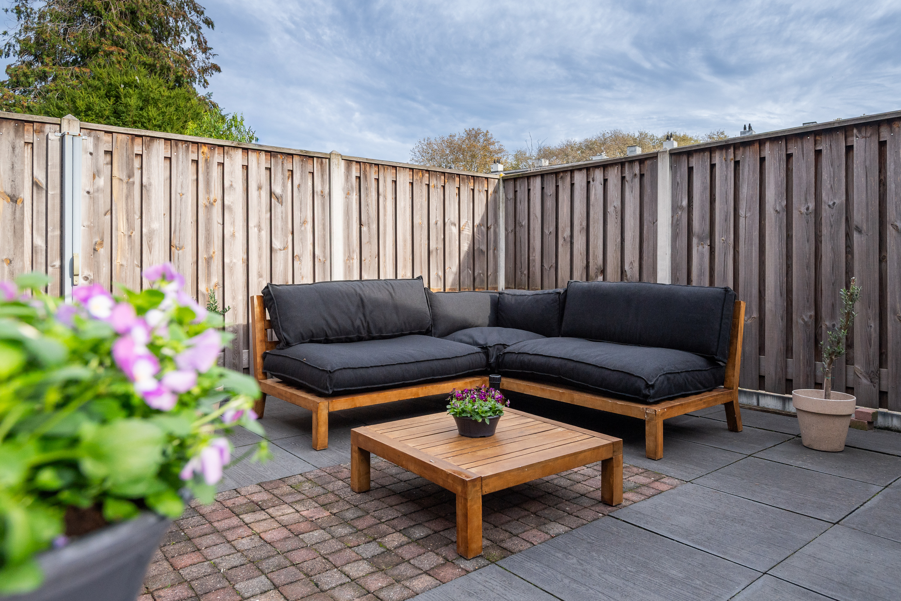 Ruime achtertuin van ca. 10 x 7,5 m. meter met houten schuur, hout-beton schuttingen en een poort.