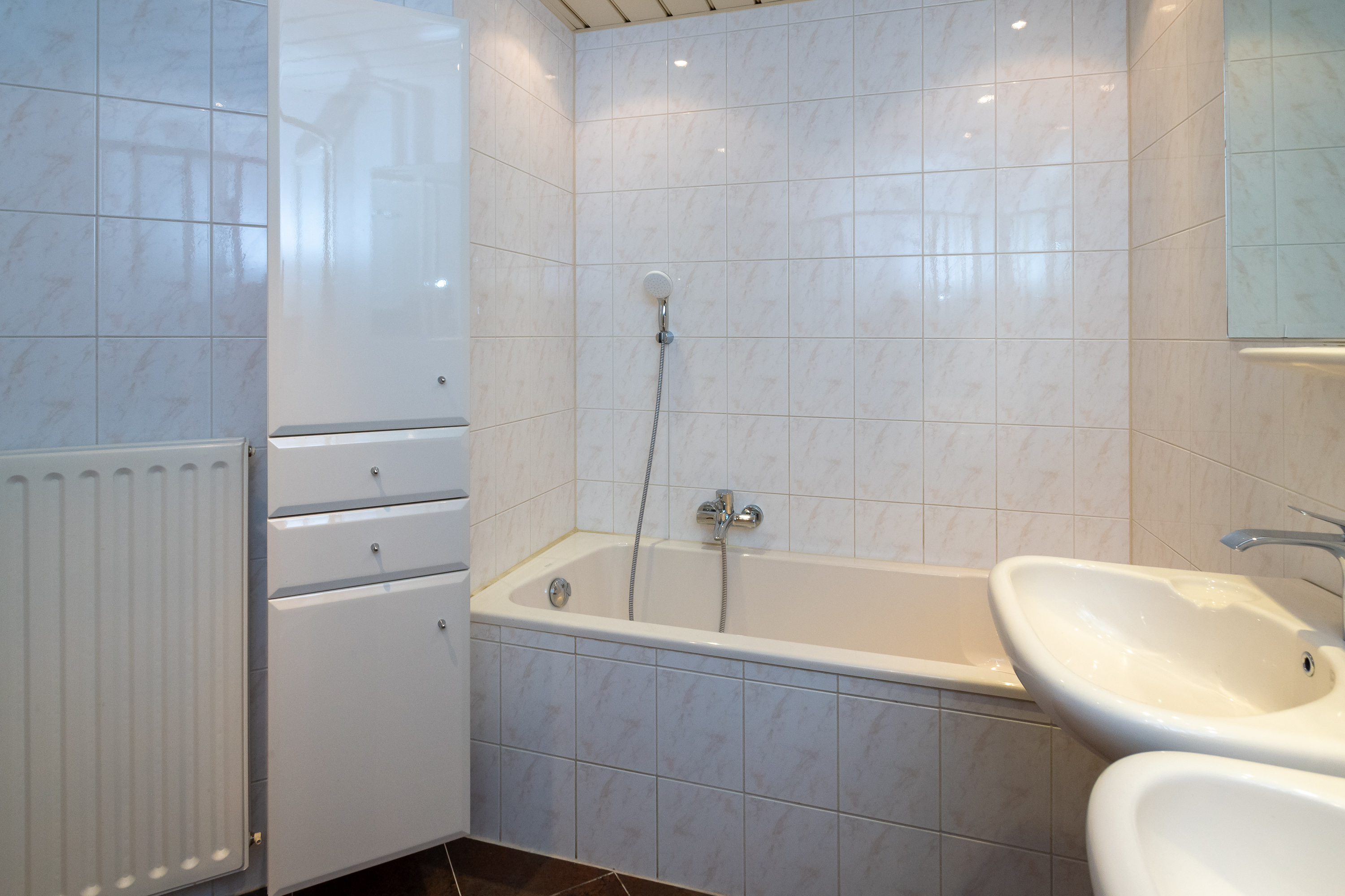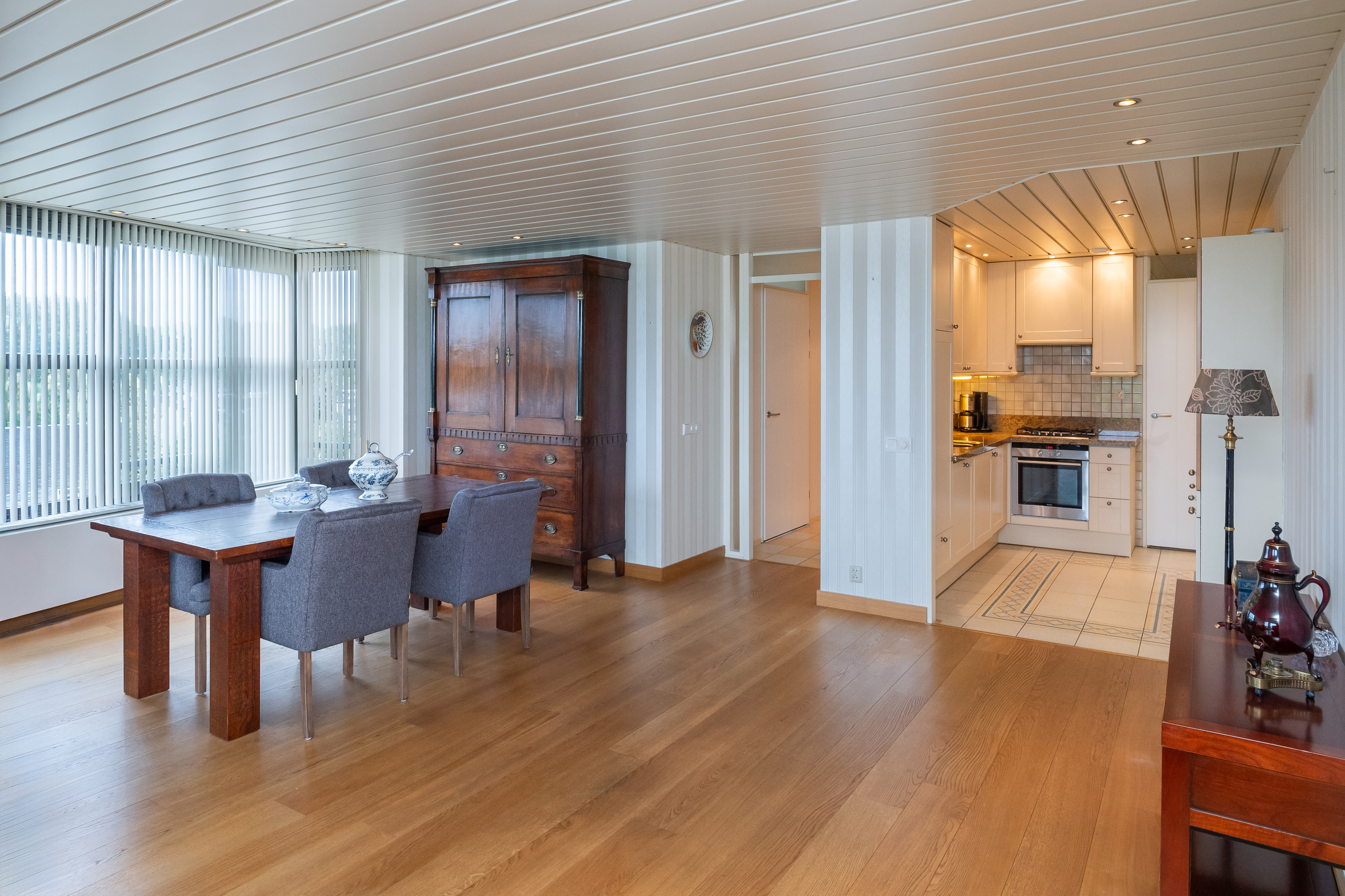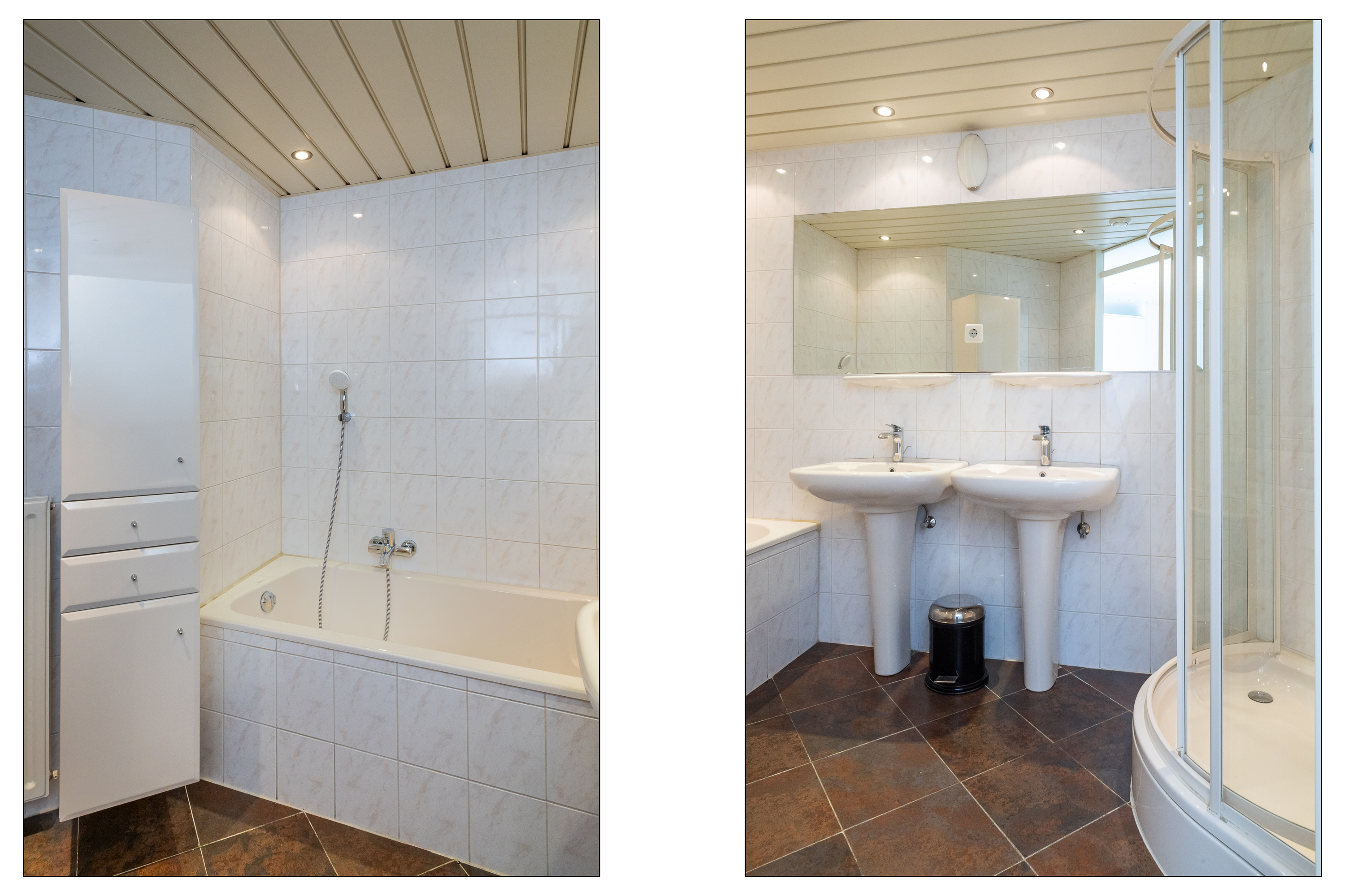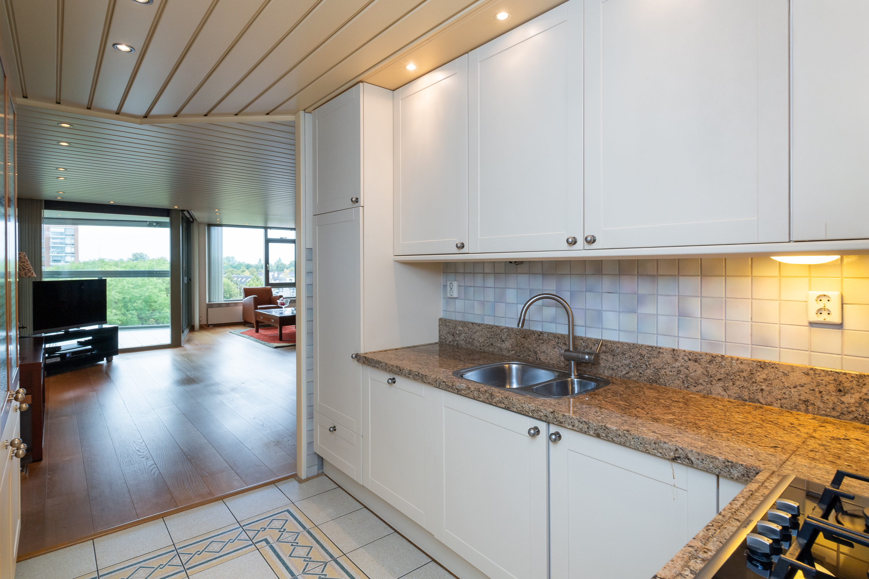 Hal met tegelvloer en toegang tot alle vertrekken. De sfeervolle woonkamer is voorzien van een parketvloer, een plafond met inbouwspots en toegang het inpandige balkon met schuifbeglazing en een screen. Zowel vanuit de woonkamer als vanaf het balkon heeft u een fantastisch vrij uitzicht! De open keuken met tegelvloer is voorzien van een hoekopstelling met een granieten blad en inbouwapparatuur waaronder een gaskookplaat met afzuigkap, oven, vaatwasser (recent vernieuwd, merk Siemens) en koelkast met vriesvak (Siemens). Via de keuken heeft u toegang tot de bijkeuken waar zich de opstelplaats van de CV-combiketel en de wasmachine aansluiting bevindt. De gang biedt verder toegang tot een ouderslaapkamer met een parketvloer en een vaste hoekkast, een 2e slaapkamer met vaste kast en bureau en een 3e slaap-/werkkamer met dito vloer. Toilet met fonteintje. Geheel betegelde badkamer met 2 wastafels met planchetten en grote spiegel, een ligbad, douchecabine, kolomkast en radiator.