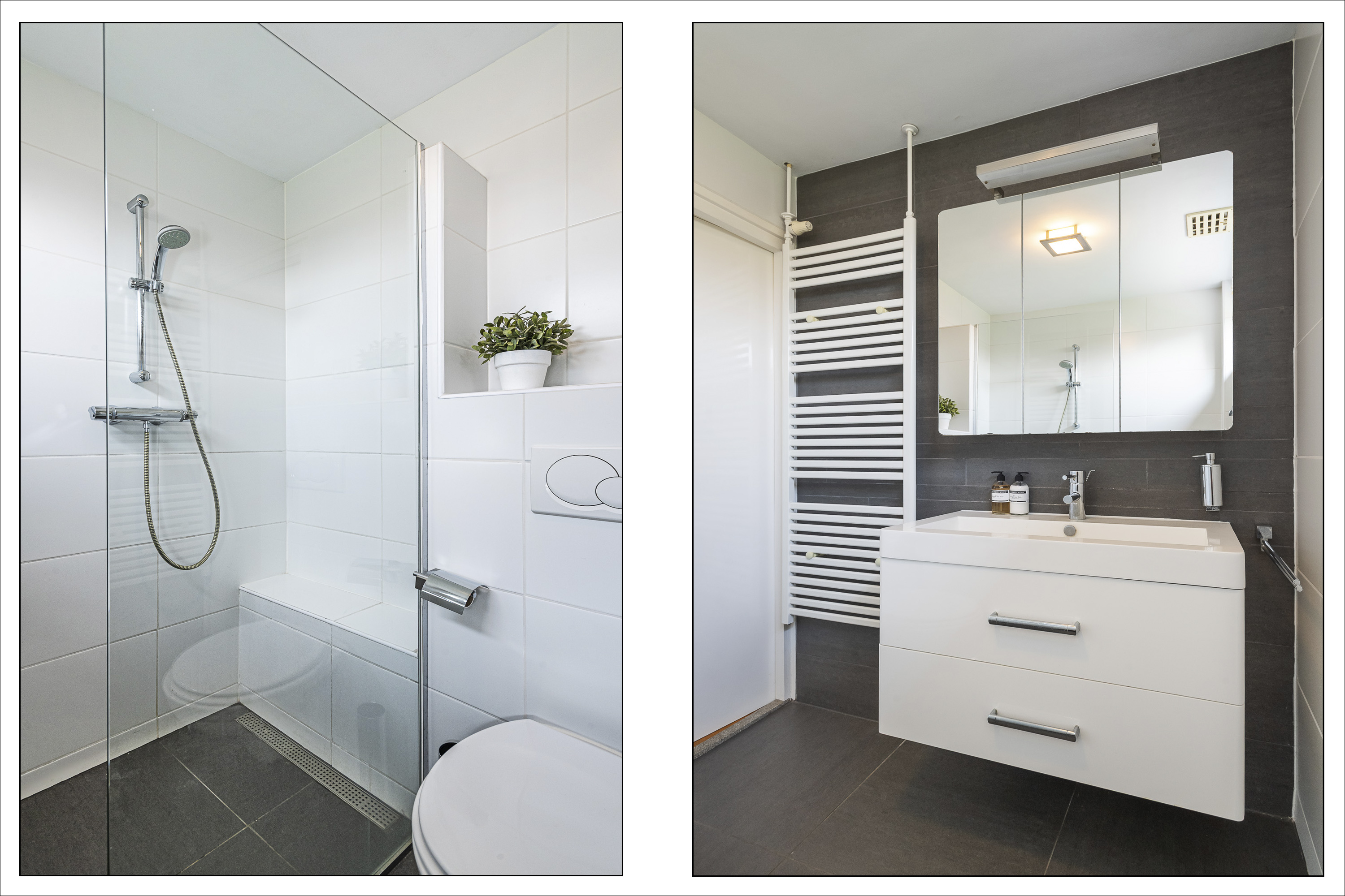 De gemoderniseerde, volledig betegelde badkamer aan de voorzijde beschikt over een inloopdouche met thermostaatkraan en zitje, een tweede toilet, een handdoekradiator en een wastafelmeubel met spiegelkast.