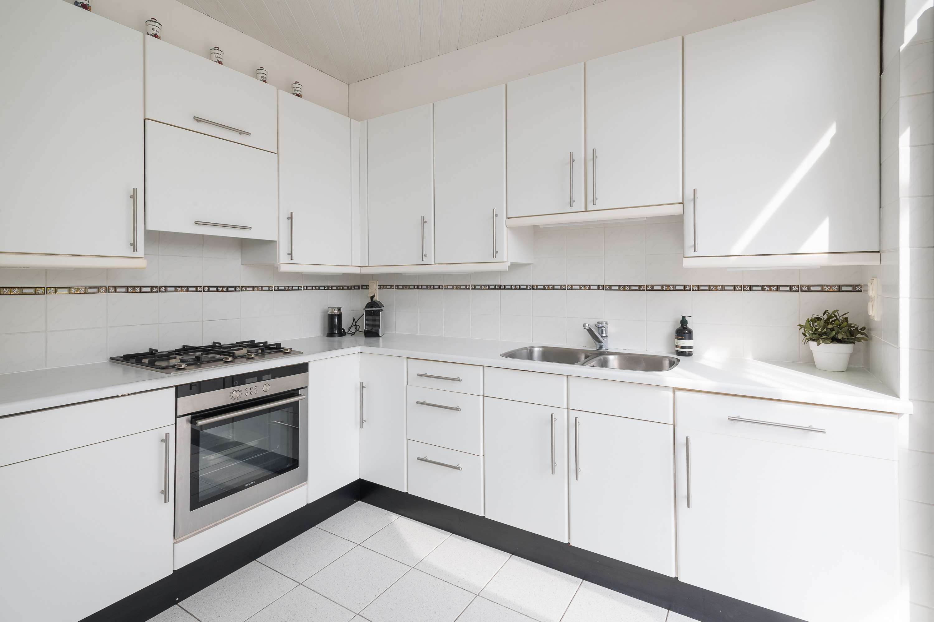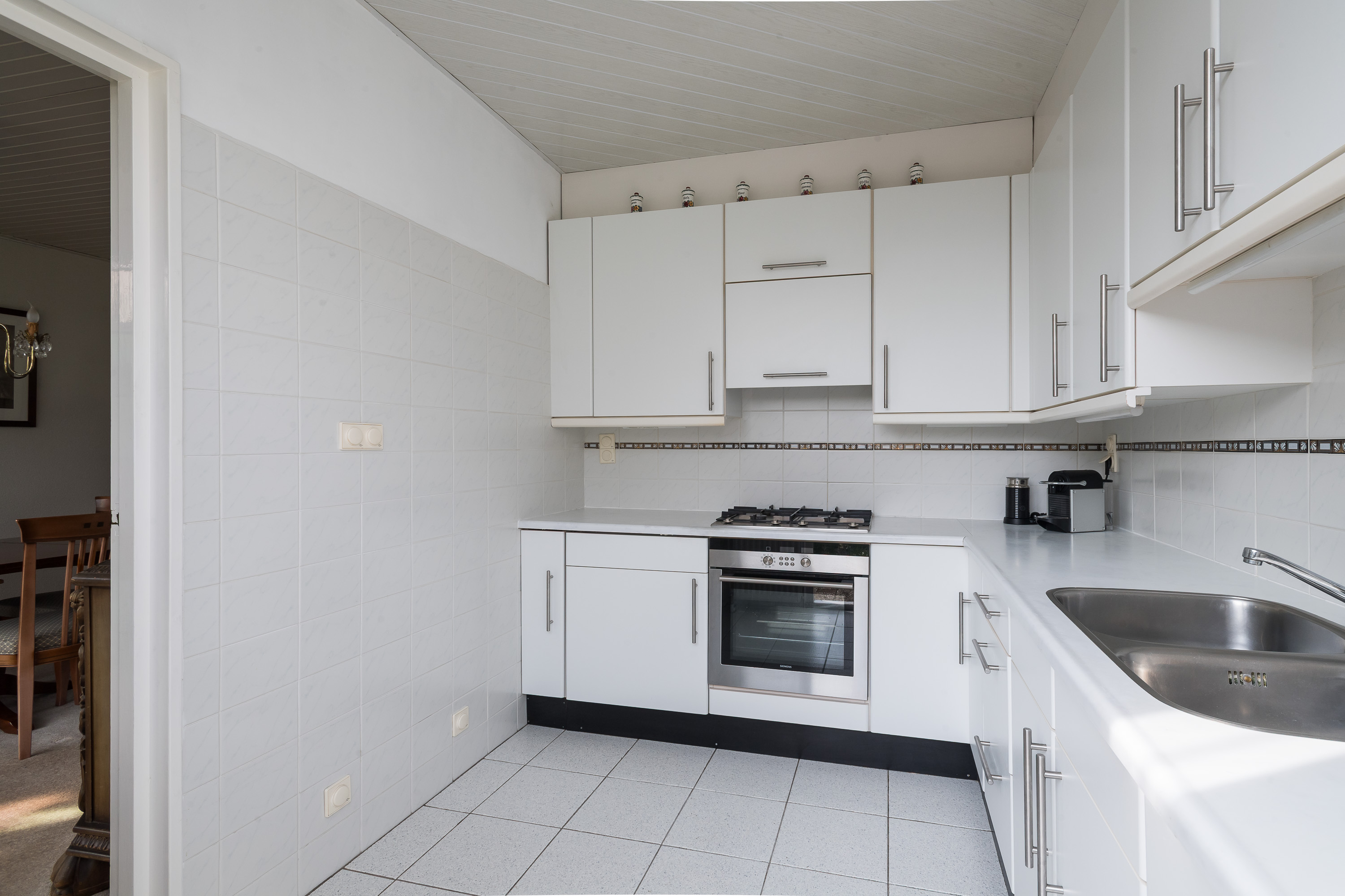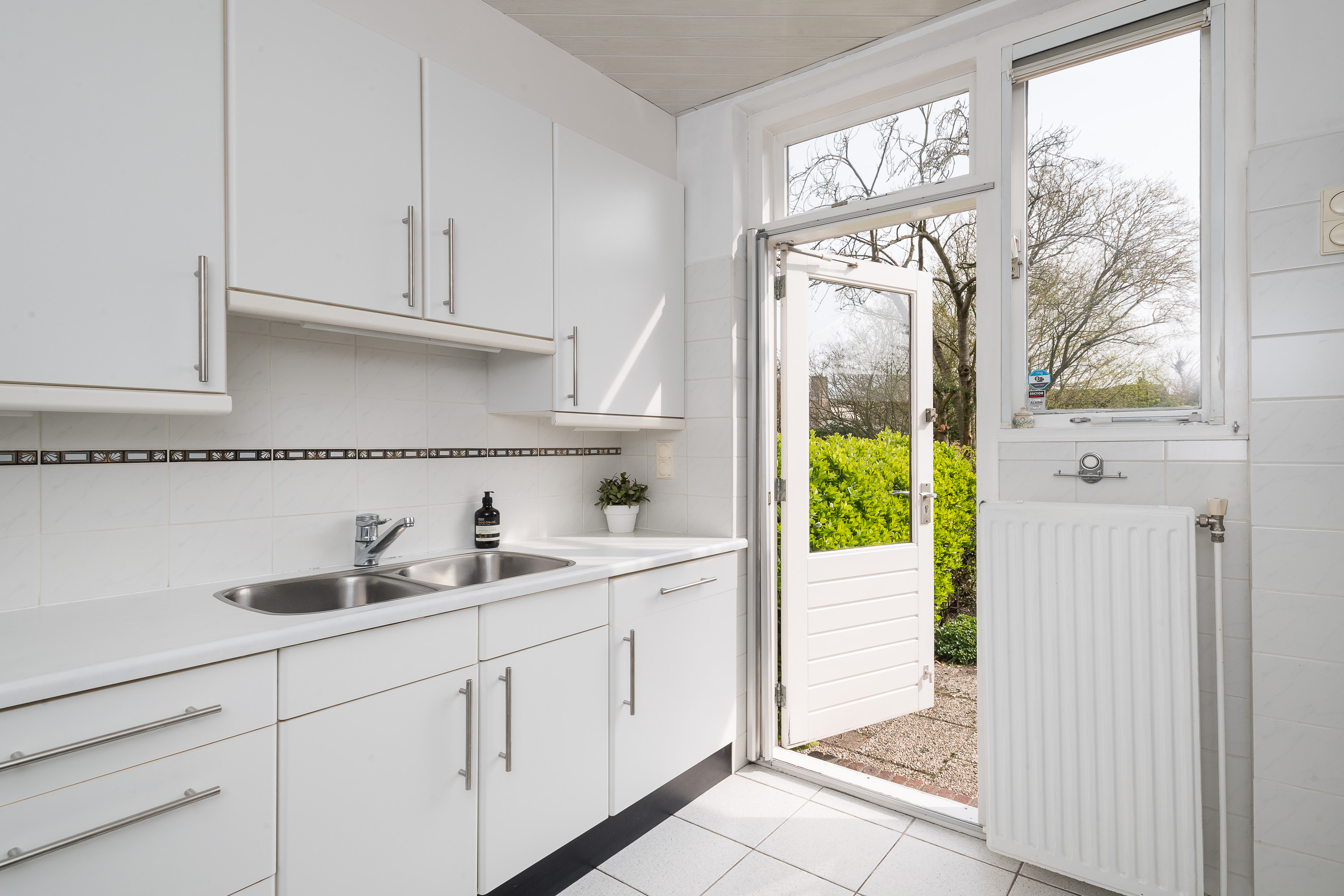 Vanuit de woonkamer bereikt u de separate keuken, die is voorzien van een neutrale hoekopstelling en diverse inbouwapparatuur, waaronder een 4-pits gaskookplaat, koelkast, afzuigkap, oven (2010) en een dubbele spoelbak. Vanuit de keuken is eveneens toegang tot de ruime en vrij gelegen achtertuin. De zeer ruime garage (ca. 10 meter diep) voorzien van een electrische garagedeur is bereikbaar via zowel de voorzijde als de achtertuin en beschikt over elektra en water (gootsteen). Aangrenzend bevindt zich een berging met de wasmachineaansluiting en de opstelplaats van de cv-combiketel.