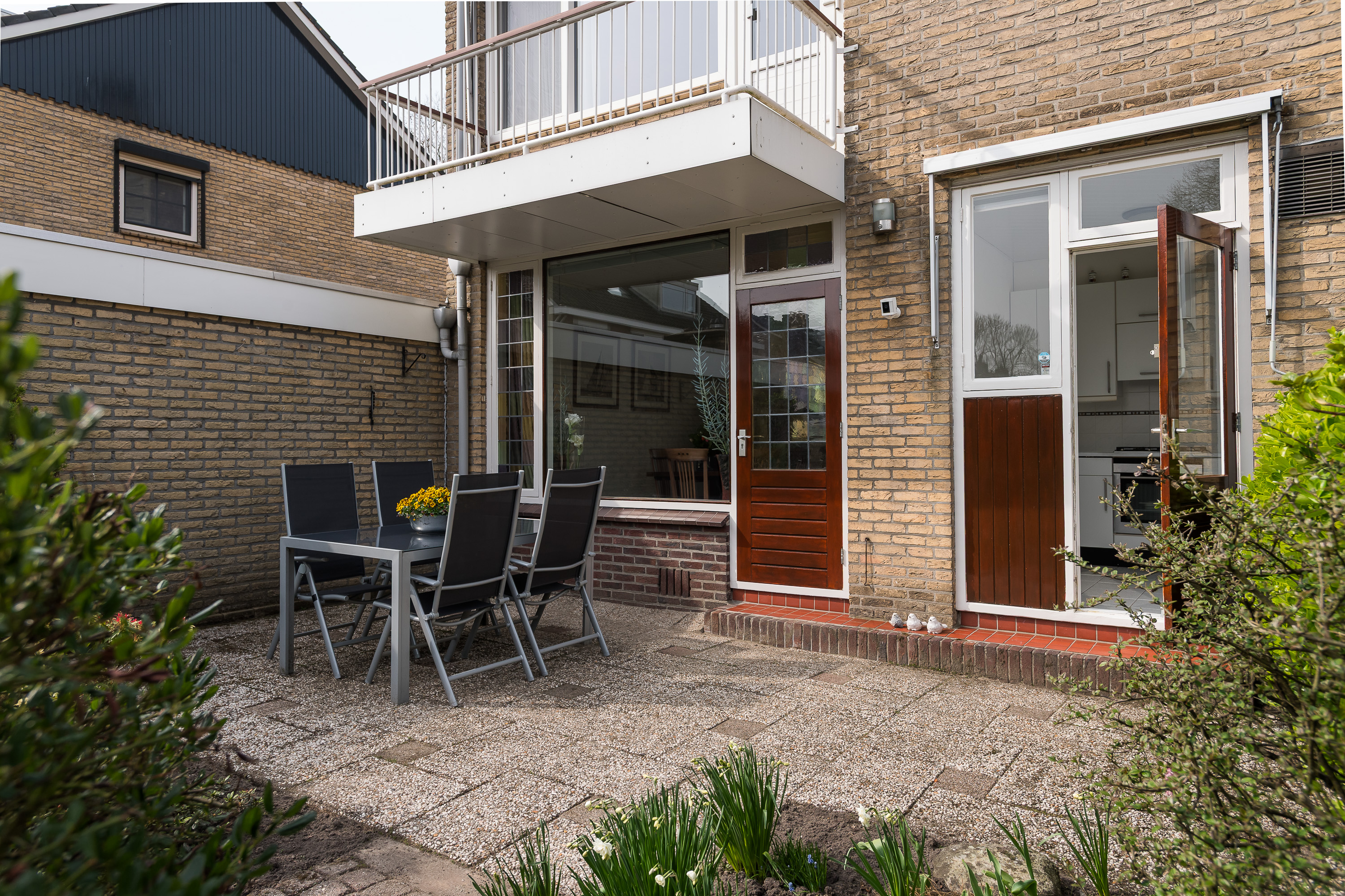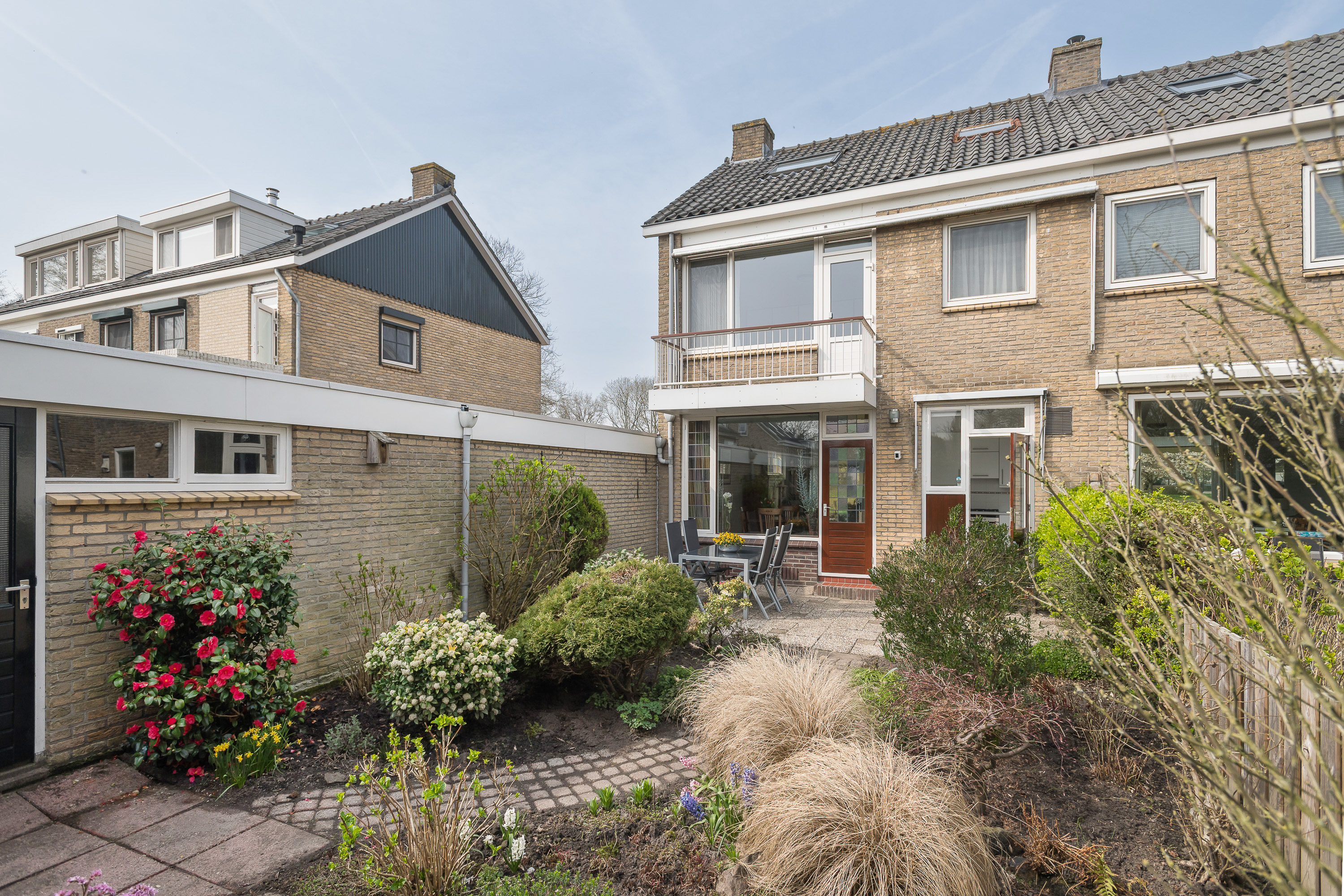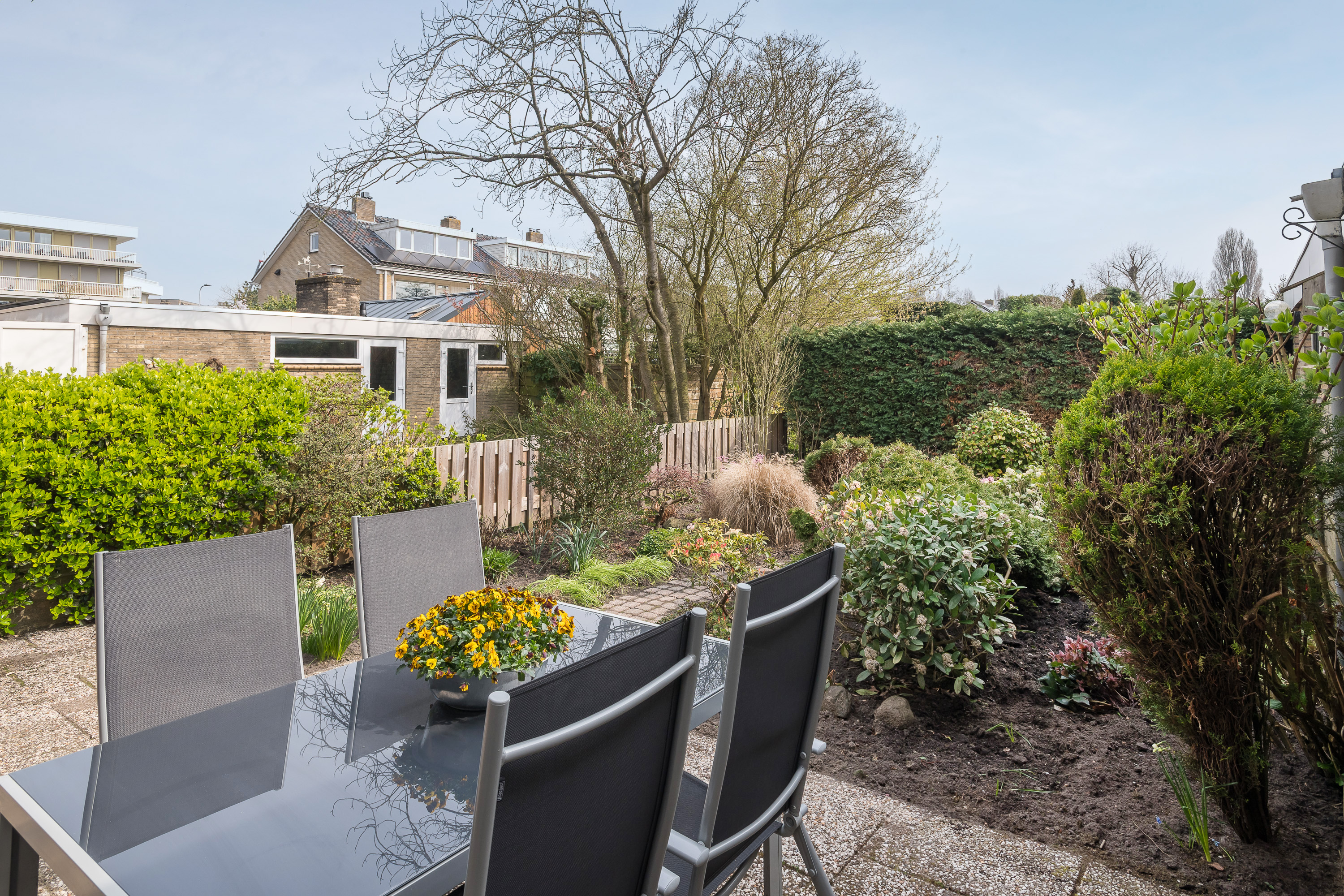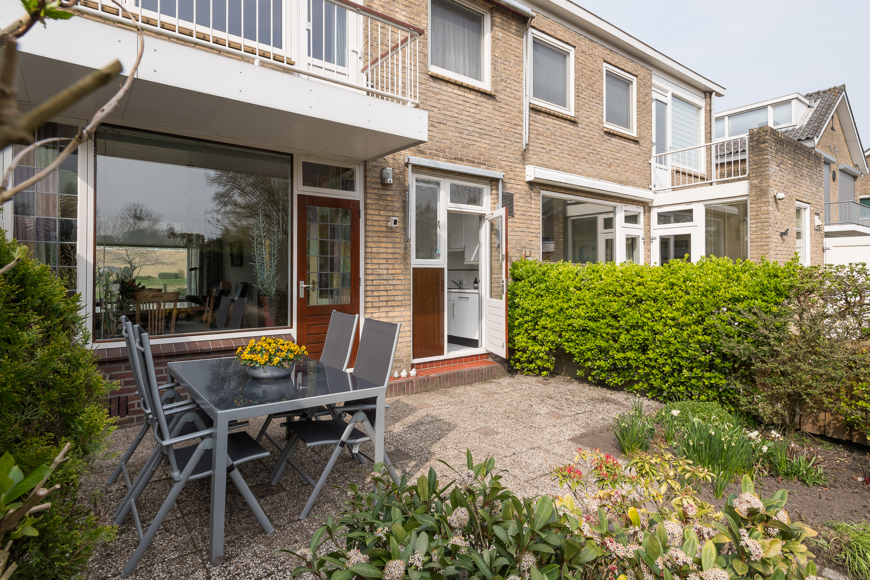 De voor- en achtertuin zijn netjes onderhouden en een heerlijke plek om te ontspannen. De besloten achtertuin van ca. 12 meter diep en 6 meter breed ligt op het zuidoosten, waardoor u veel privacy en rust ervaart. Voor de keuken is een zonnescherm geplaatst.