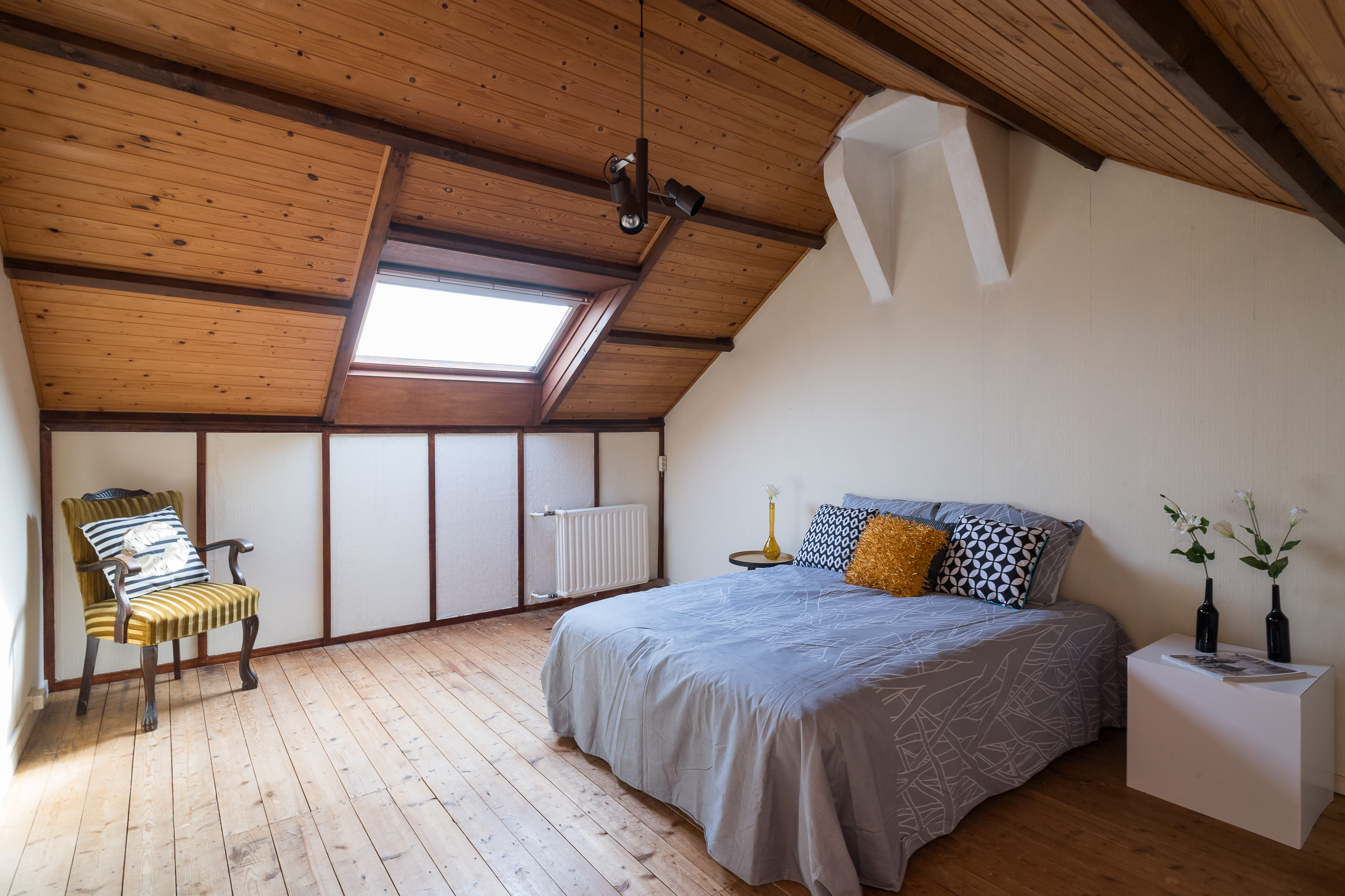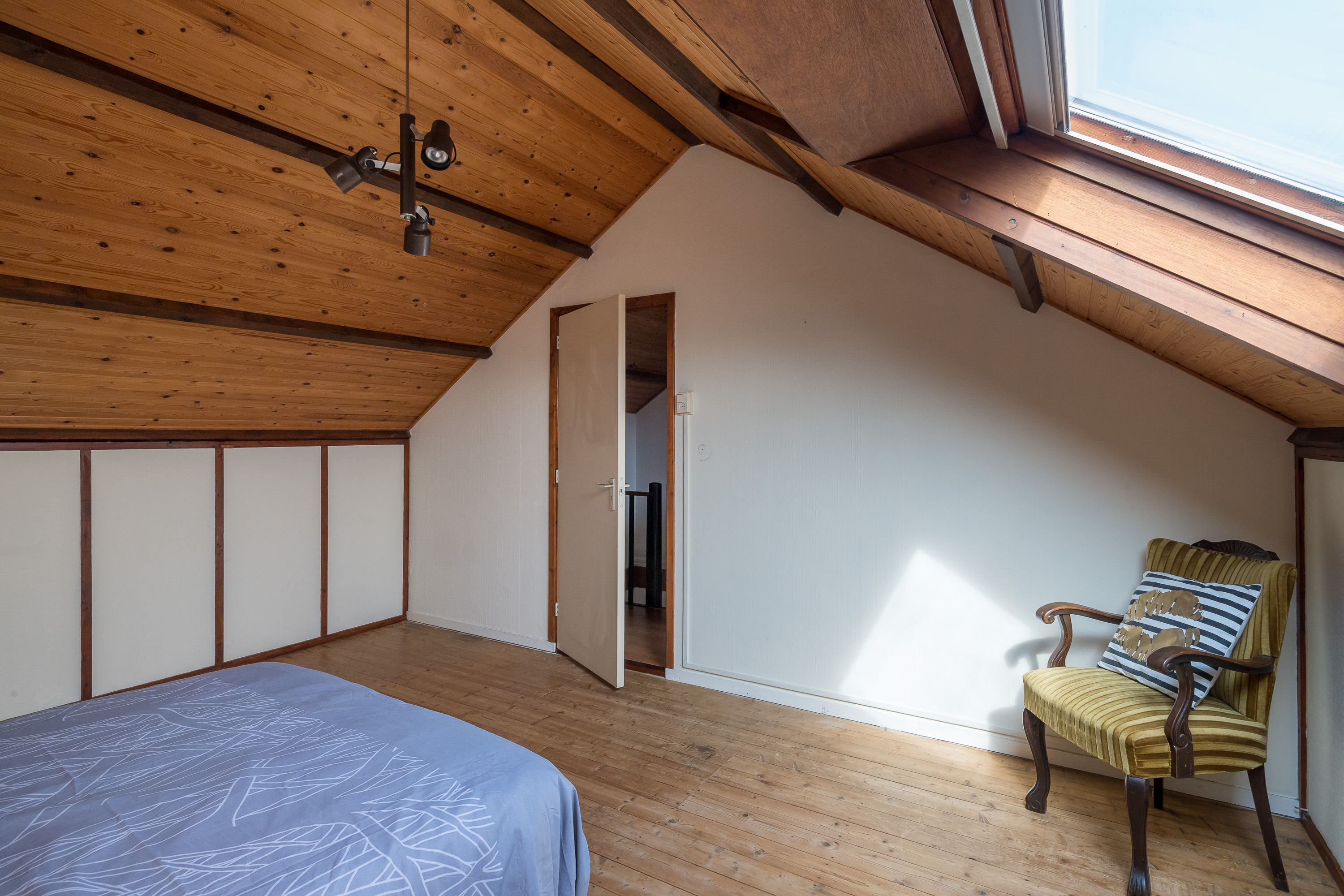 De vierde slaapkamer van ca. 4,6 bij 3,6 meter is ruim van opzet en voorzien van een groot dakraam en praktische bergruimte achter de knieschotten.