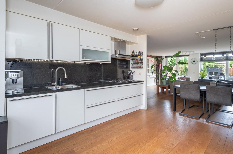 Entree, hal met luxe antraciet tegelvloer, meterkast en trapopgang naar de eerste verdieping. Geheel betegelde toiletruimte met zwevend toilet en fonteintje. Vanuit de hal bereikt u de sfeervolle tuingerichte en royale living met veel lichtinval, een parketvloer, airco, radiatorbekleding, een luxe ingerichte open keuken met een opstelling aan 2 zijden voorzien van granietenbladen en -achterwand en uitgebreide inbouwapparatuur waaronder een 5-pits gaskookplaat, afzuigkap, magnetron, oven, vaatwasser, grote koelkast en grote vriezer. Vaste opbergkast onder de trap. Vanuit de woonkamer bereikt u via openslaande deuren de mooi aangelegde achtertuin met een elektrisch bedienbaar zonnescherm aan de achtergevel, twee houten schuren en een poort naar een achterom.
