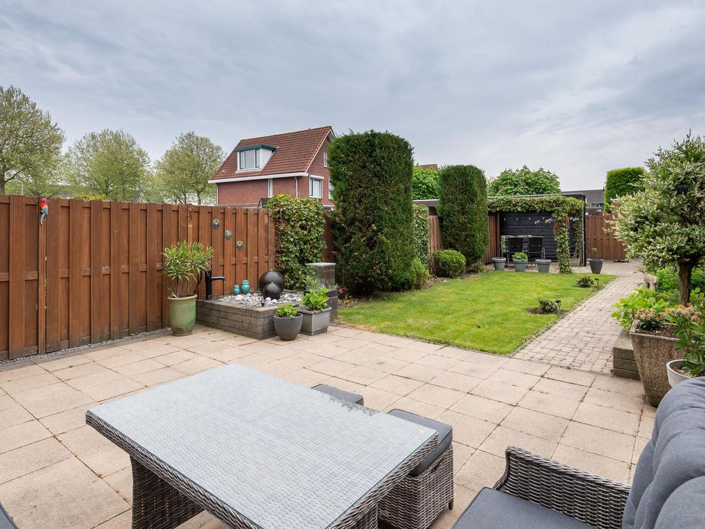 Zeer diepe, mooi aangelegde achtertuin op het Zuid-Oosten met houten schuren en poort naar een achterom.
