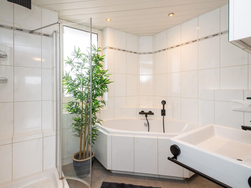 Overloop met trapopgang naar de tweede verdieping en toegang tot de 3 slaapkamers. De ouderslaapkamer is voorzien van airco. Geheel, modern betegelde badkamer met een hoekbad met zwarte thermostaat kraan en handdouche, sfeerverlichting, een douchecabine met zwarte thermostaatkraan met regendouche en handdouche, een wastafel met spiegelkast, handdoekenradiator en een 2e (zwevend) toilet.
