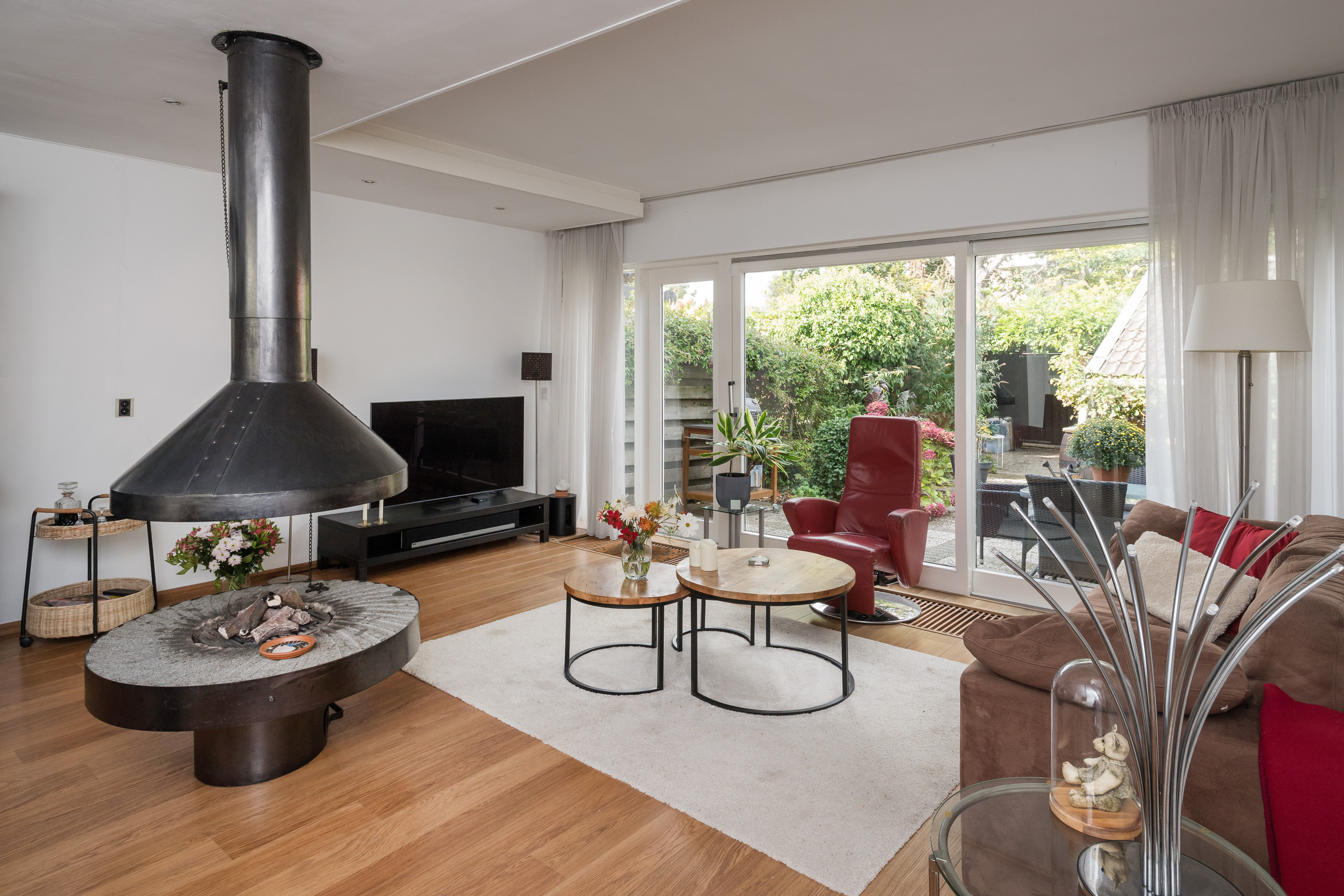 Voordeur met luifel, entree/gang met tegelvloer, meterkast, opbergkast, trapopgang naar de eerste verdieping en toegang tot een moderne toiletruimte met fonteintje. Toegang tot de gezellige, tuingerichte woonkamer met een open haard convectorput en schuifpui naar de zeer vrij gelegen achtertuin gelegen op het Westen met een schuur en achterom. De moderne eilandkeuken bevindt zich aan de voorzijde met een spoeleiland en een wand-keukenblok met inbouwapparatuur waaronder een 5-pits gaskookplaat, afzuigkap, combi- oven, vaatwasser (Miele), koelkast, 3-vriesladen en opbergruimte. De keuken tuingerichte, uitgebouwde woonkamer met imposante gas-open haard, convectorverwarming, laminaatvloer, plafond met inbouwspots. De hal biedt via een vaste trap toegang tot de 1e verdieping.