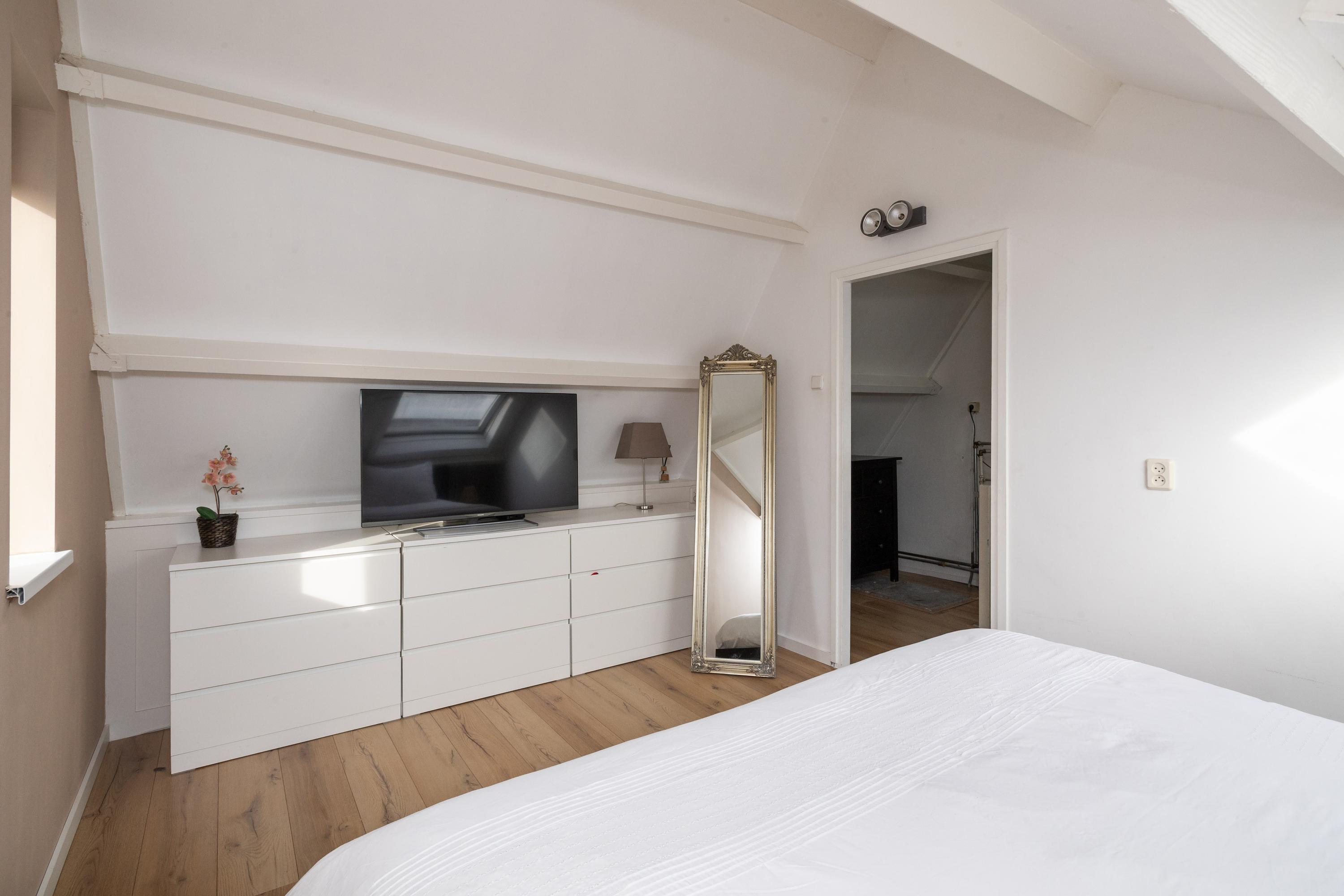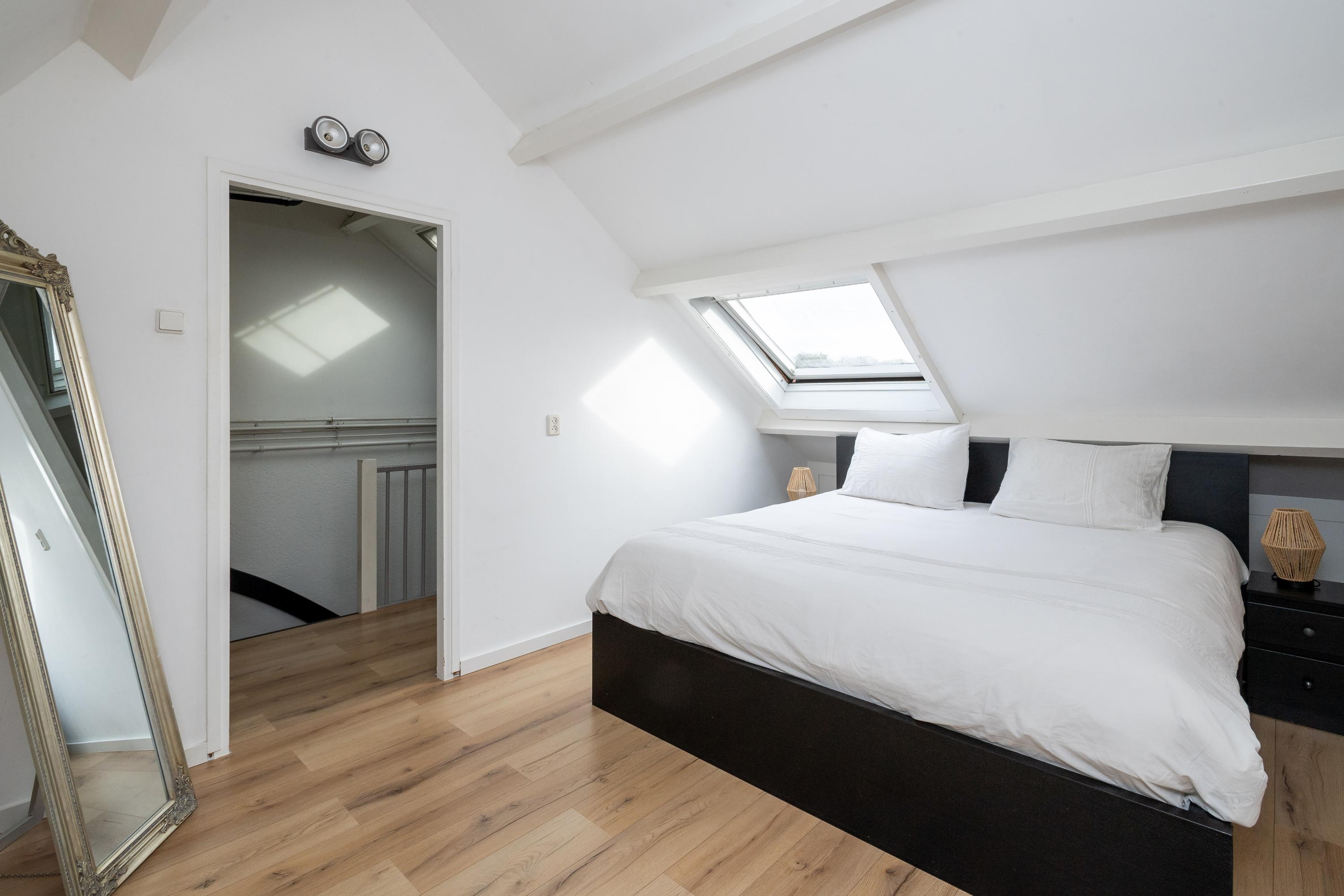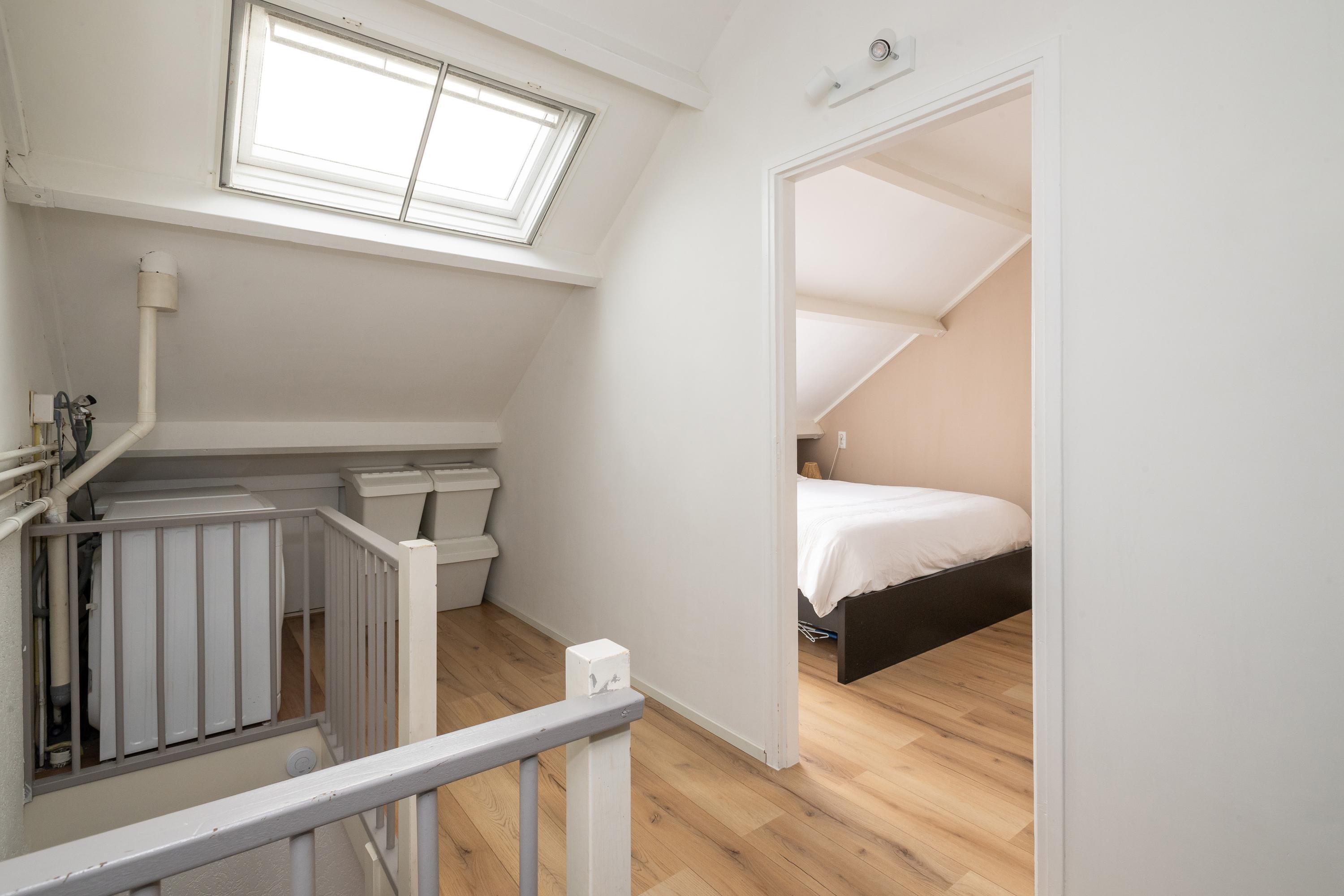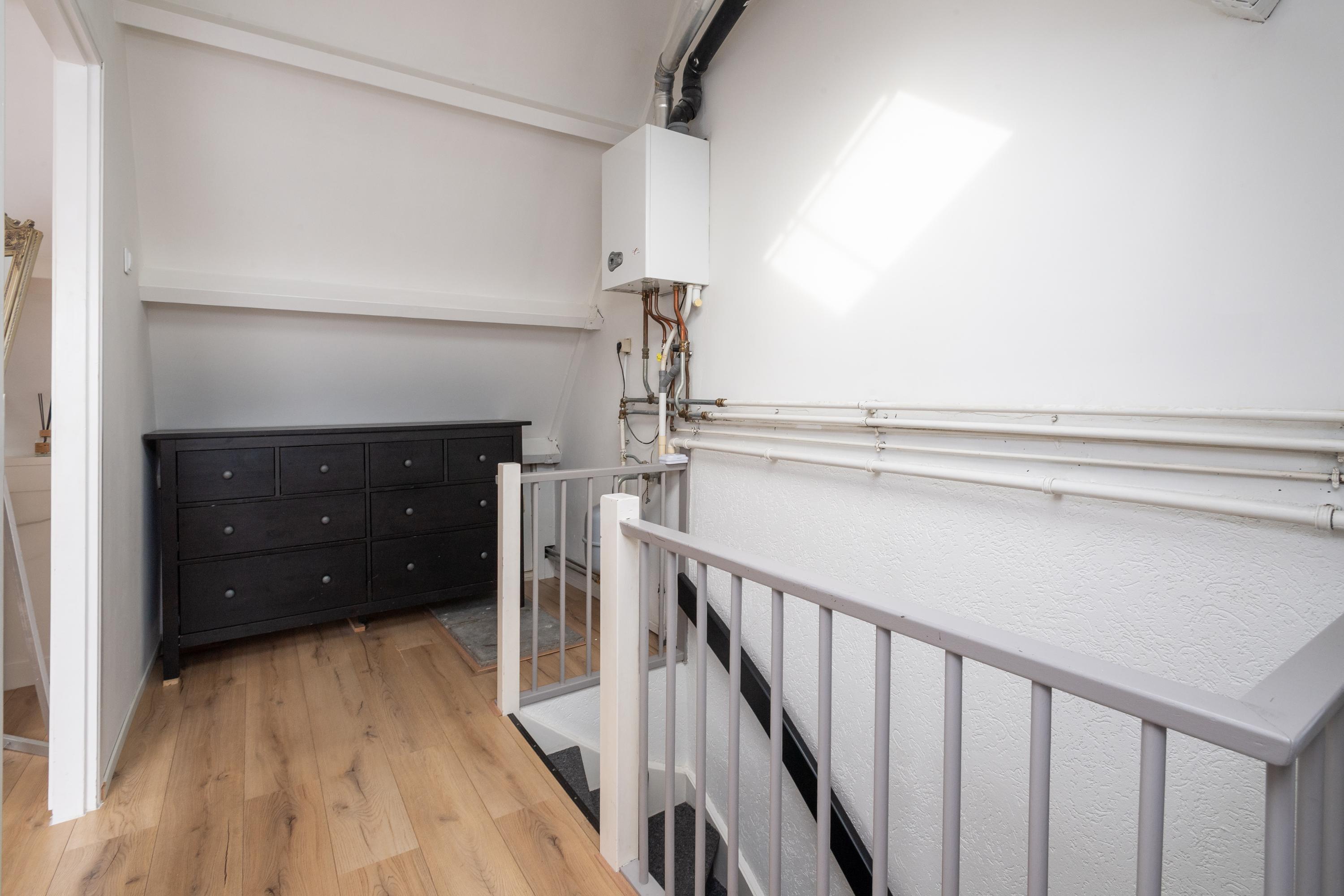 Overloop met de opstelplaats van de CV-combiketel en de wasmachineaansluiting. Toegang tot een ruime, 4e slaapkamer met een dakraam, zijraam en bergruimte achter knieschotten.