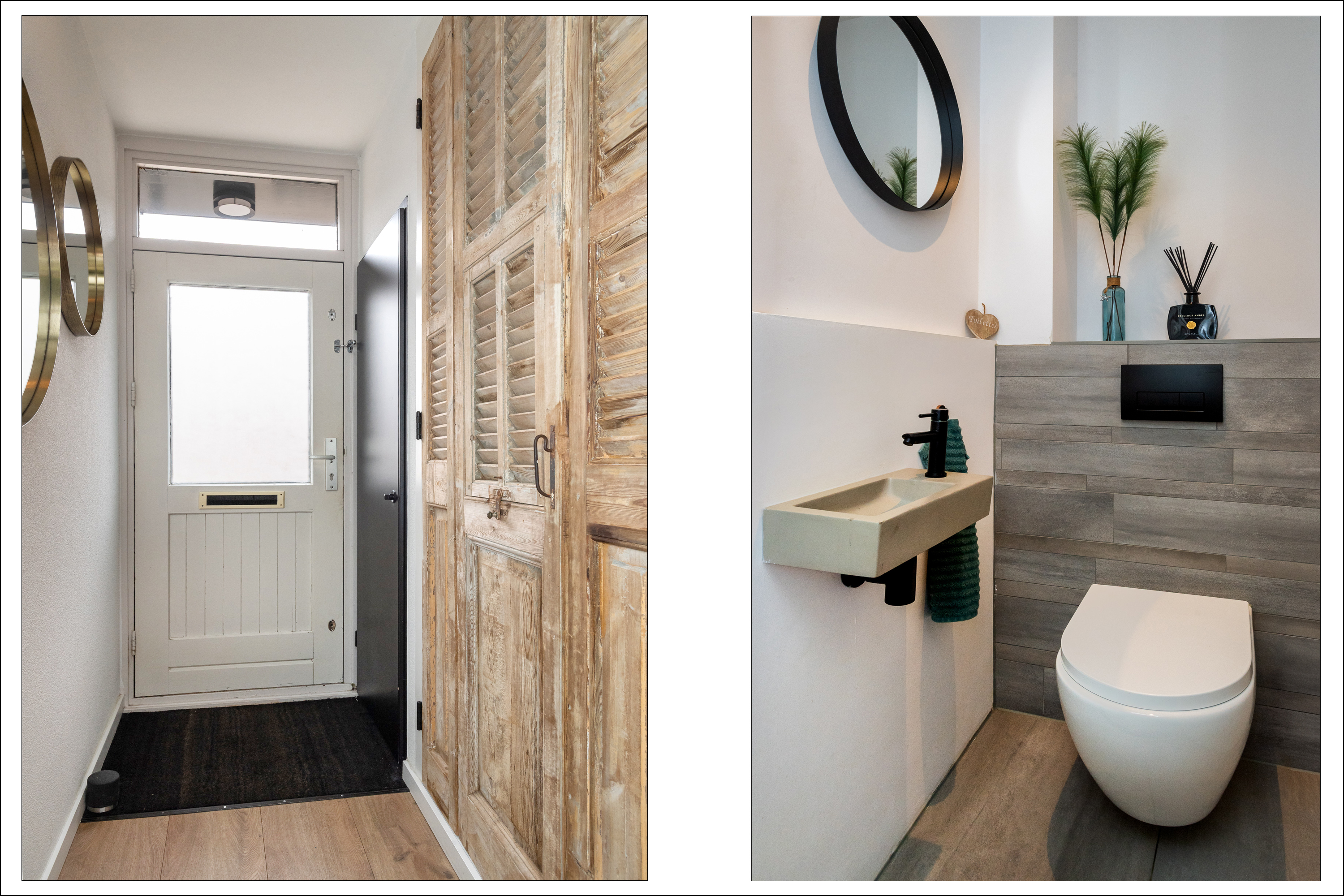 Via de woonkamer is er toegang tot een tussenhal met de trapopgang naar de eerste verdieping en toegang tot het toilet. Moderne toiletruimte met zwevend toilet en fonteintje.