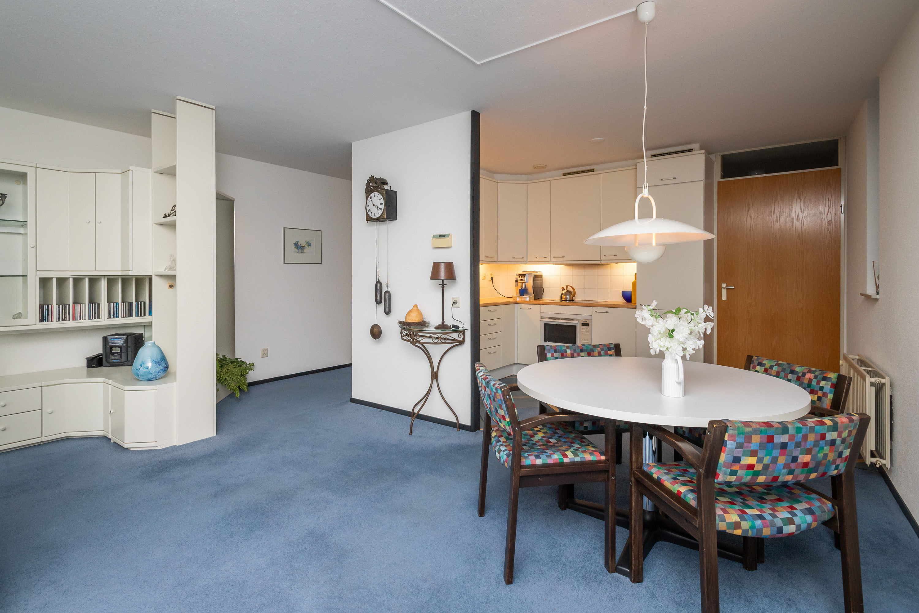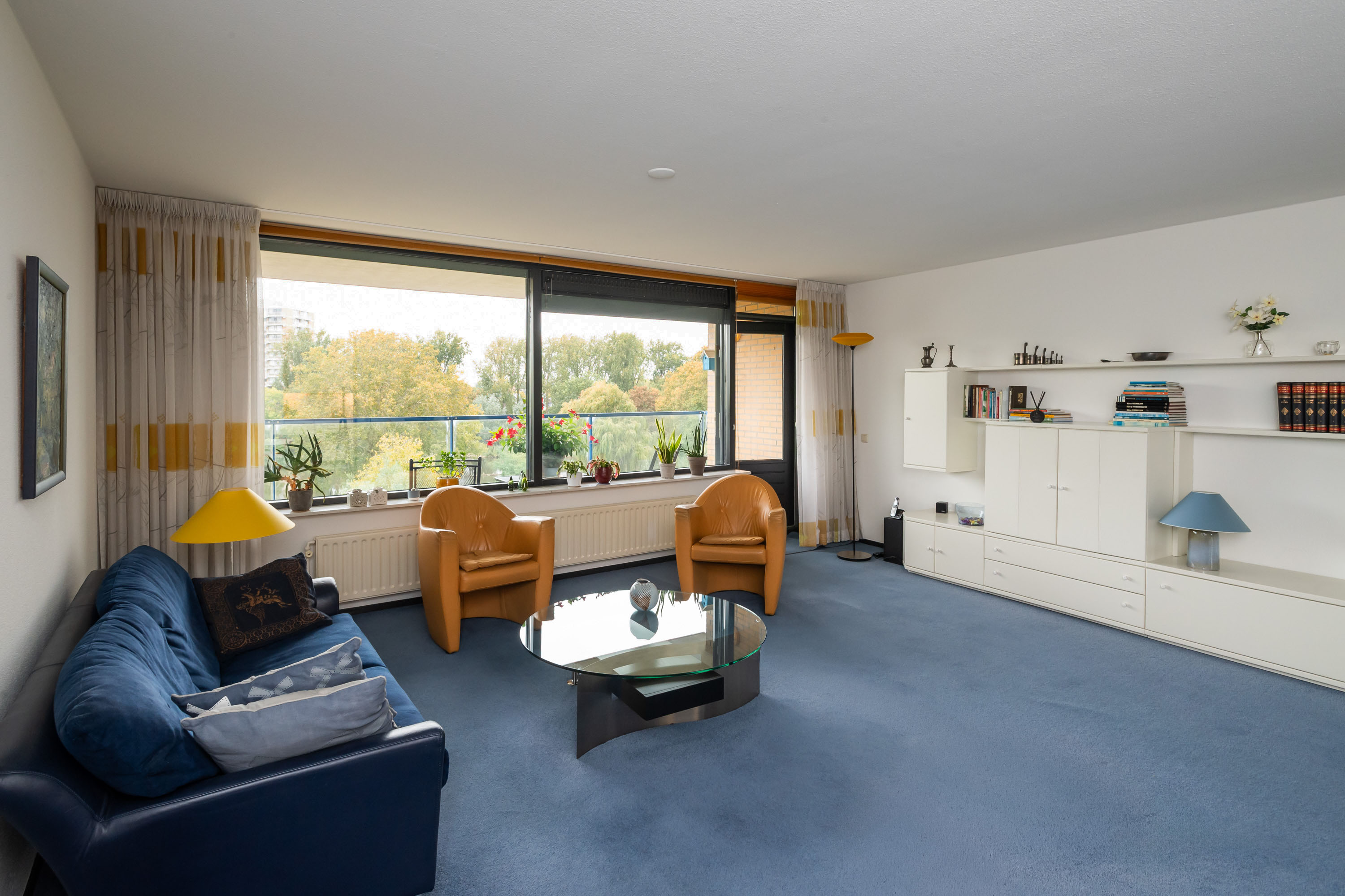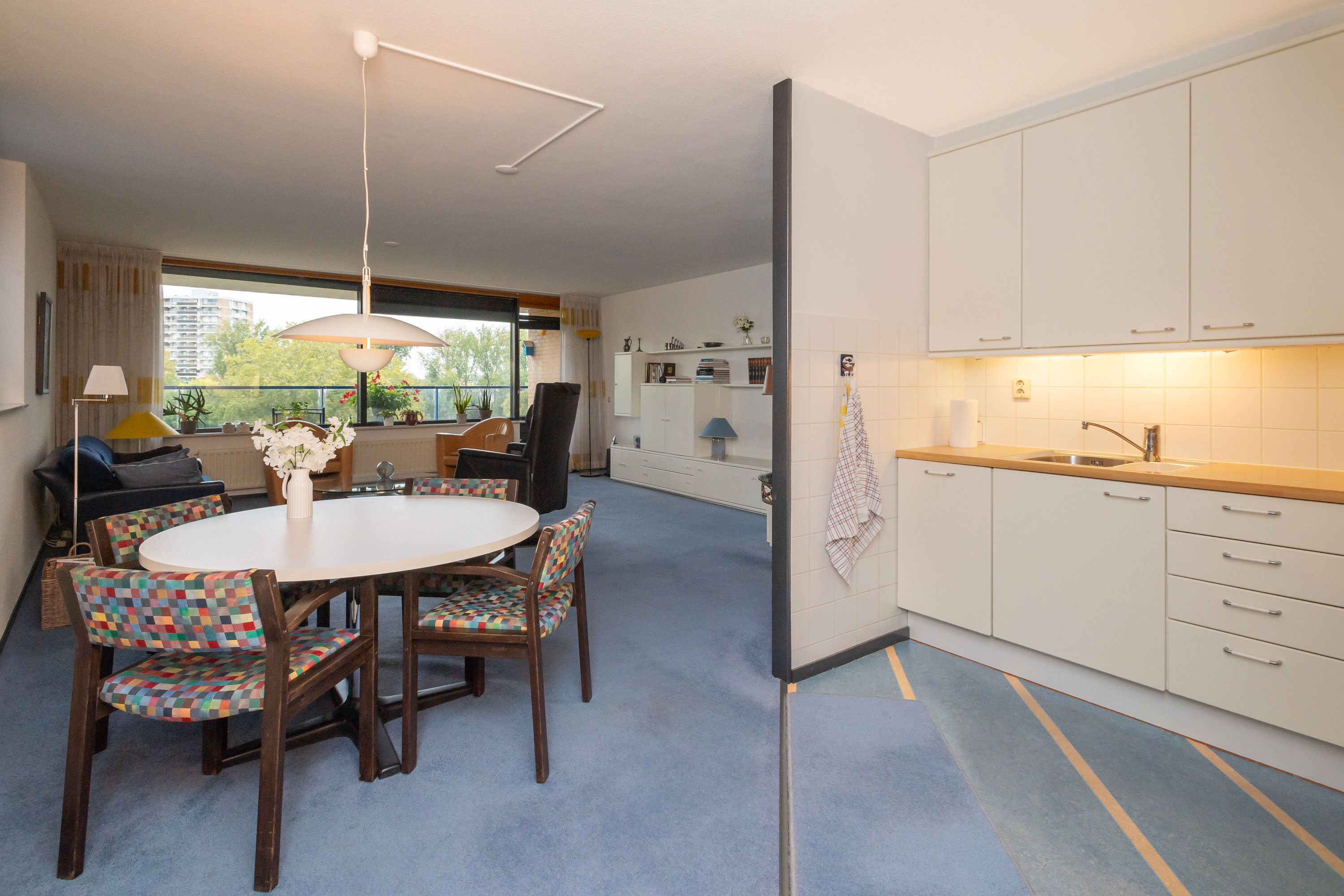 Via de gang bereikt u de gezellige en lichte woonkamer met elektrisch bedienbare screens, een zijraam en toegang tot het ruime balkon op het Westen. Hier kunt u genieten van het vrije uitzicht op het park!