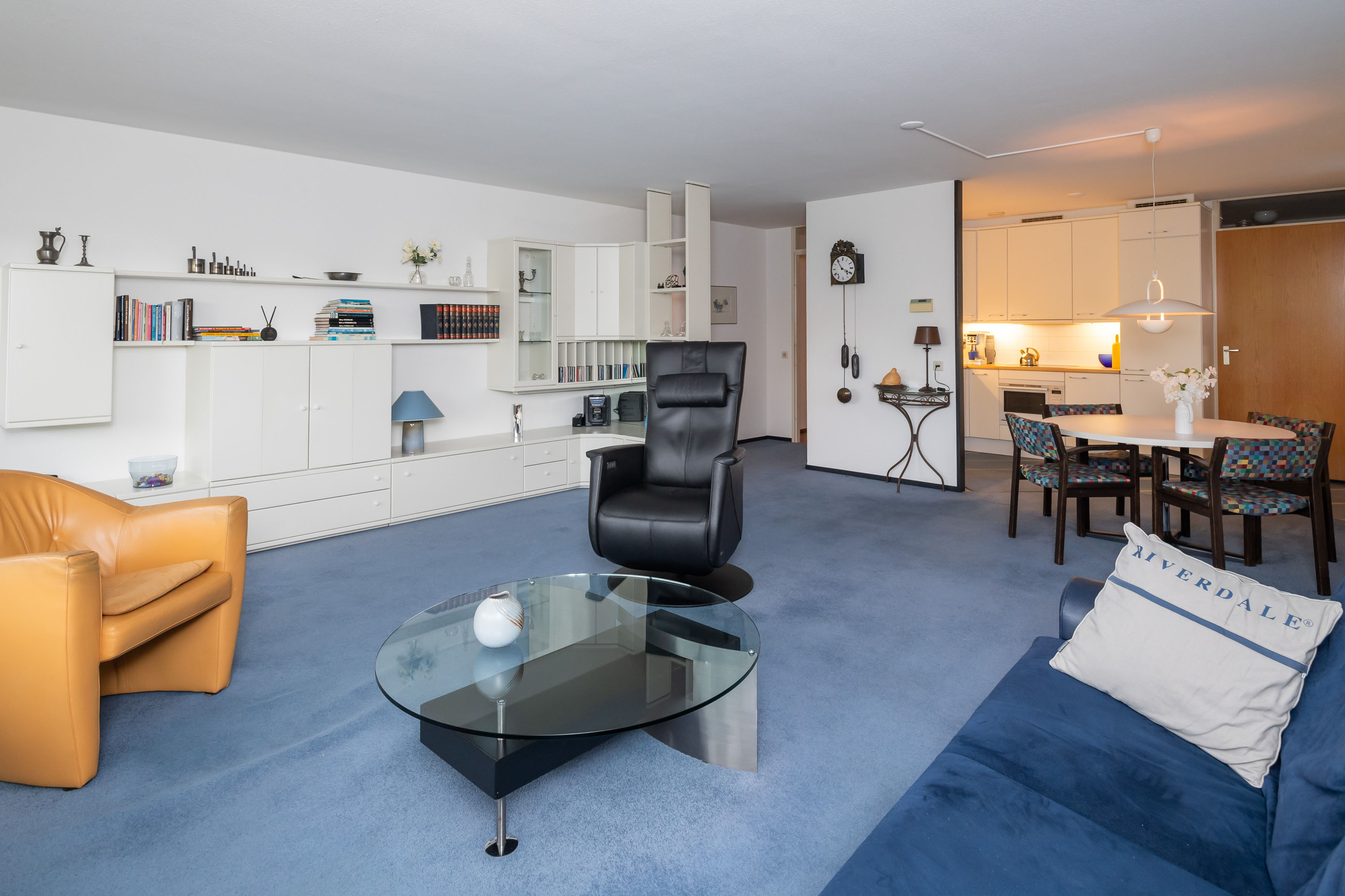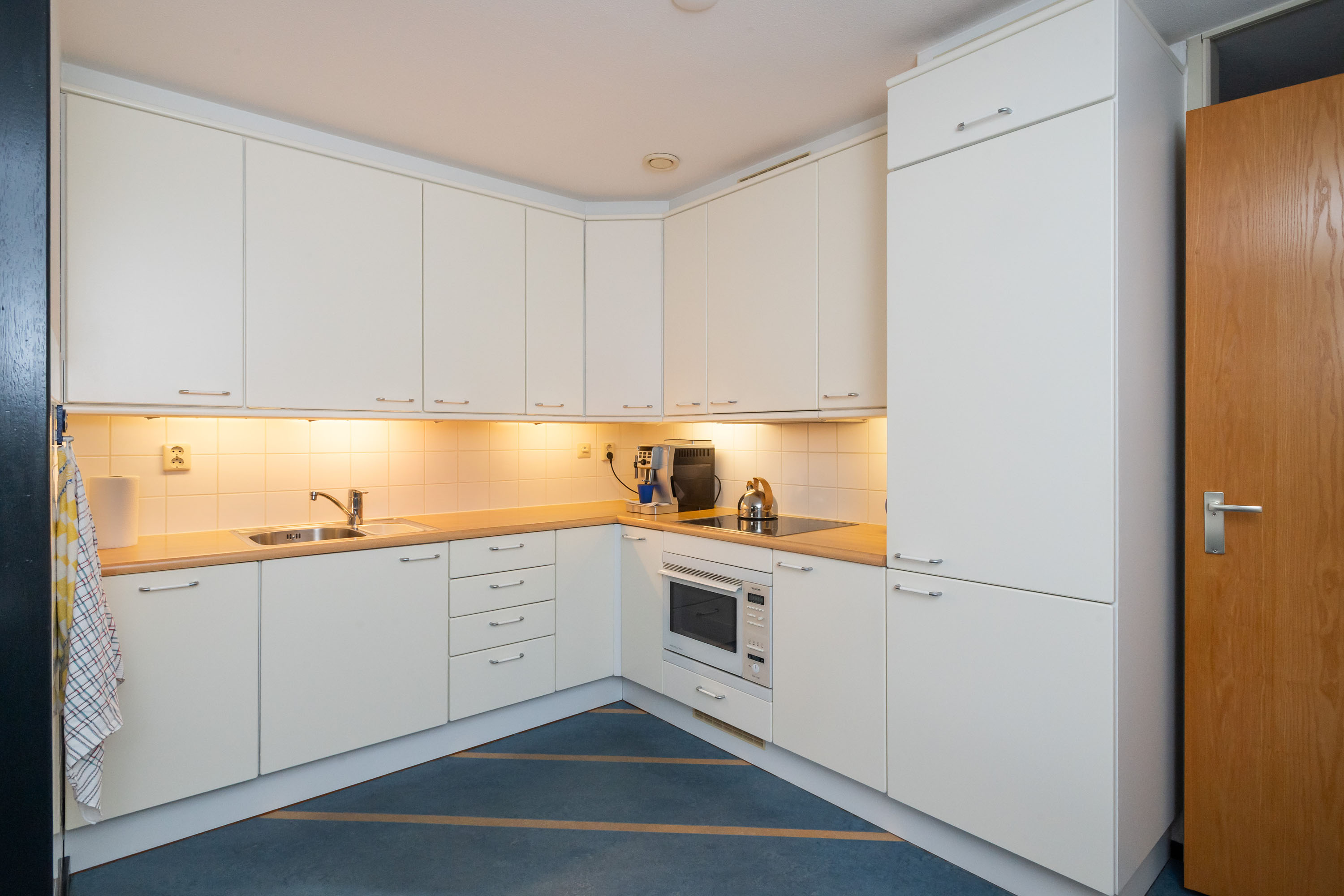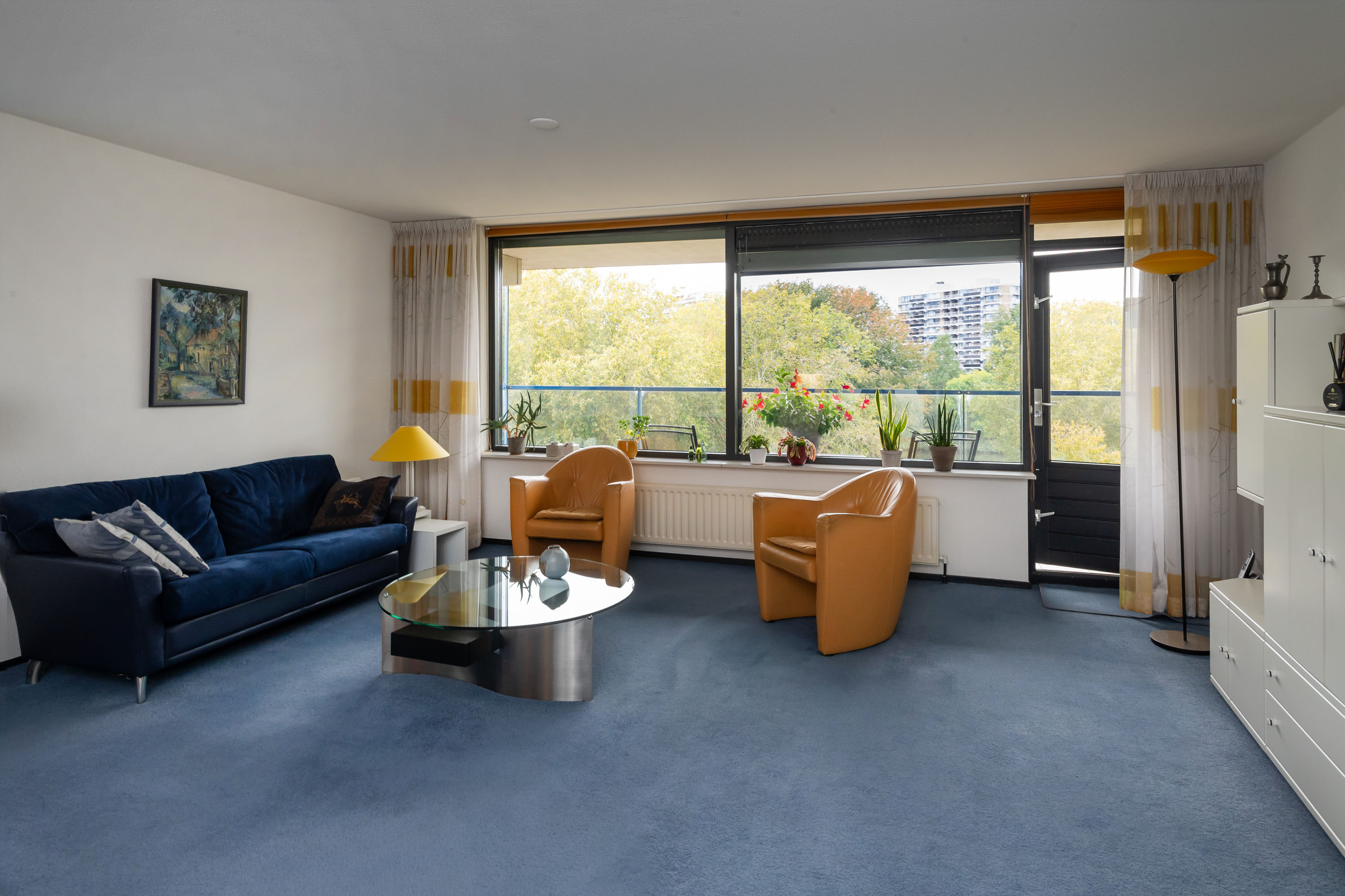 Via de gang bereikt u de gezellige en lichte woonkamer met elektrisch bedienbare screens, een zijraam en toegang tot het ruime balkon op het Westen. Hier kunt u genieten van het vrije uitzicht op het park!