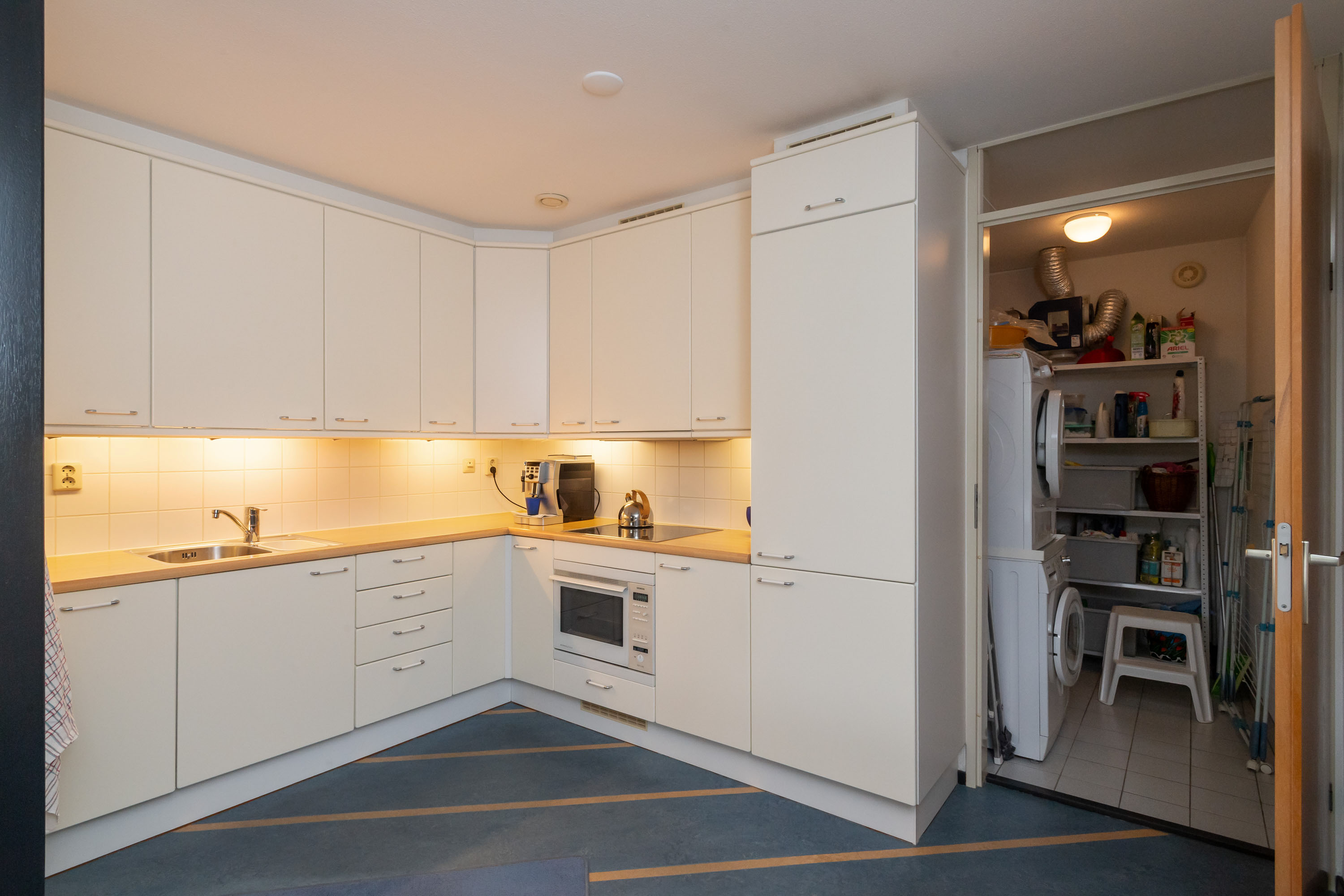 Open keuken met lichtinval via een 2e zijraam en een hoekopstelling welke is voorzien van inbouwapparatuur waaronder een inductiekookplaat, afzuigkap en combi-oven. Vanuit de keuken is er een deur naar een bijkeuken/wasruimte met opstelplaats van de CV- combiketel (2022) en mechanische ventilatiebox.