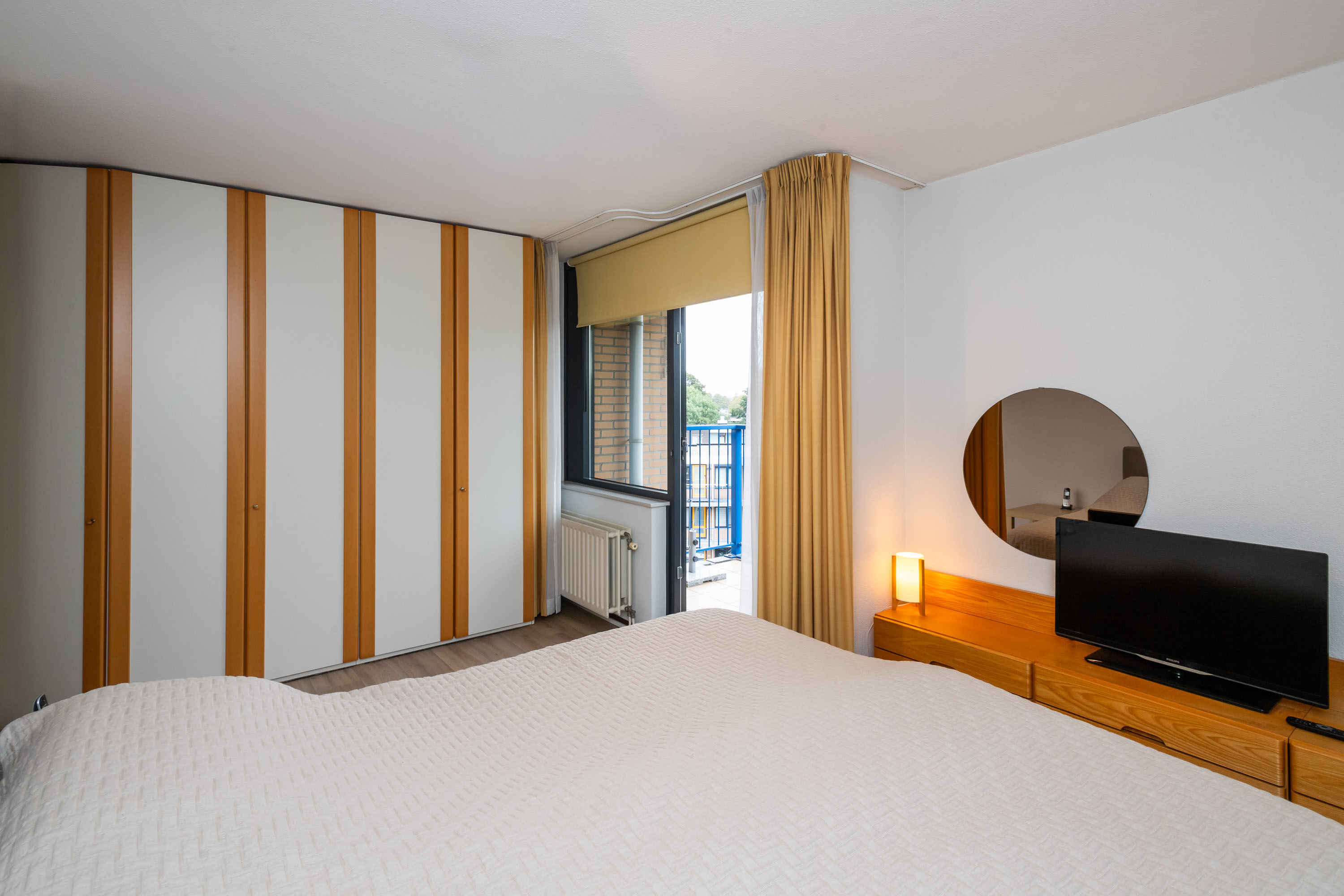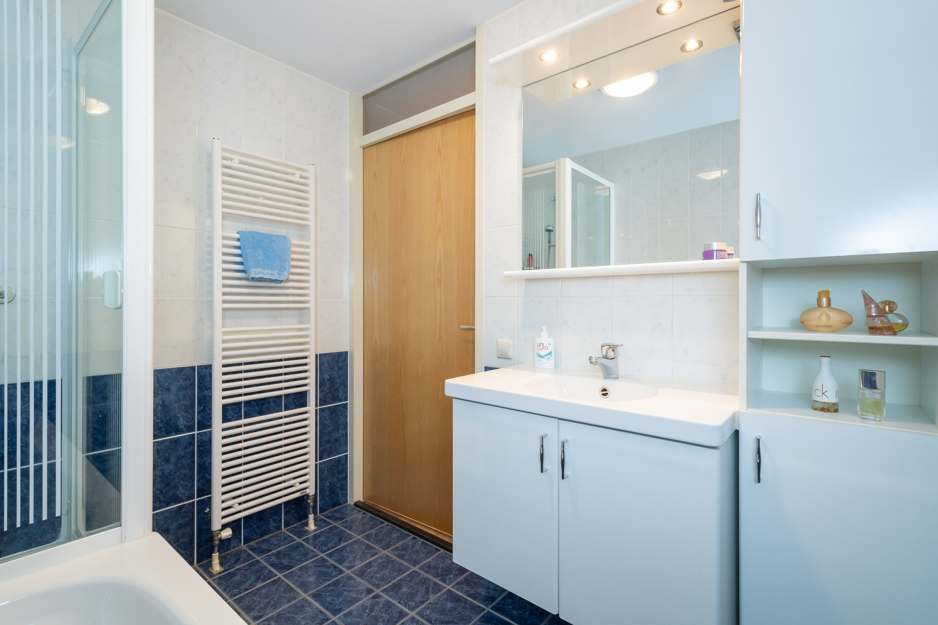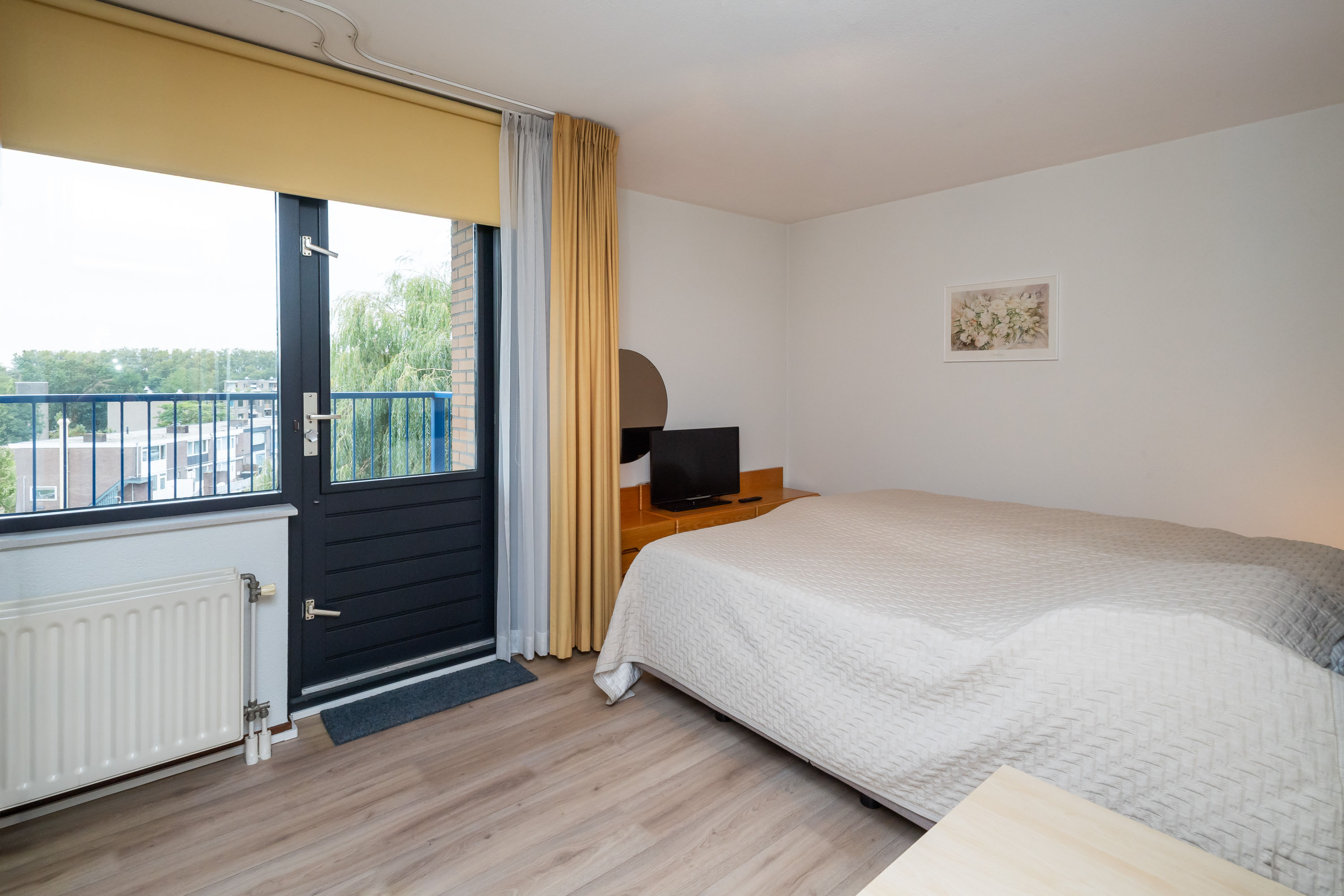 Geheel betegelde badkamer met ligbad, douchecabine met thermostaatkraan, handdoekenradiator en wastafel met wastafelmeubel, spiegel en inbouwspots. Ruime ouderslaapkamer met toegang tot het 2e balkon op het Oosten. Verder bereikt u vanuit de gang een 2e en 3e slaap-/werkkamer waarvan 1 met een ideale vaste schuifkastenwand.
