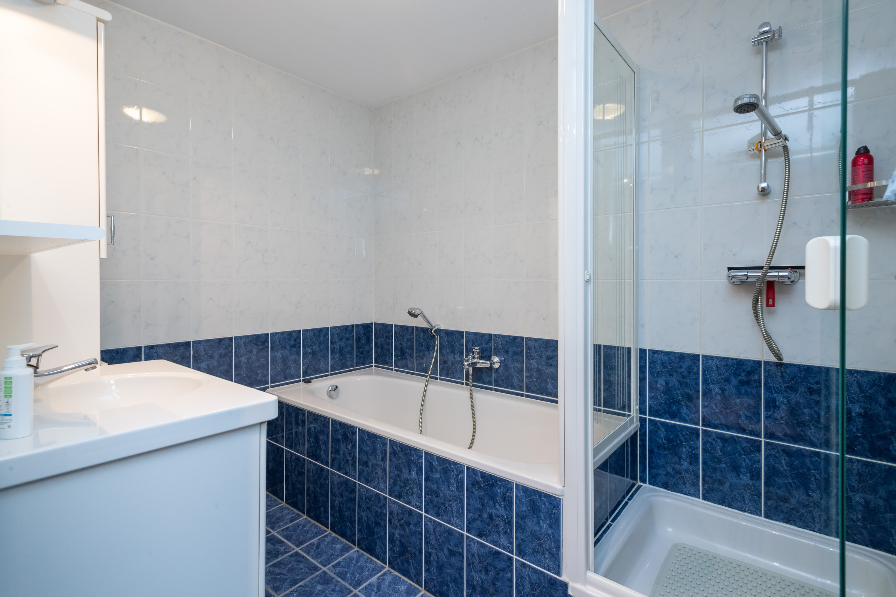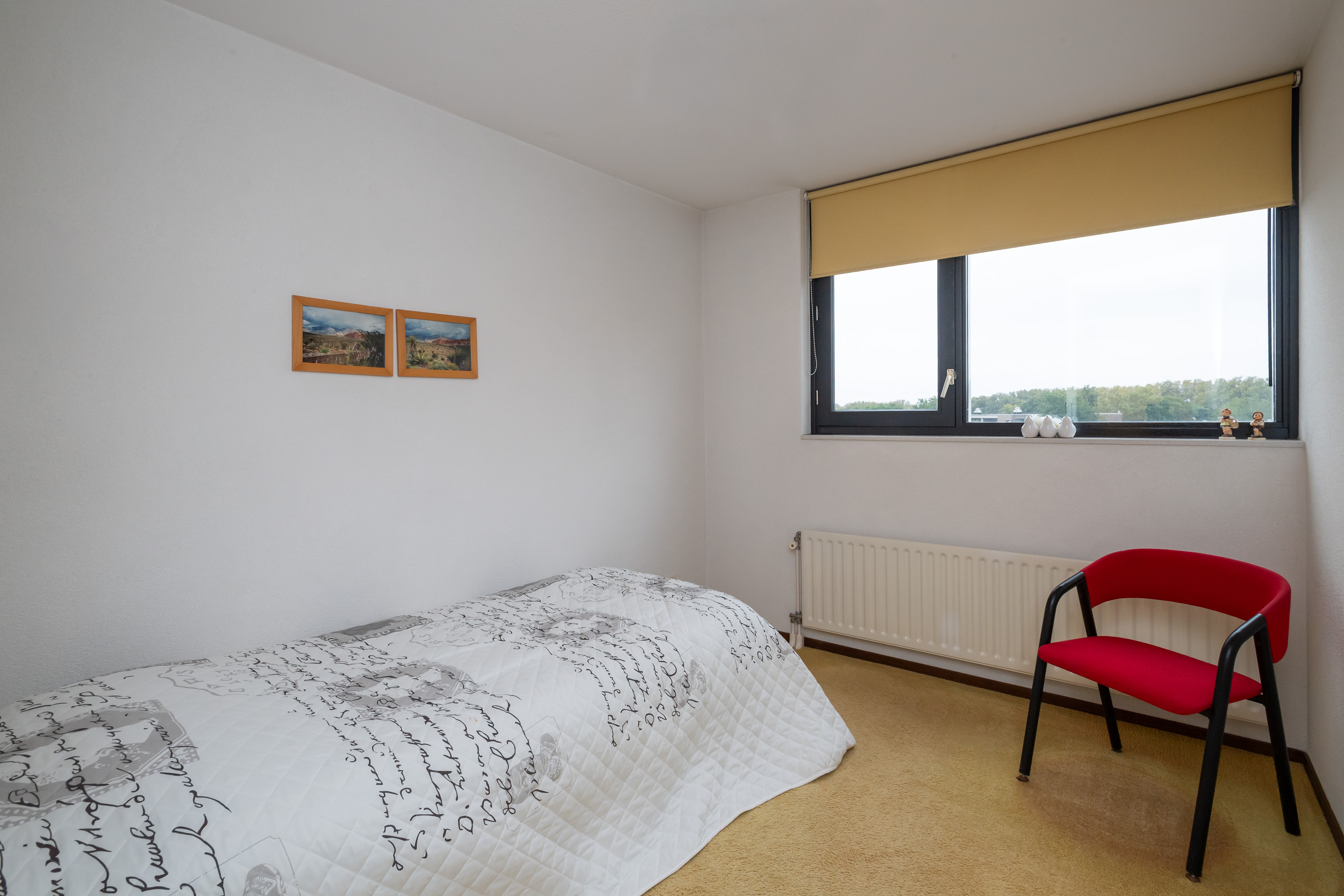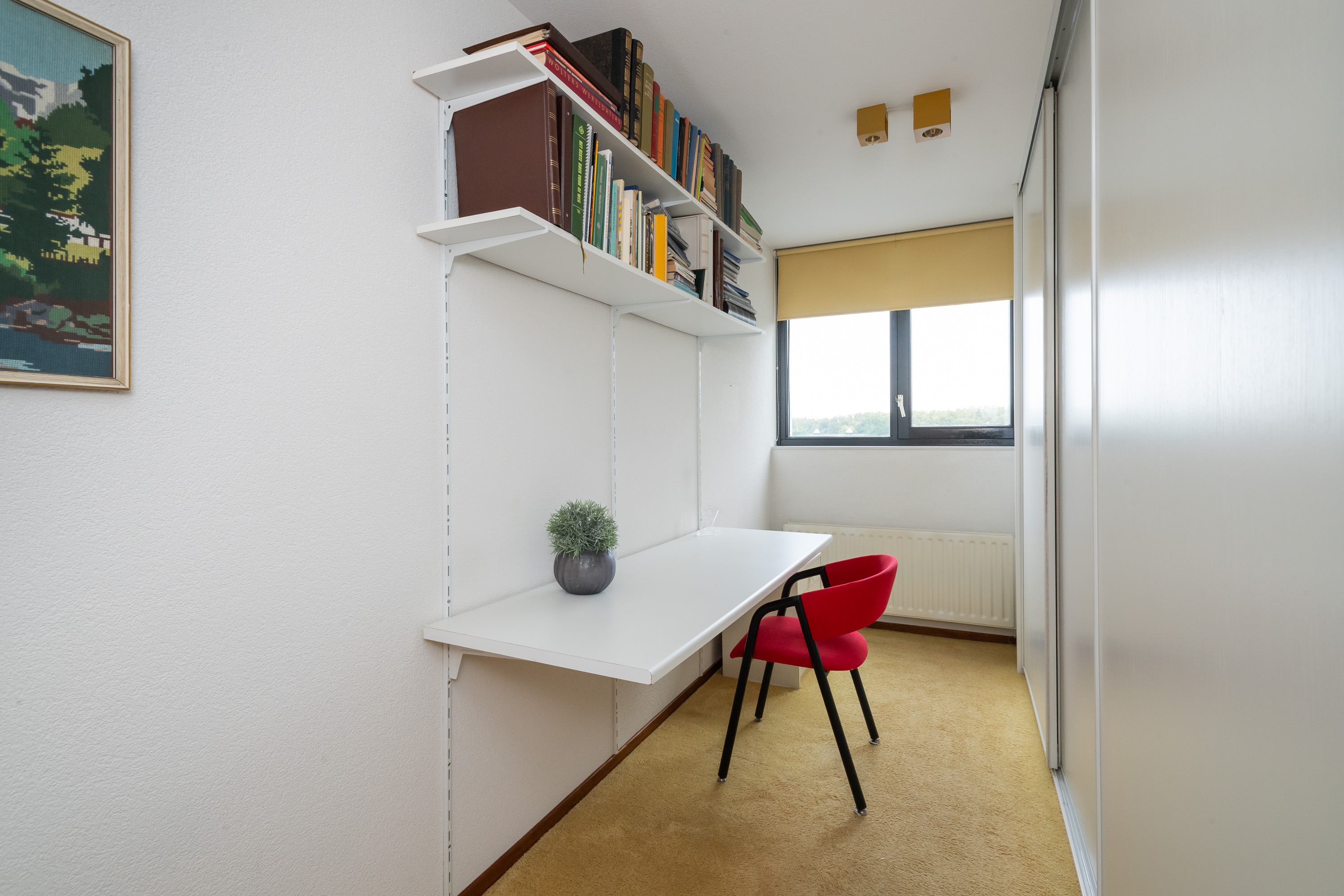 Geheel betegelde badkamer met ligbad, douchecabine met thermostaatkraan, handdoekenradiator en wastafel met wastafelmeubel, spiegel en inbouwspots. Ruime ouderslaapkamer met toegang tot het 2e balkon op het Oosten. Verder bereikt u vanuit de gang een 2e en 3e slaap-/werkkamer waarvan 1 met een ideale vaste schuifkastenwand.