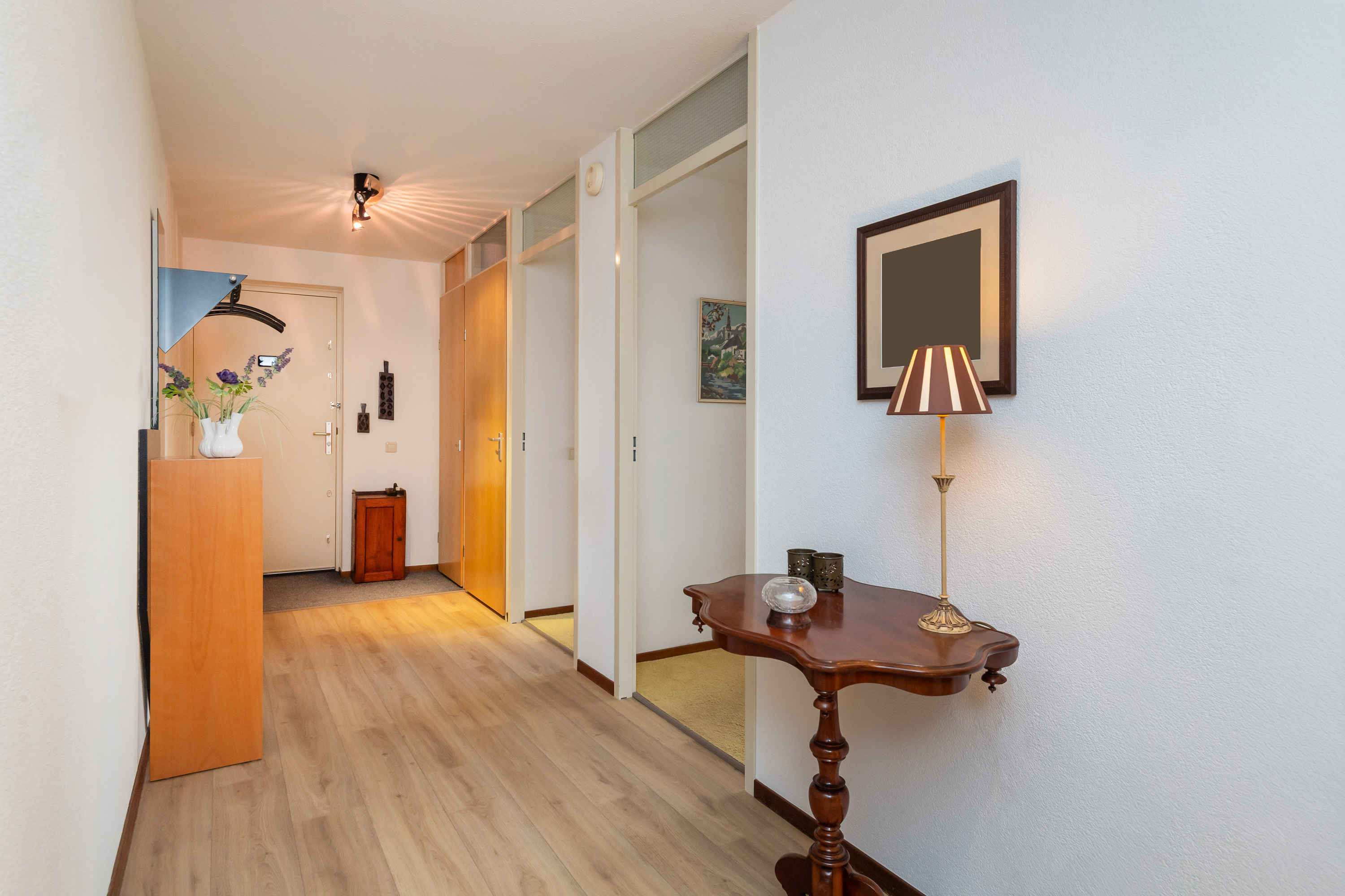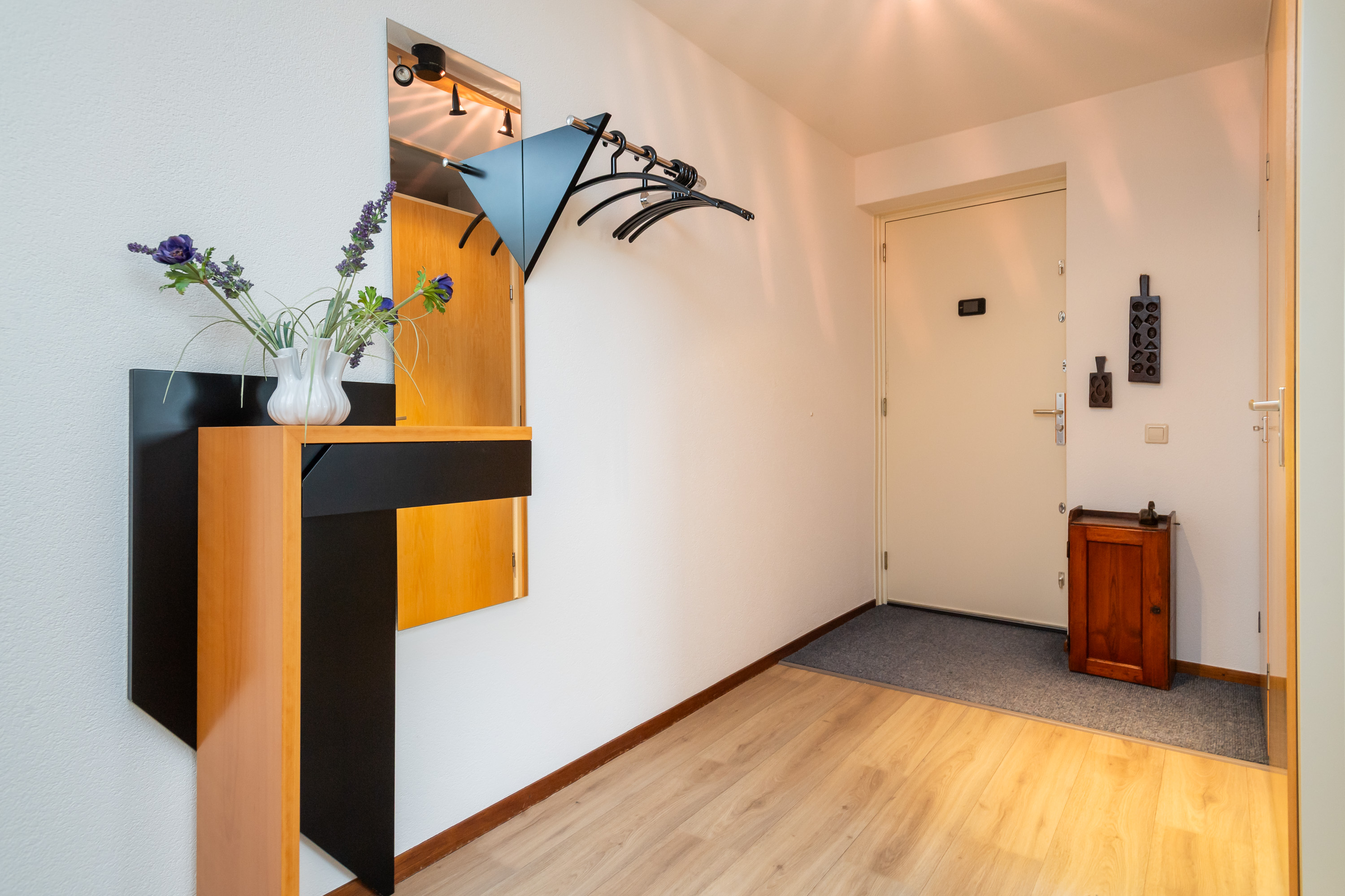 Entree met meterkast en toegang tot alle vertrekken in het appartement. Geheel betegelde toiletruimte met fonteintje.
