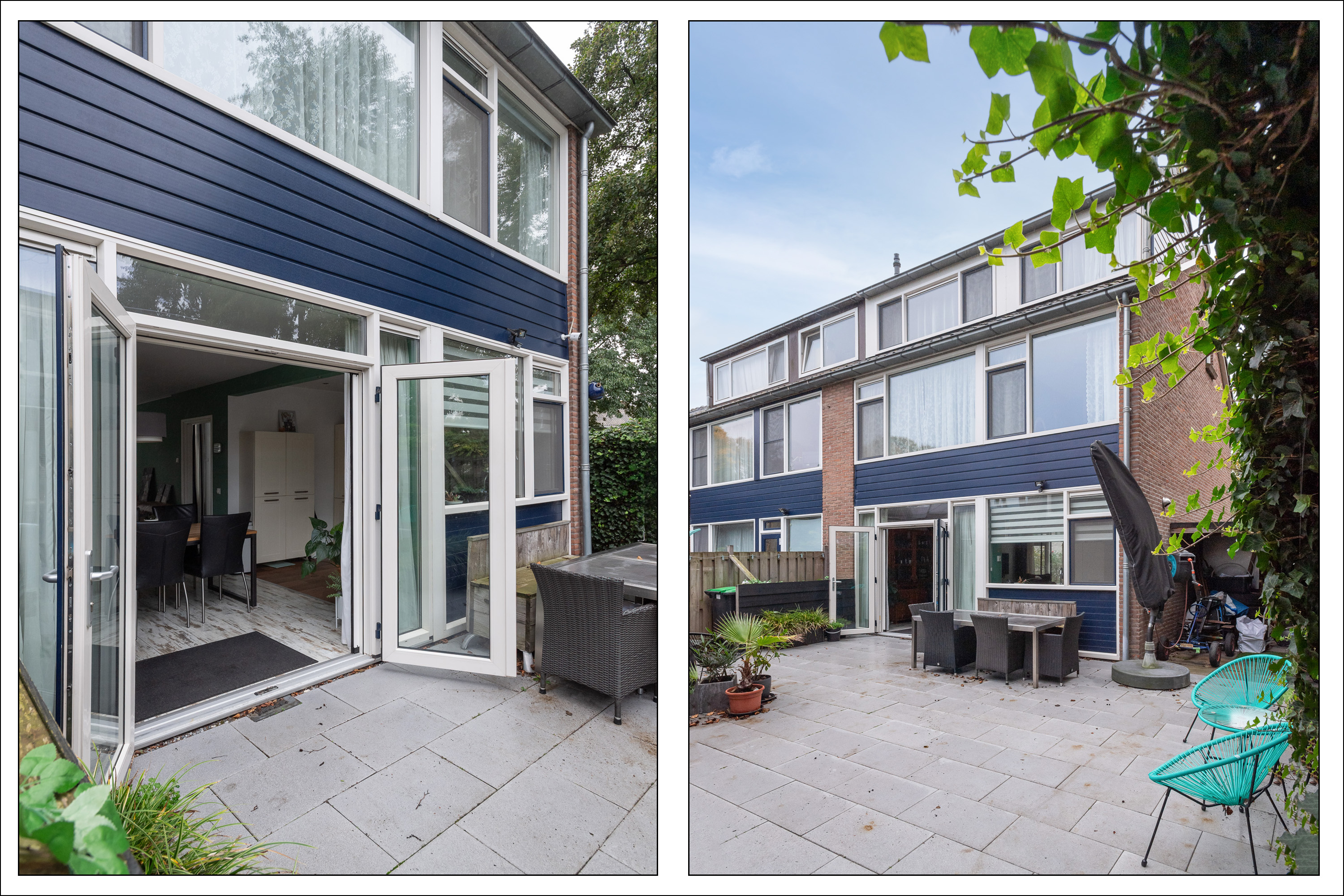 Electrische zonnescherm aan de voorzijde van de woning en aan het bijgebouw.