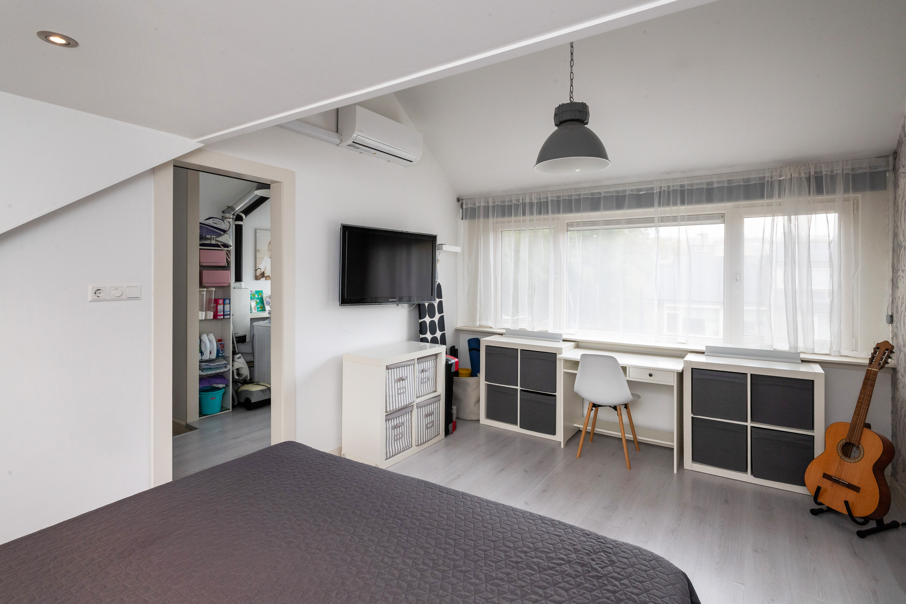 Voorzolder met nokverhoging, de opstelplaats van de CV-combiketel en de wasmachine aansluiting. Schuifdeur naar een ruime 4e slaapkamer met elektrisch bedienbare rolluikten, een nokverhoging en airco/warme lucht.