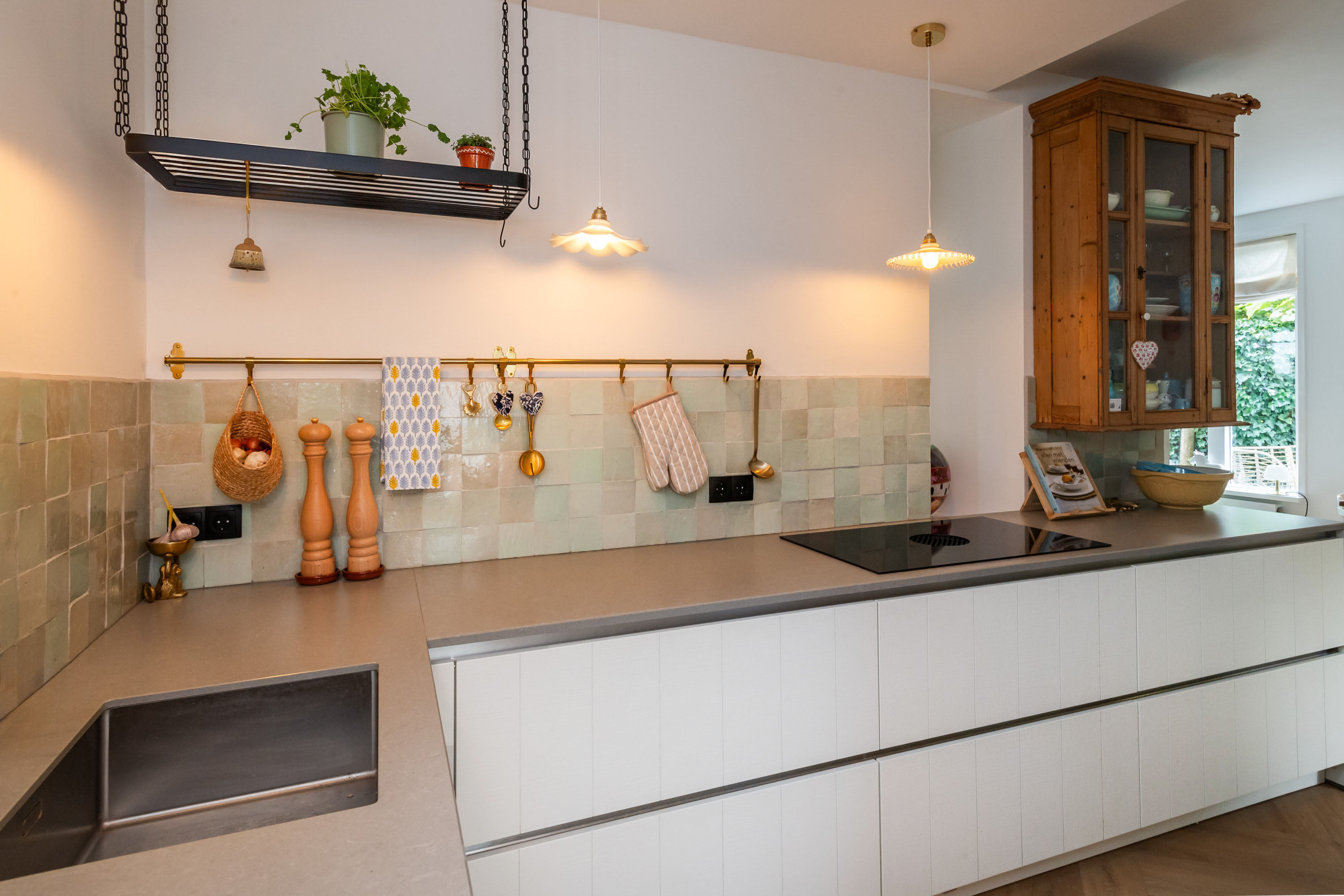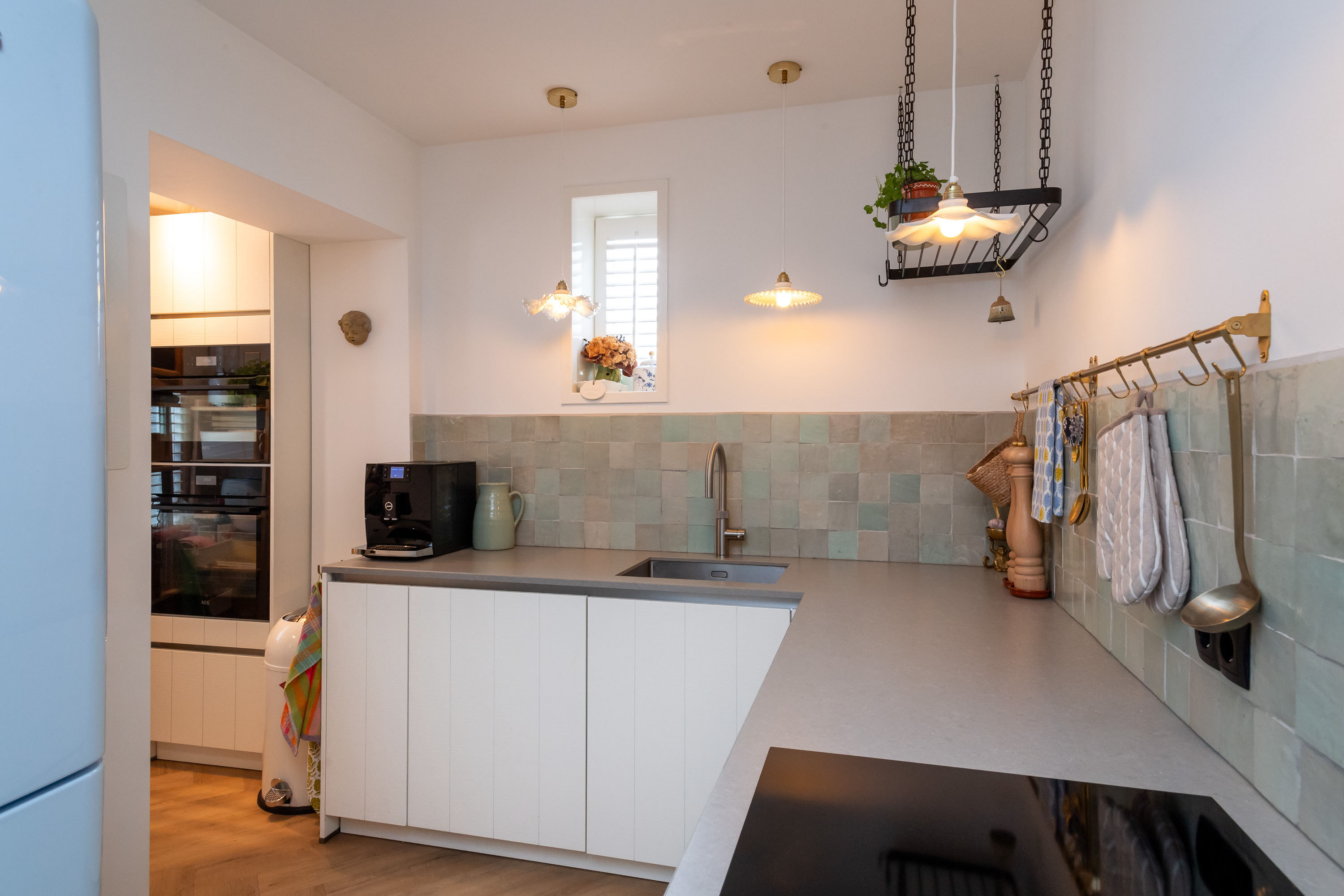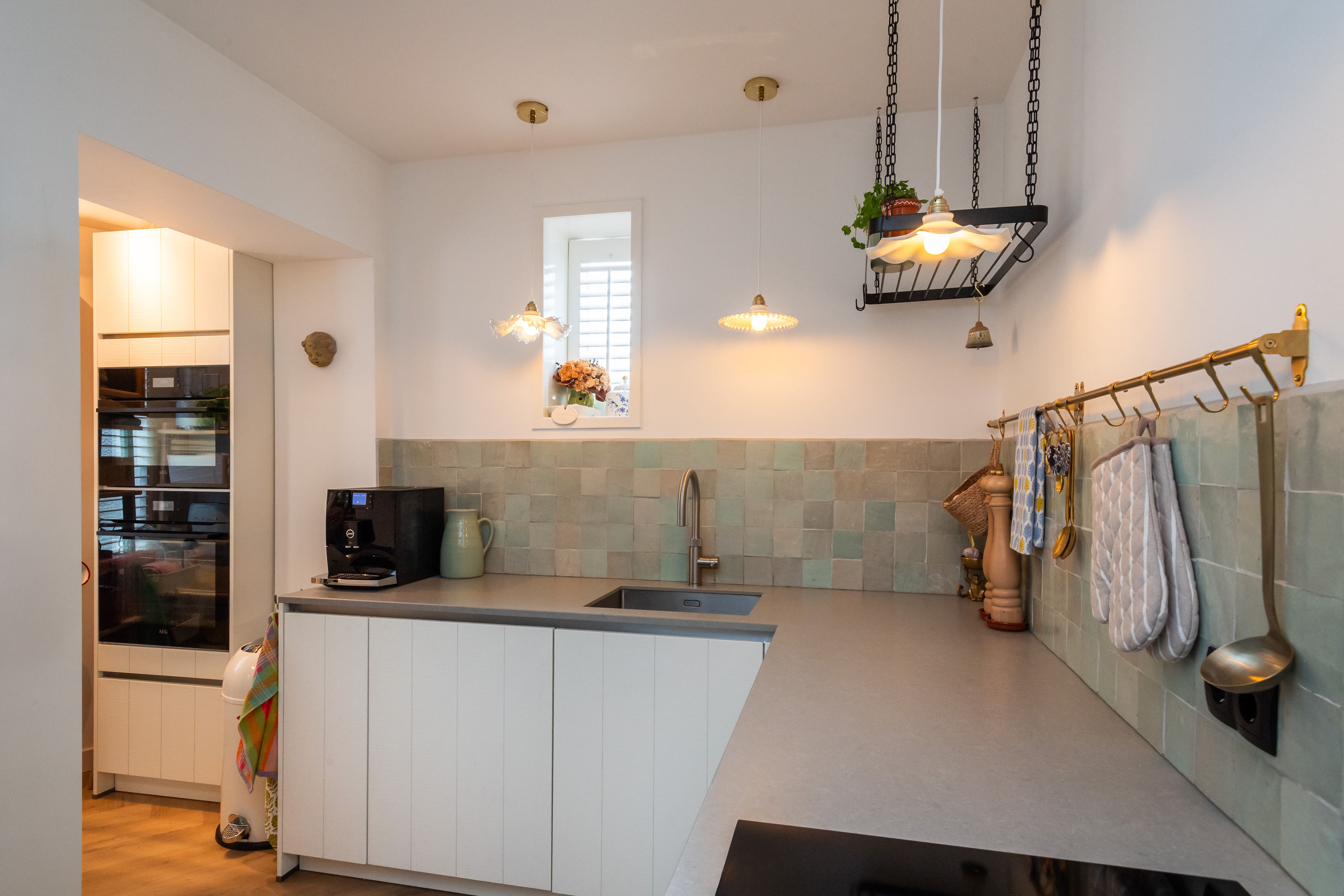 Open keuken met luxe hoekopstelling (2022) met composiet blad en inbouwapparatuur.