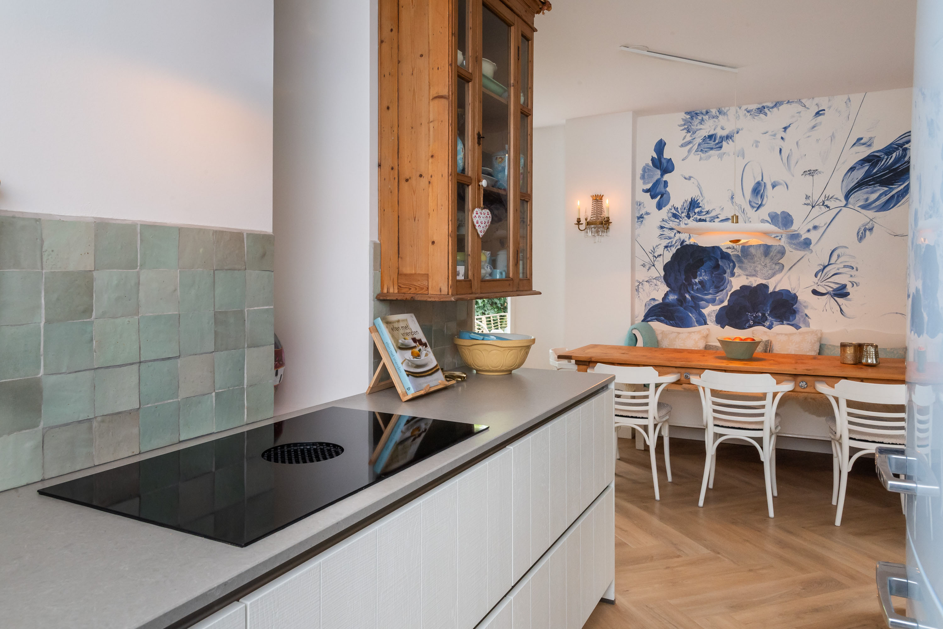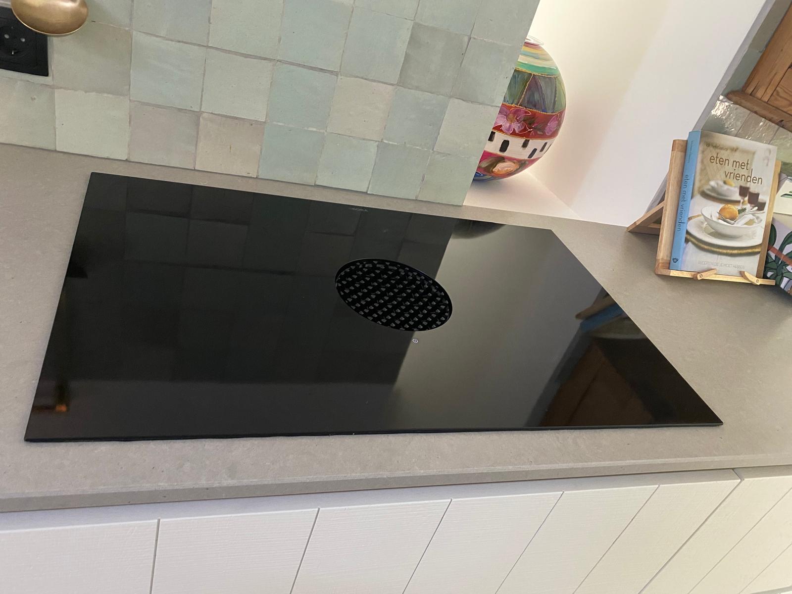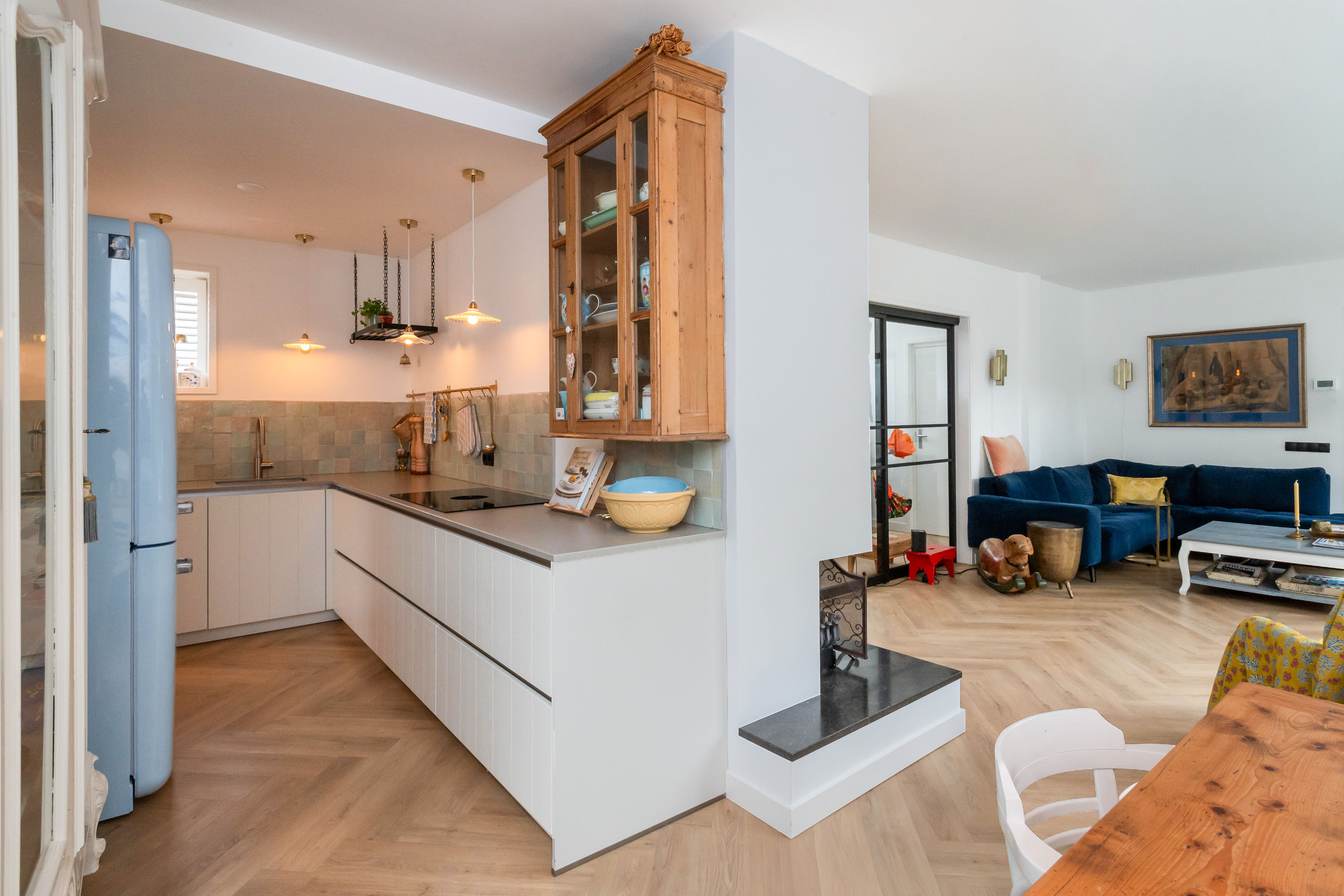Open keuken met luxe hoekopstelling (2022) met composiet blad en inbouwapparatuur.